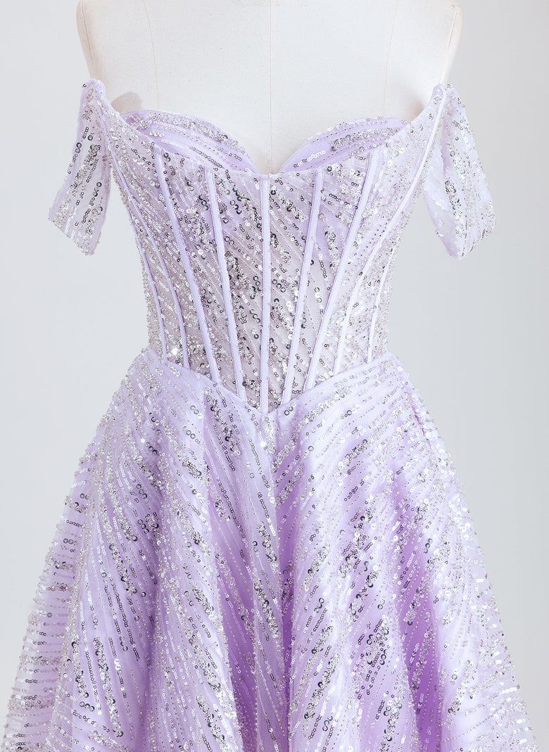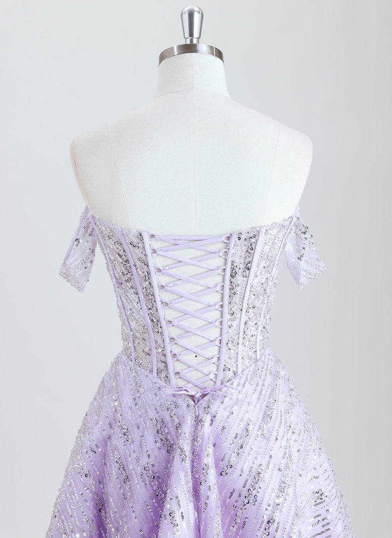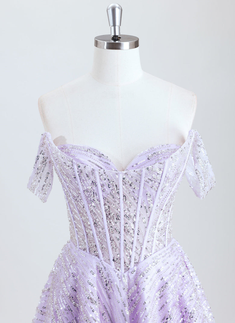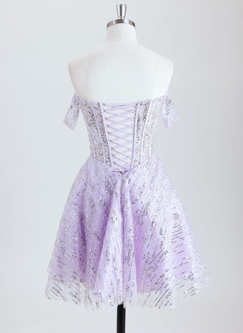This A-line homecoming dress showcases an off-the-shoulder neckline paired with a short, flattering silhouette. Crafted with sequins throughout, it delivers a sophisticated shimmer that catches the light with every movement. The design balances timeless elegance and contemporary style, making it an ideal choice for a standout look at your special event.