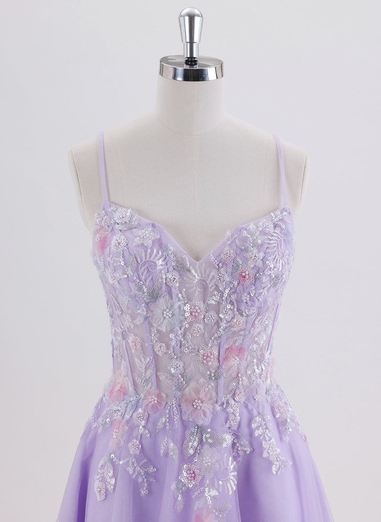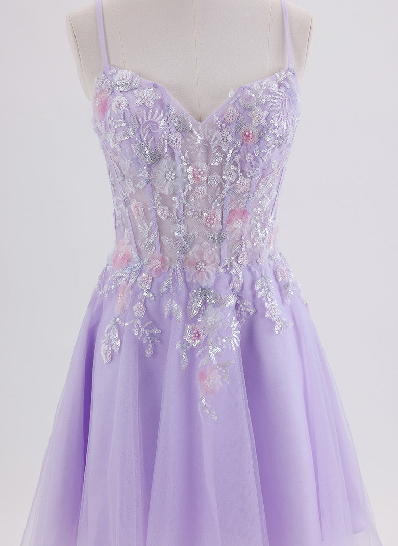 This A-line short homecoming dress features delicate tulle fabric adorned with shimmering sequins and intricate beading, creating an elegant sparkle. The V-neckline and slender spaghetti straps offer a flattering silhouette, combining sophistication with youthful charm. Perfect for making a memorable entrance at any special occasion.