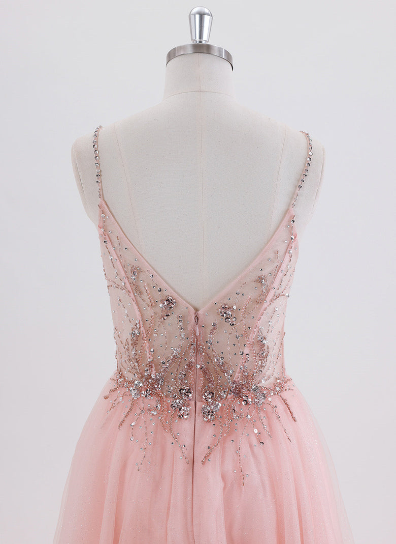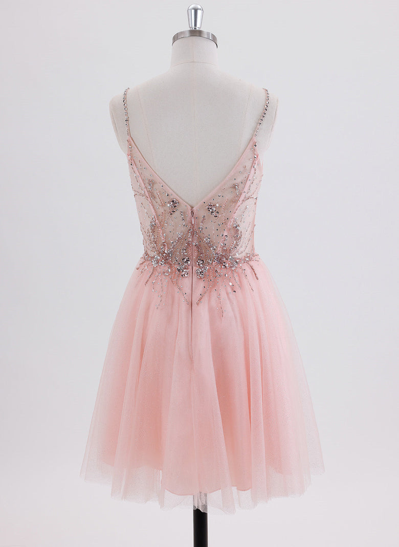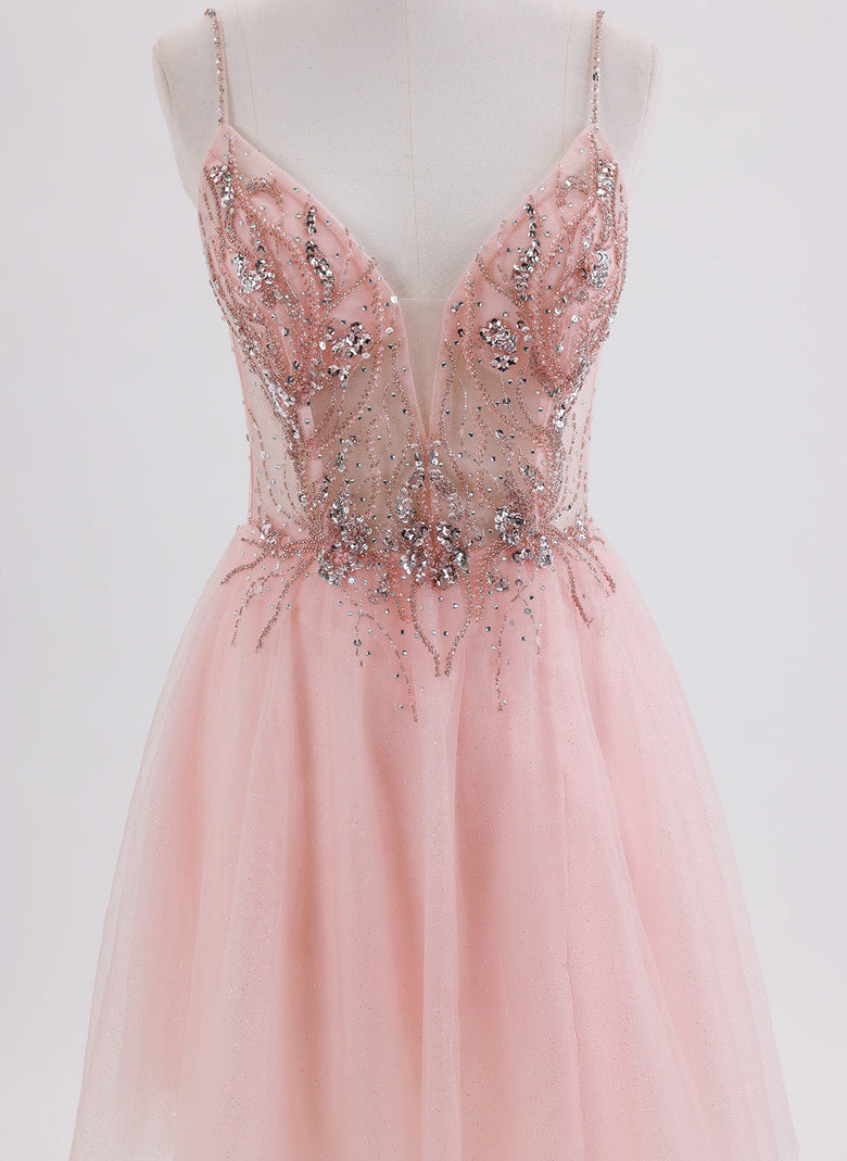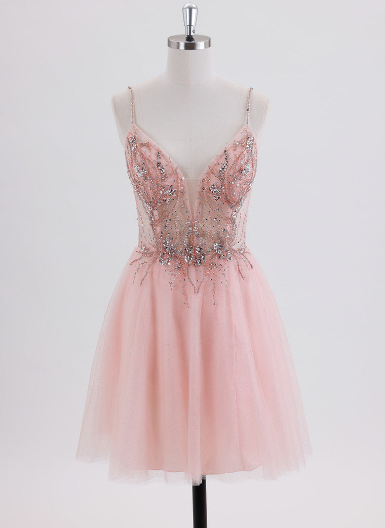 This A-line short homecoming dress features delicate tulle fabric adorned with shimmering sequins and intricate beading, creating a radiant, eye-catching look. The spaghetti straps add a touch of elegance while ensuring comfort and ease of movement. Perfect for making a memorable entrance, this dress combines classic silhouette with sparkling details to highlight your style at any special occasion.