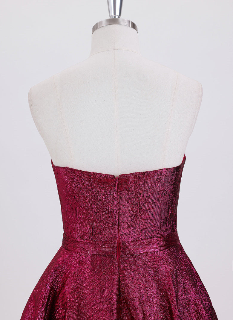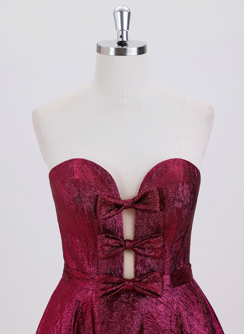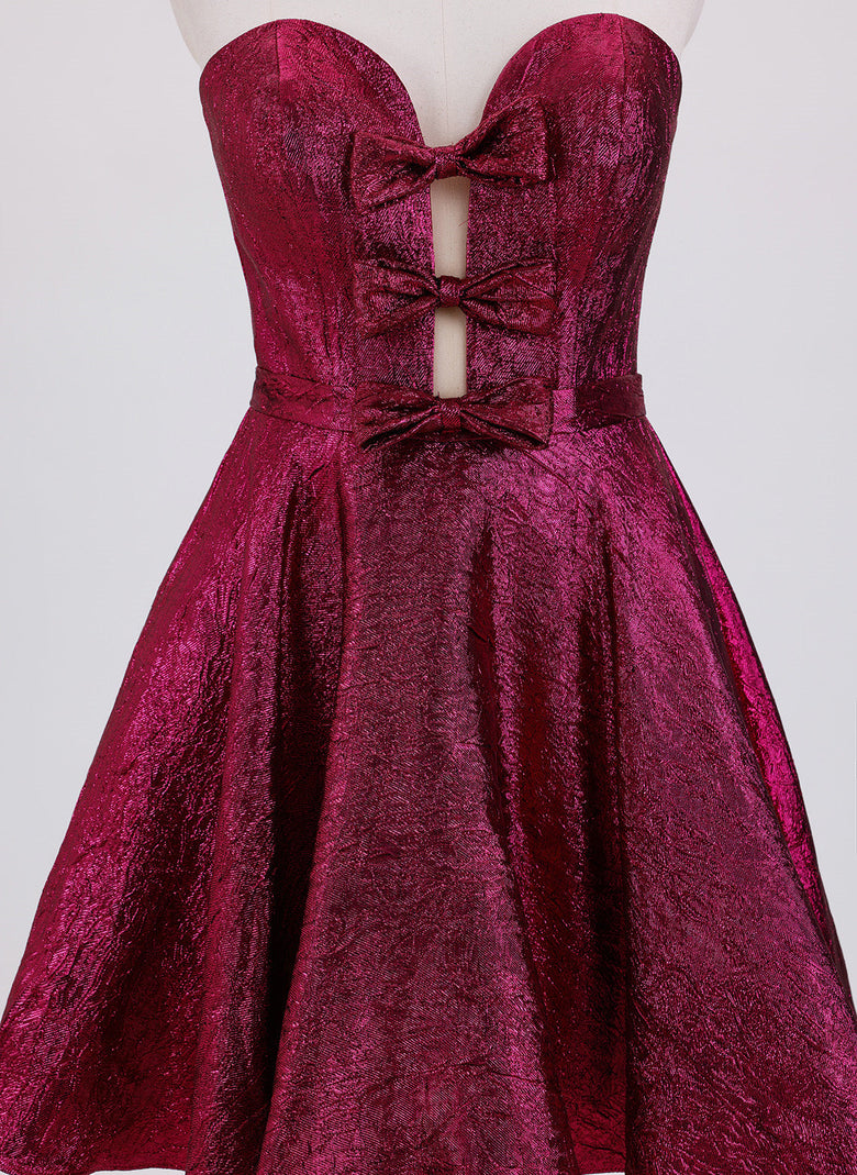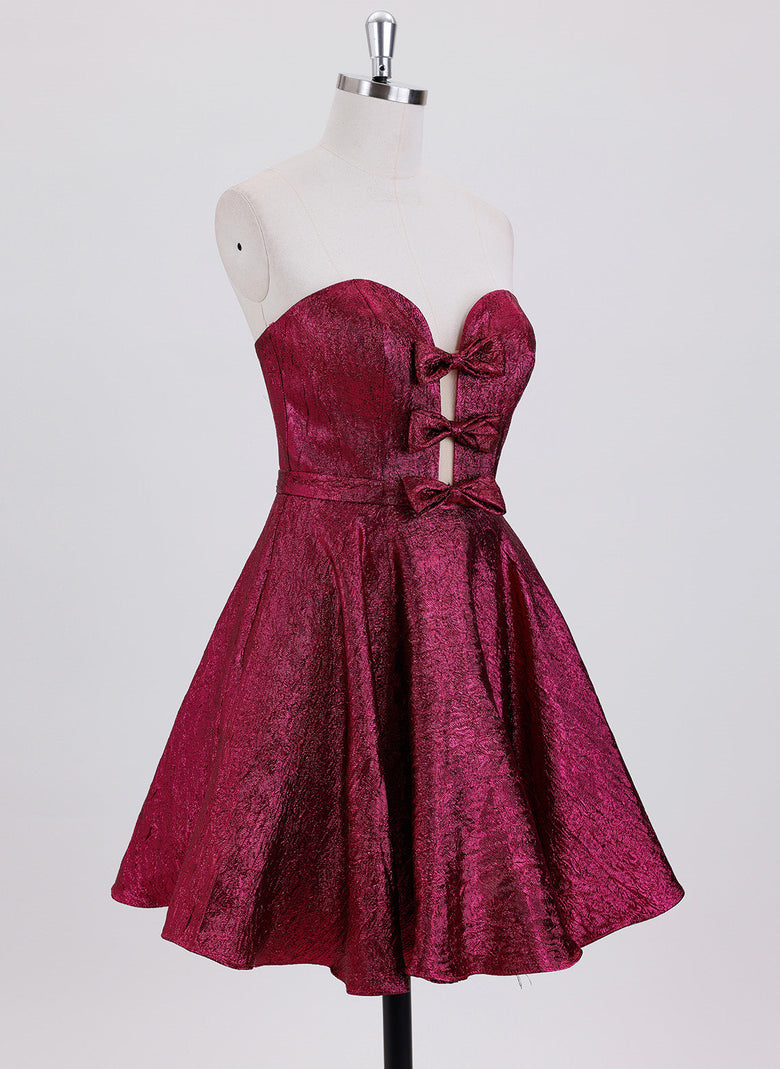 This A-line sleeveless homecoming dress features a shimmering metallic fabric that catches the light beautifully. Its short length offers a youthful, elegant silhouette, while the front bow adds a charming focal point. Designed for comfort and style, this dress is perfect for making a memorable impression at any special event.