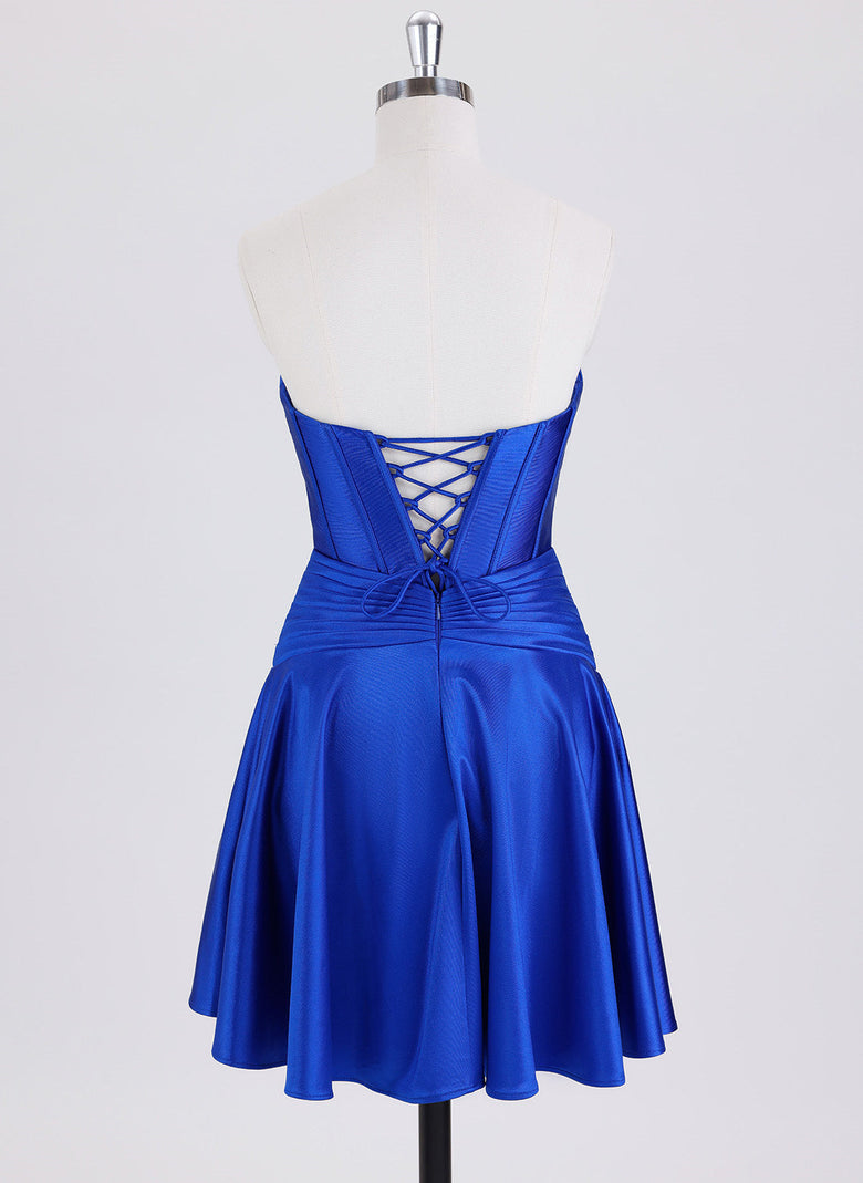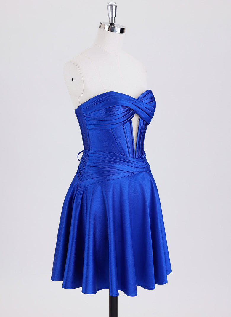 This A-line sleeveless homecoming dress features a luxurious satin fabric that drapes elegantly for a flattering silhouette. The pleated detailing adds texture and sophistication, while the crossed back design enhances support and style. A tasteful cut-out front provides a modern, eye-catching element, making this short dress perfect for memorable occasions.