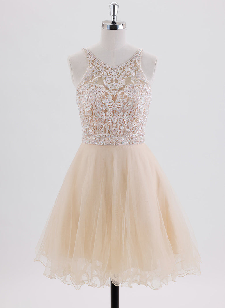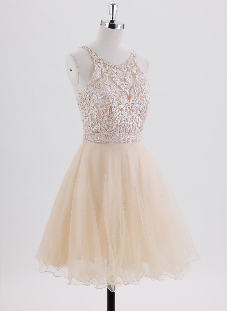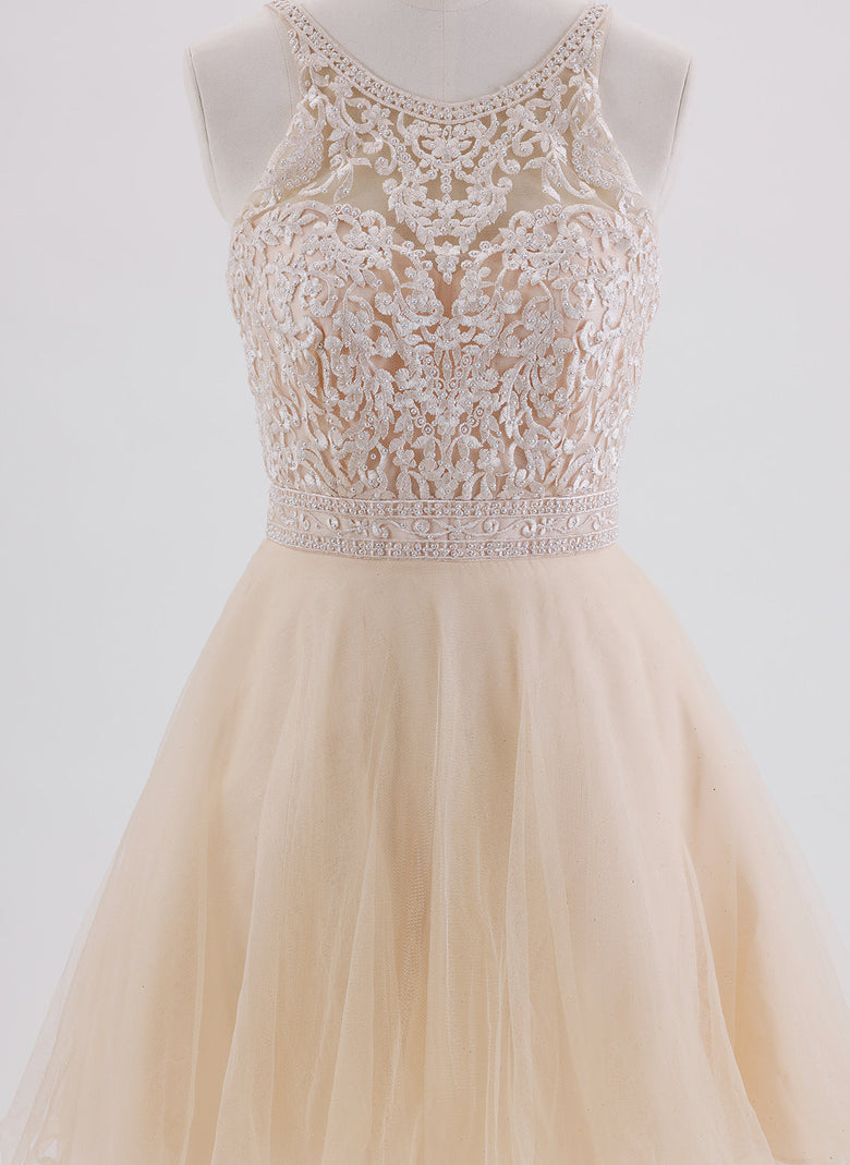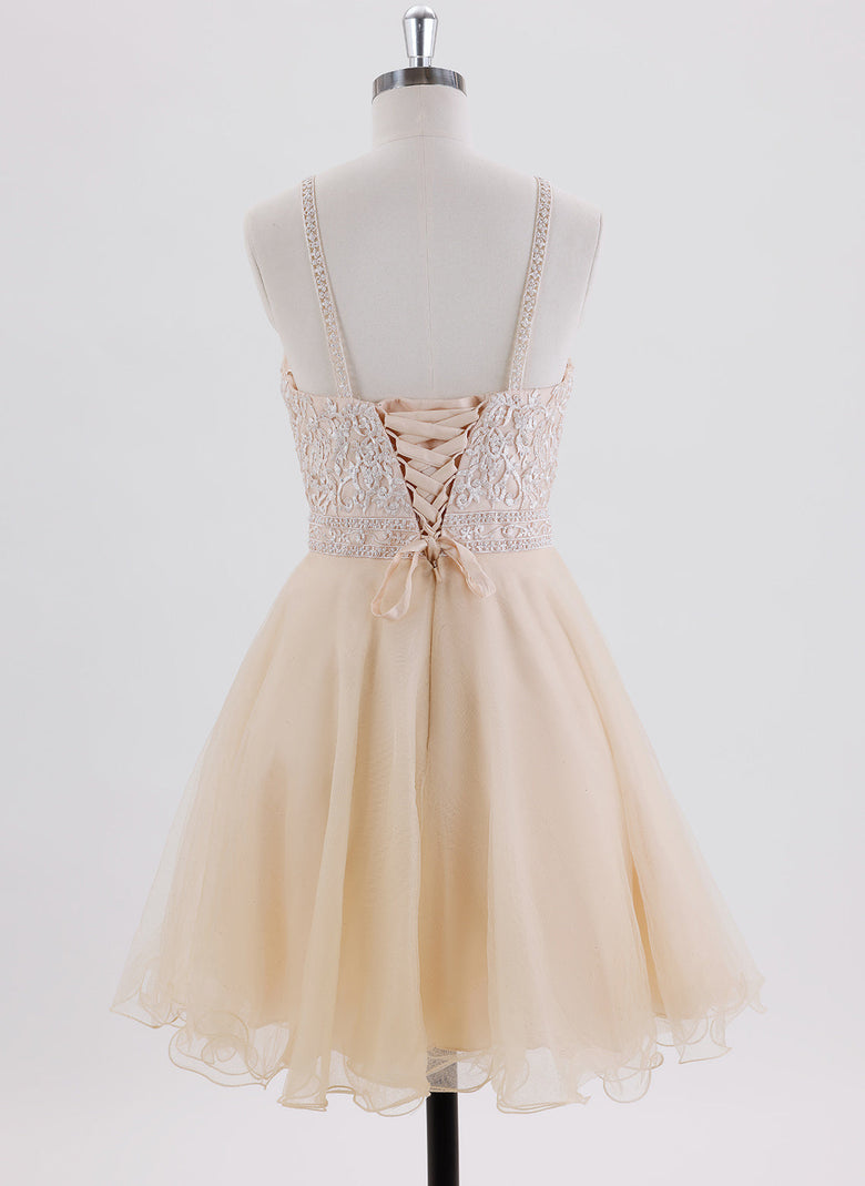 This A-line sleeveless homecoming dress features a delicate short tulle skirt that offers graceful movement and a flattering silhouette. Intricate beading embellishes the bodice, adding subtle sparkle and refined detail. Designed for comfort and style, this dress is an excellent choice for making a sophisticated impression at your special event.
