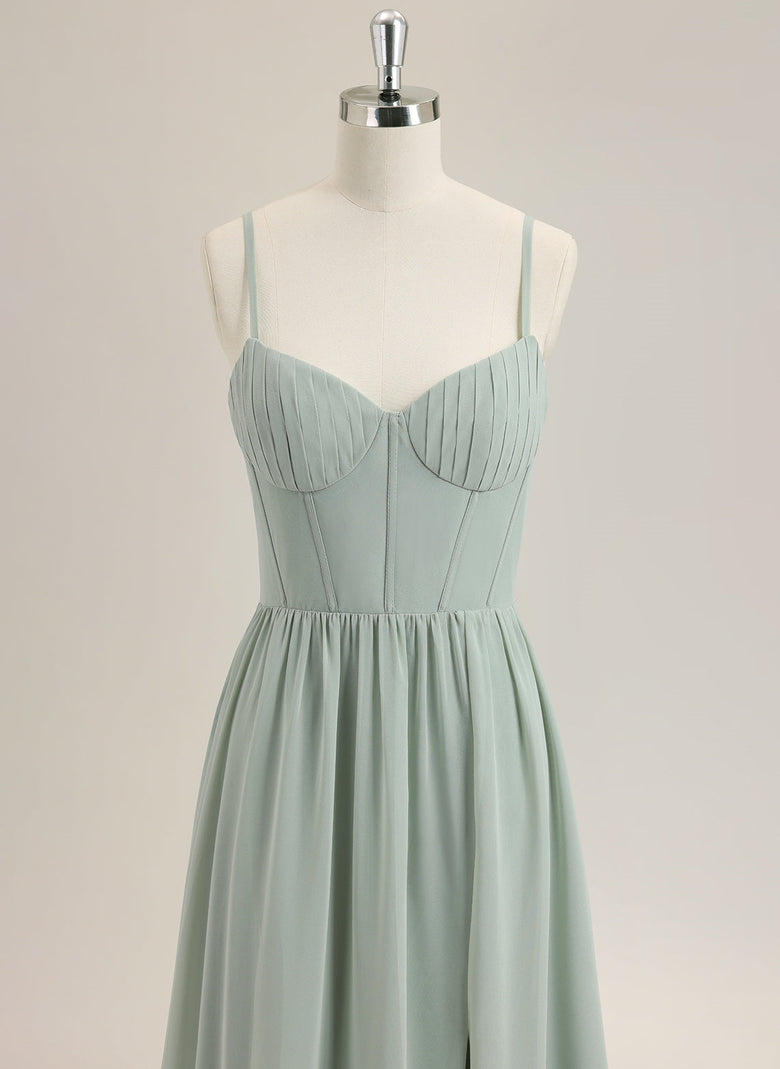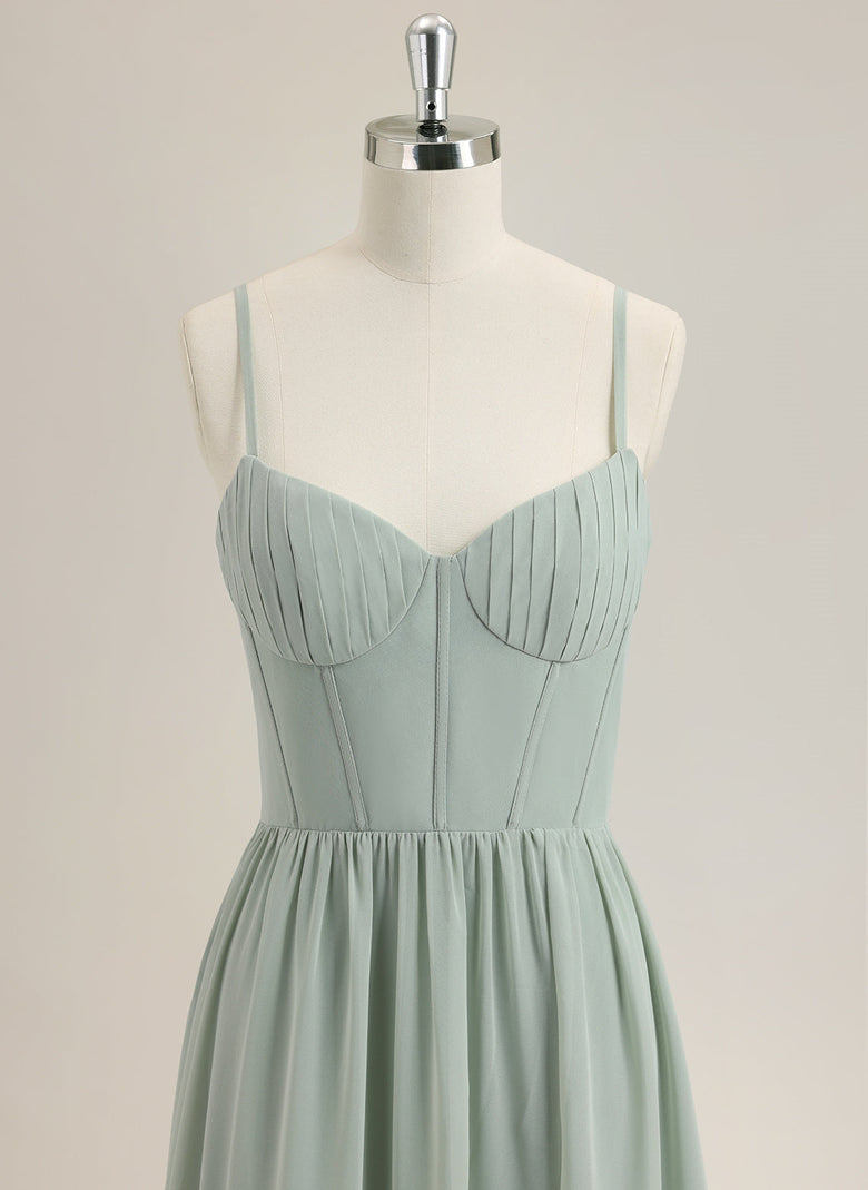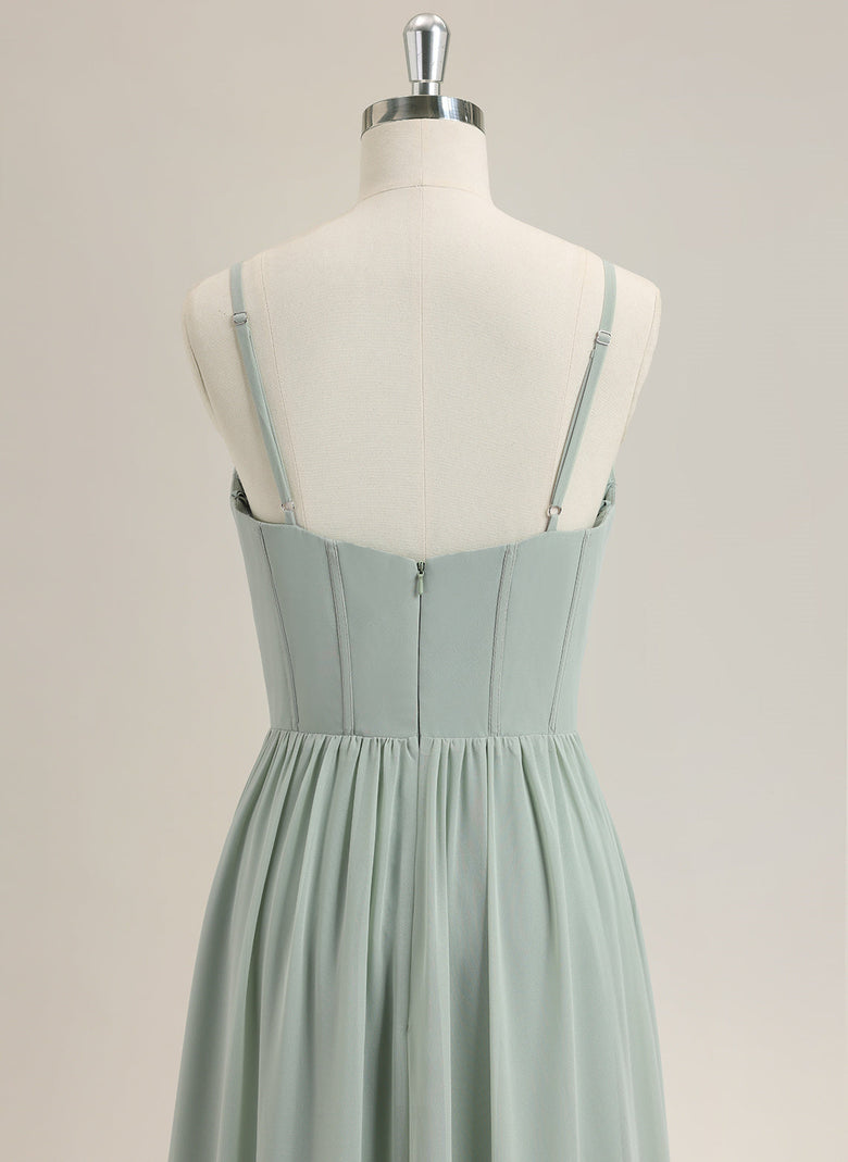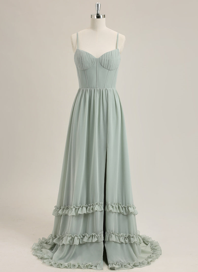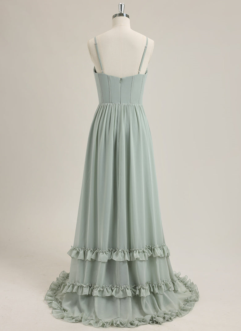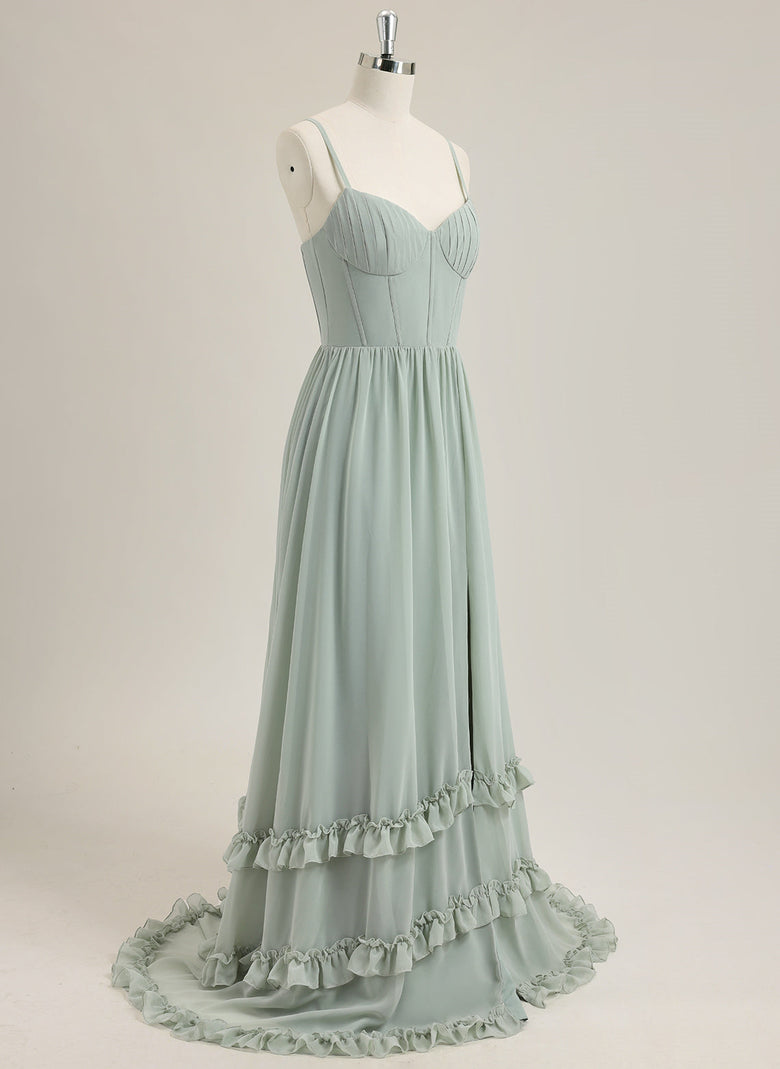 This A-line prom dress features a sleeveless design and a graceful sweep train, crafted from lightweight chiffon for elegant movement. The delicate ruffle detailing adds a refined touch, making it an ideal choice for formal occasions where sophistication and comfort are paramount.