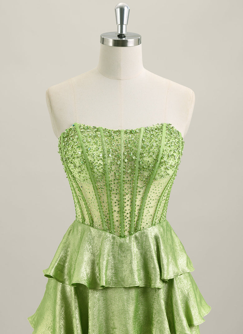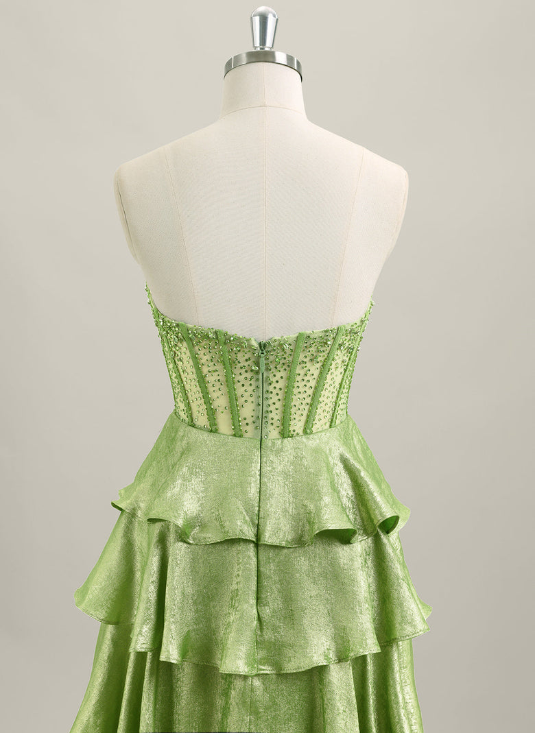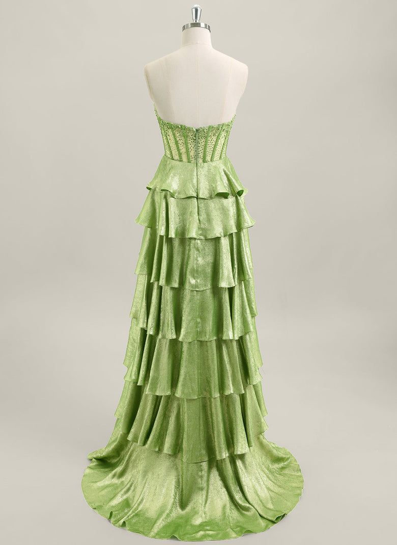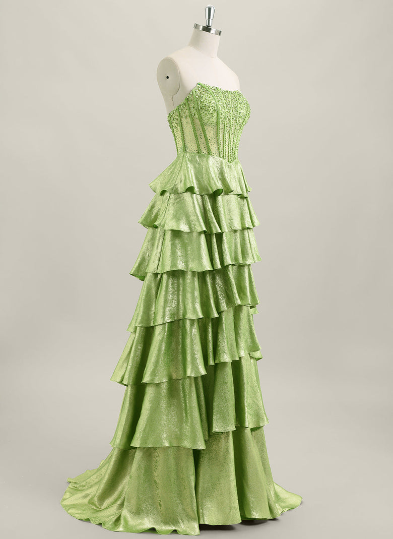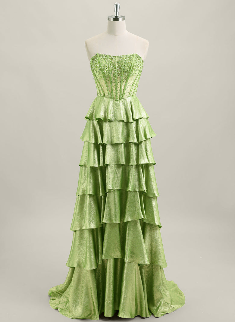 This A-line sleeveless maxi dress combines a metallic sheen with intricate beading and a dramatic ruffle tail for a sophisticated, fashion-forward look. The sweep train adds elegant movement, while the sleeveless cut ensures comfort and ease. Perfect for formal occasions, this dress balances refined embellishment with dynamic design details for a memorable silhouette.