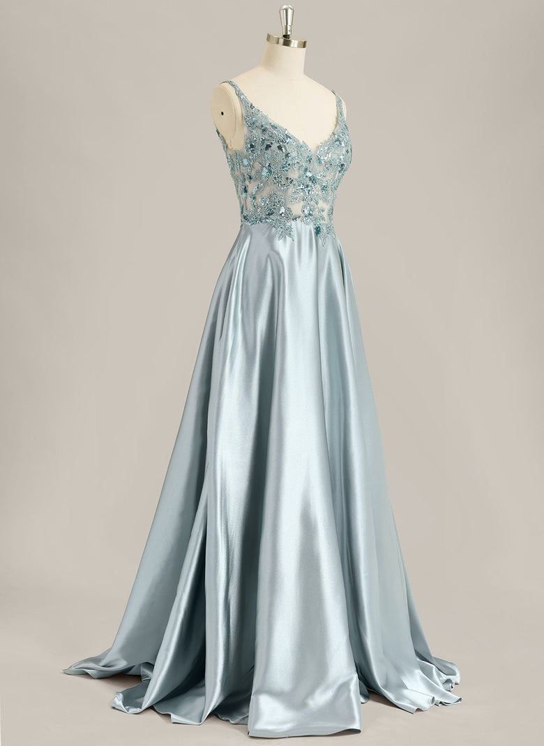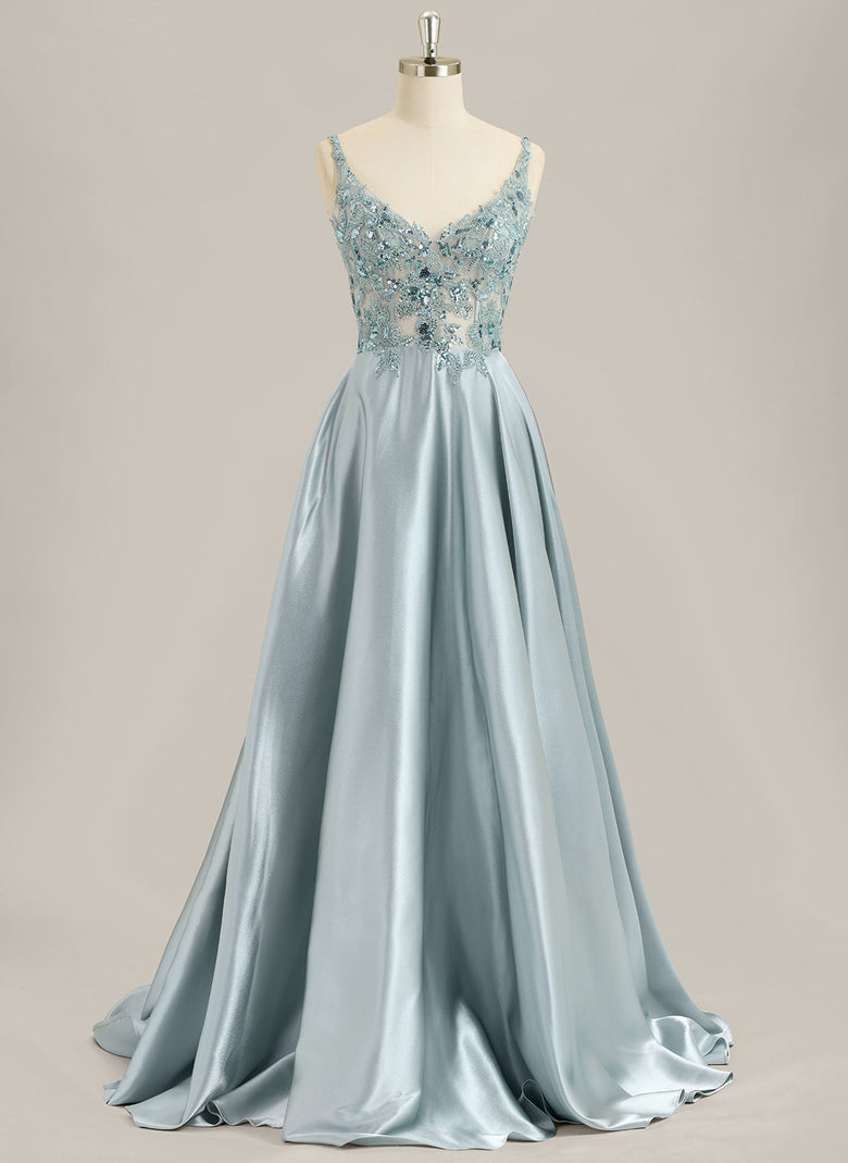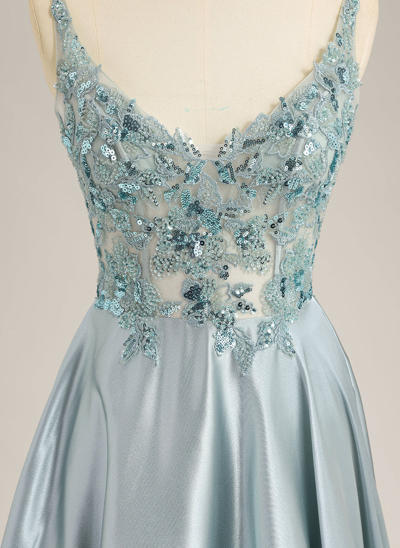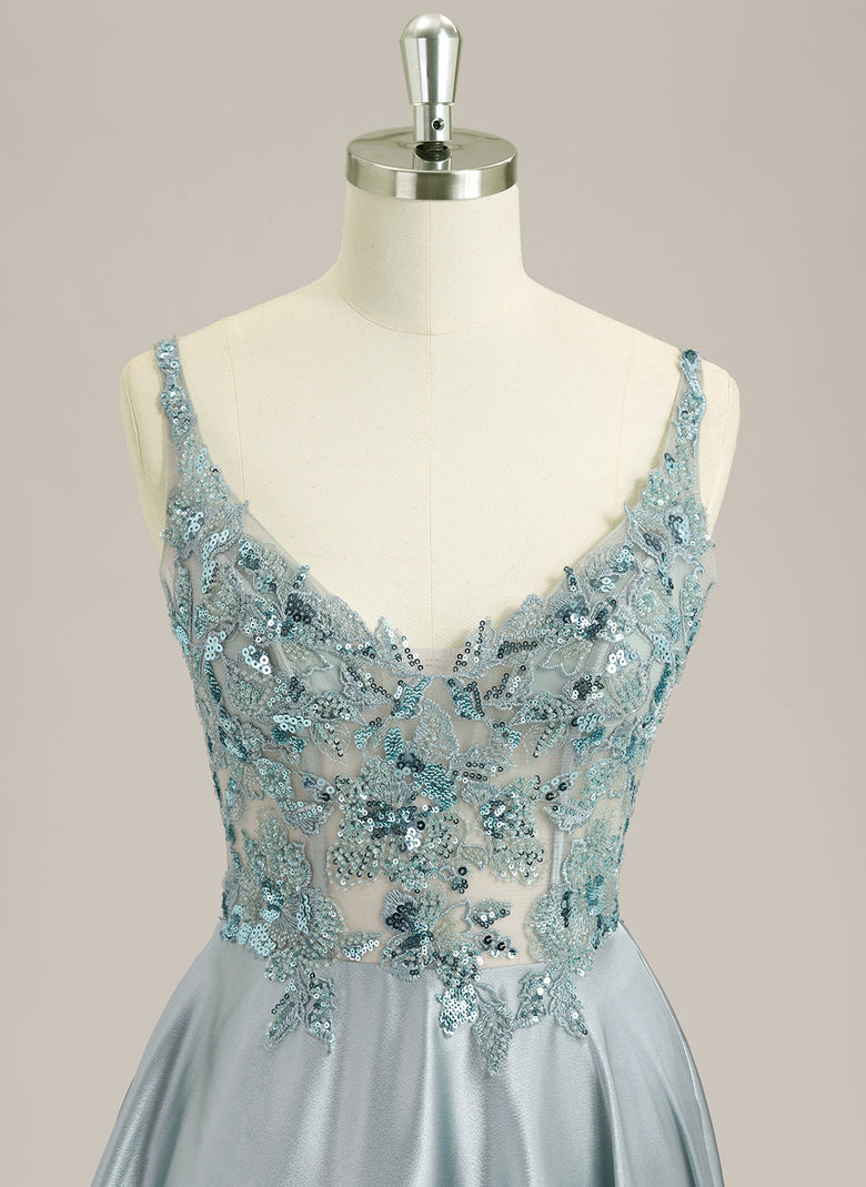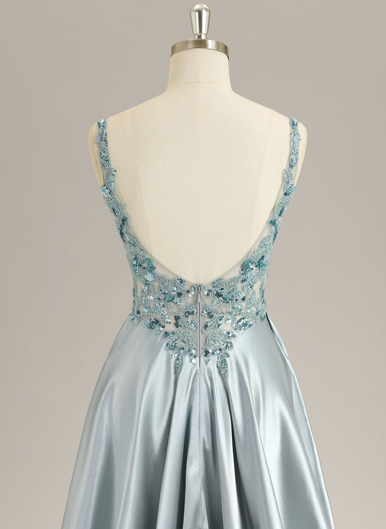This elegant A-line prom dress features a sleeveless design and a graceful sweep train crafted from smooth satin. Adorned with delicate sequins, it offers a subtle shimmer that enhances its sophisticated appeal. The open back adds a modern, alluring touch, making it an ideal choice for formal events where style and comfort are paramount.