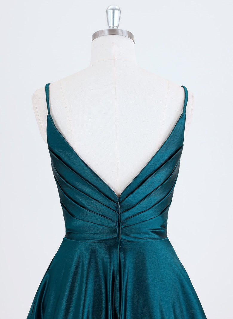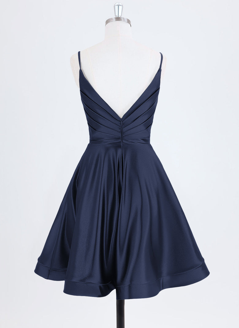 This A-line homecoming dress features delicate spaghetti straps and a short satin silhouette that combines elegance with comfort. The pleated detailing adds texture and movement, enhancing its sophisticated design. Perfect for special occasions, this dress offers a flattering fit that complements various body types while ensuring ease of wear throughout your event.