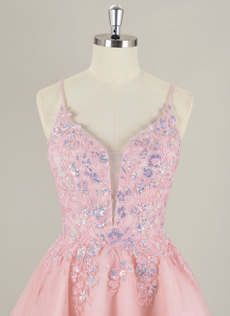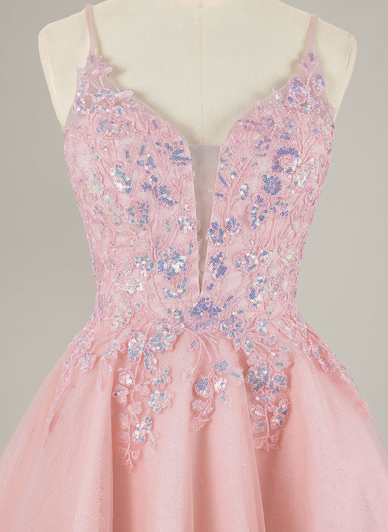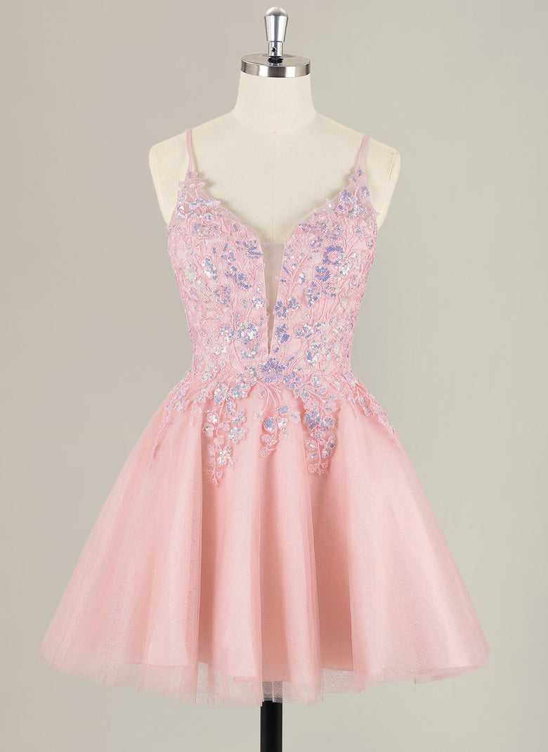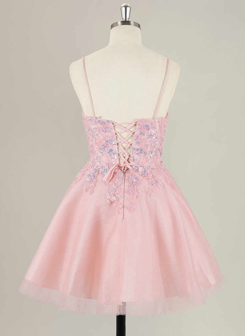 This A-line homecoming dress features delicate spaghetti straps and a short tulle skirt, creating a graceful silhouette. The crossed straps add a modern touch, while sequined floral embellishments bring subtle sparkle and elegance. Perfect for making a refined statement at any special occasion, this dress combines classic design with contemporary details for a sophisticated look.