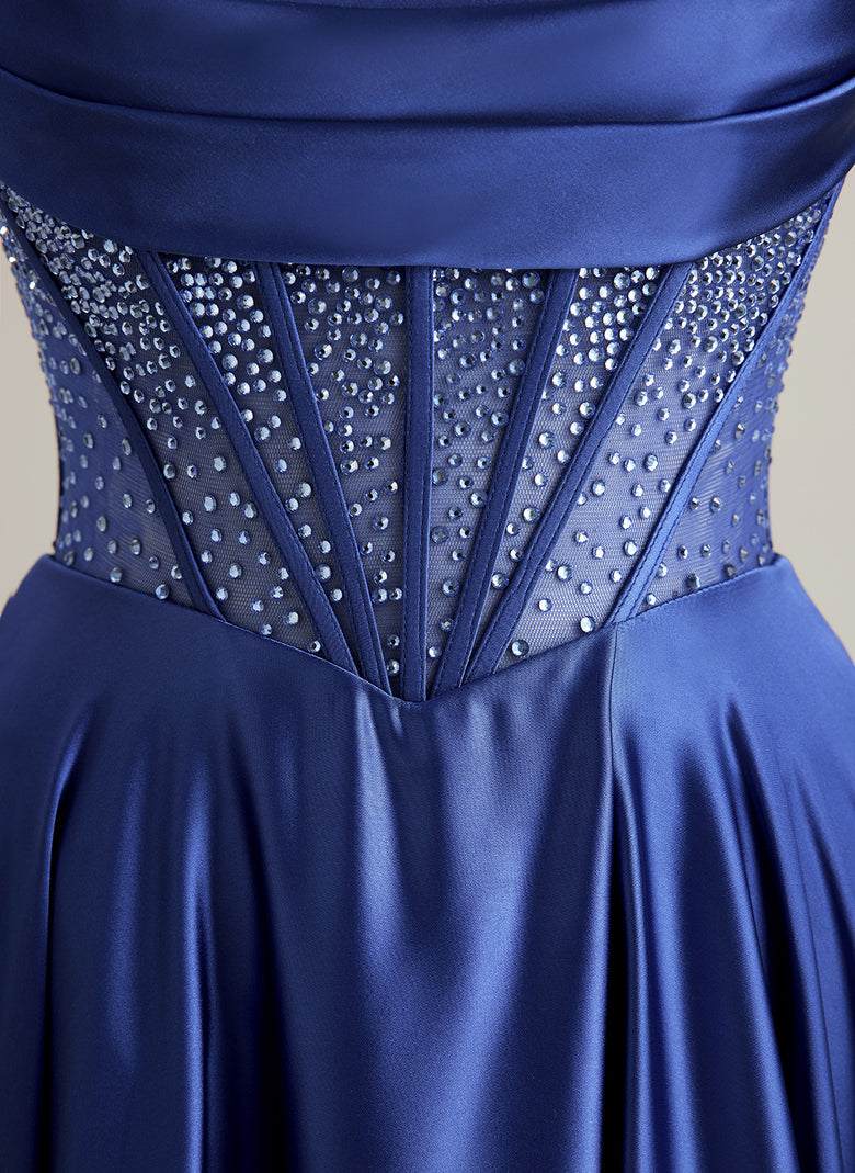 A-line Sweetheart Sweep Train Silky Satin Prom Dresses With Rhinestone