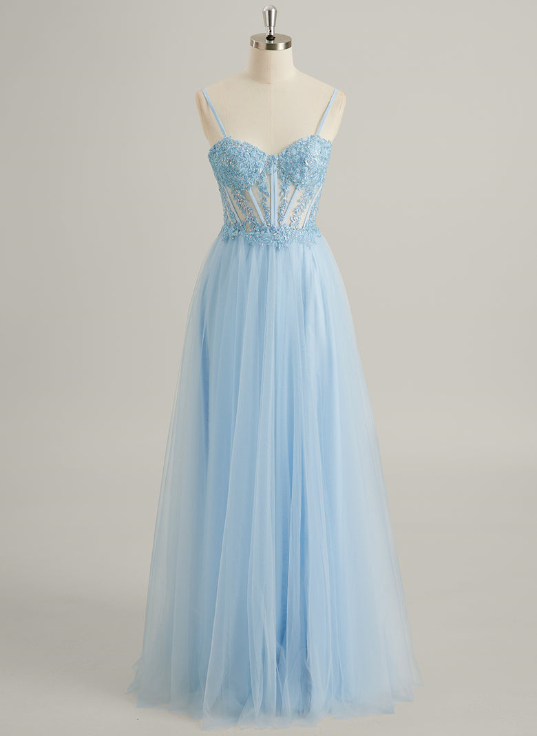 Spaghetti Straps V-Neck Sweet & Flow Tiered Prom Sequins Tulle A-line Maxi Dress With No Leg Slit