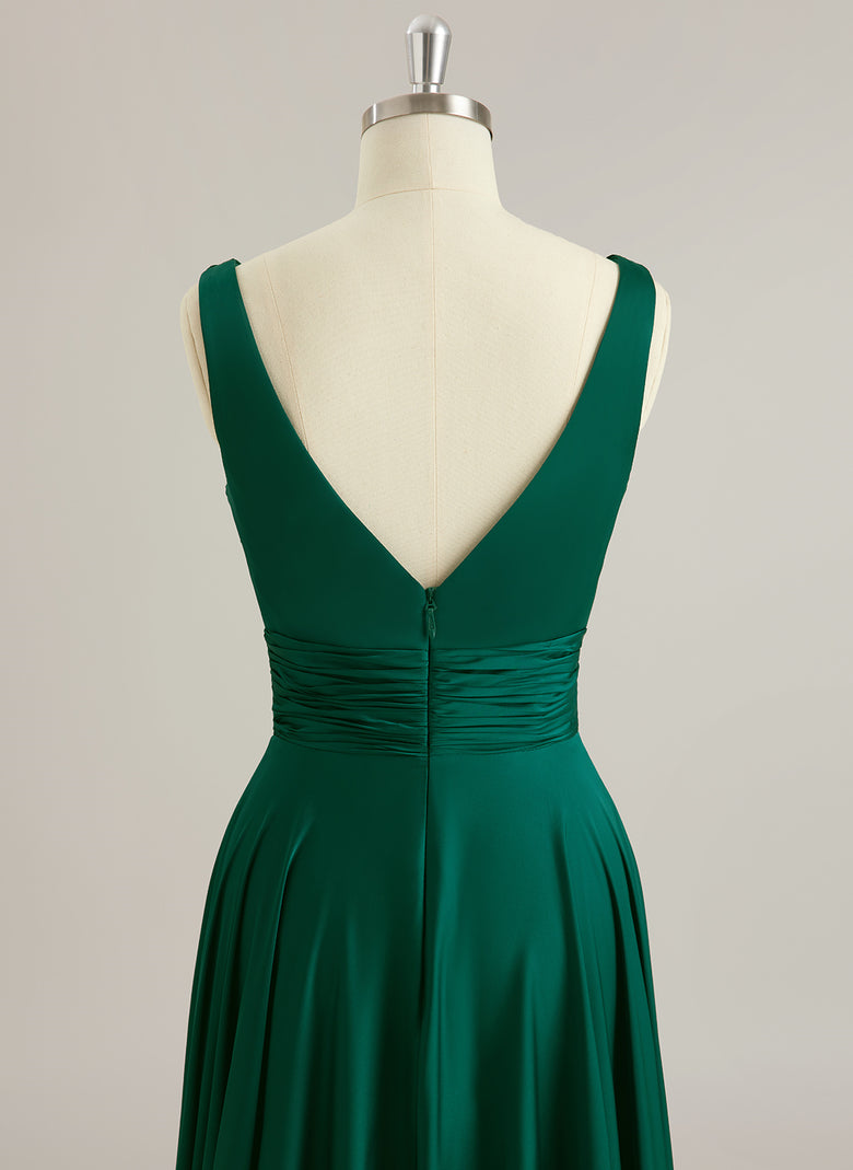 A-line V-Neck Floor-Length Silky Satin Prom Dresses With Pleated