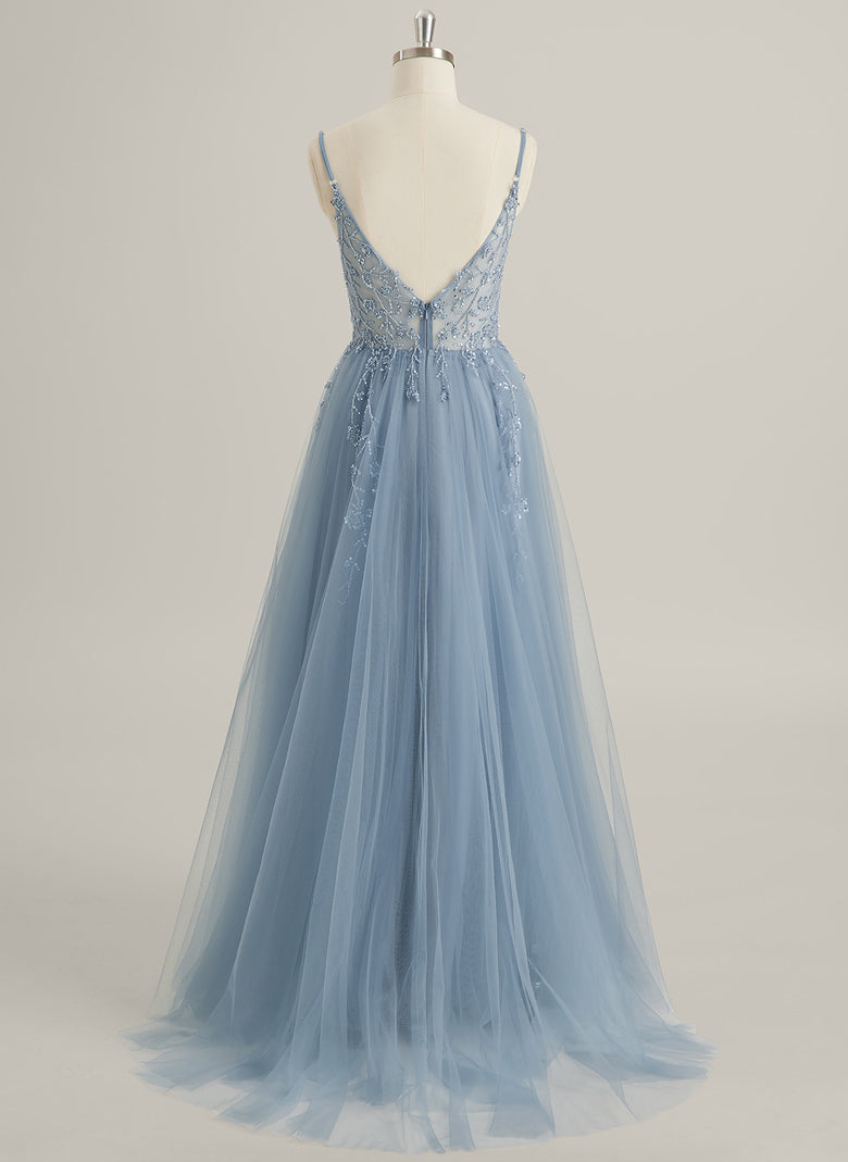 A-line V-Neck Floor-Length Tulle Lace Maxi Dresses With Sequins