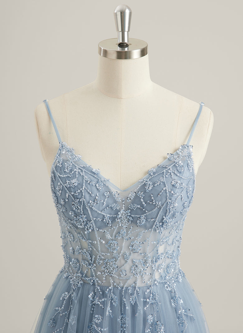 Spaghetti Straps V-Neck Sparkle & Shine Sweet & Flow Tiered Prom Sequins Tulle A-line Maxi Dress With No Leg Slit