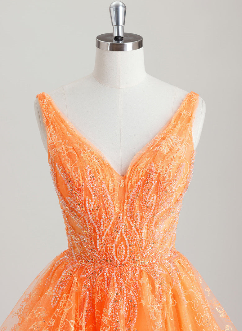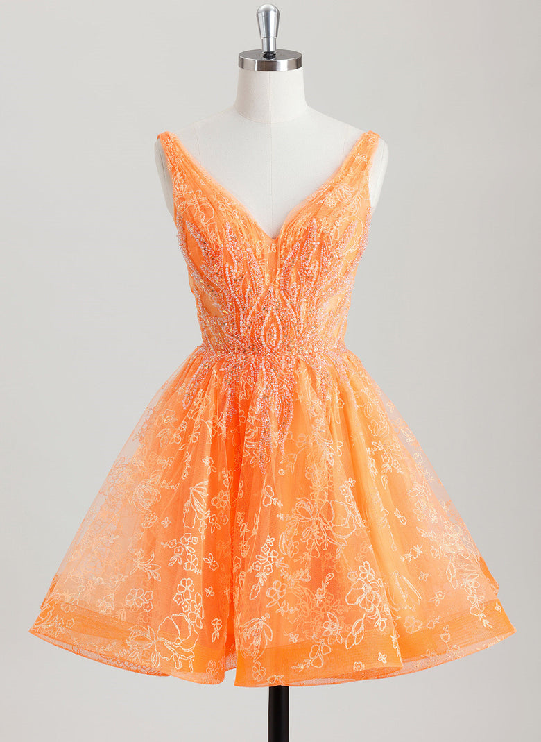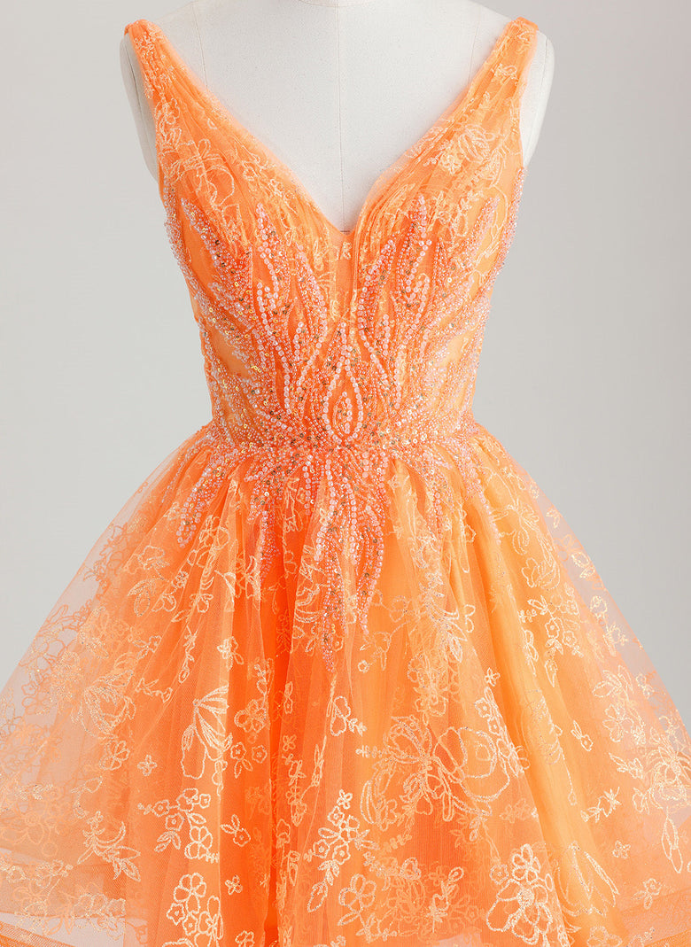 This A-line V-Neck Short Lace Tulle Homecoming Dress features a delicate lace bodice adorned with intricate beading and sequins, adding subtle sparkle and texture. The flattering V-neckline enhances the neckline, while the flowing tulle skirt offers graceful movement and volume. Its short length balances elegance with comfort, making it an ideal choice for homecoming events where refined style meets youthful charm.