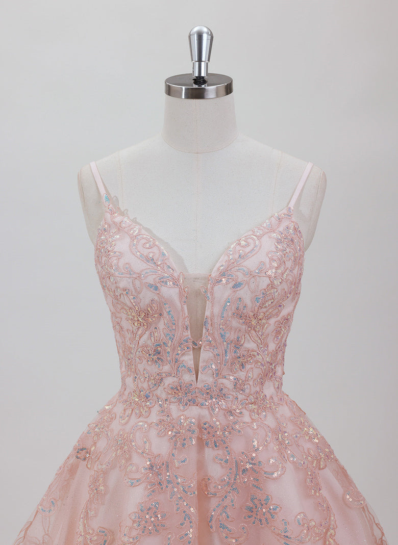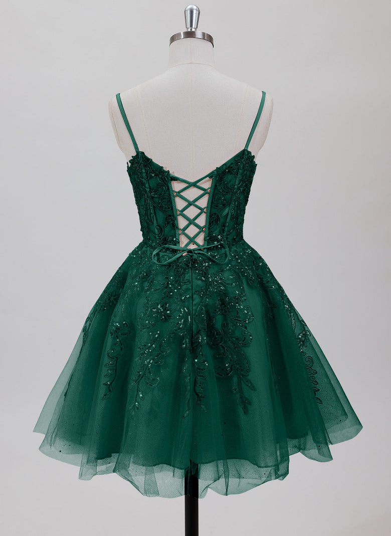 This A-line V-Neck Short Tulle Homecoming Dress combines a flattering silhouette with delicate sequin embellishments for subtle sparkle. The V-neckline enhances the neckline with elegance, while the lightweight tulle skirt offers graceful movement and volume. Its short length balances sophistication with youthful charm, making it an excellent choice for homecoming events where style and comfort are essential.