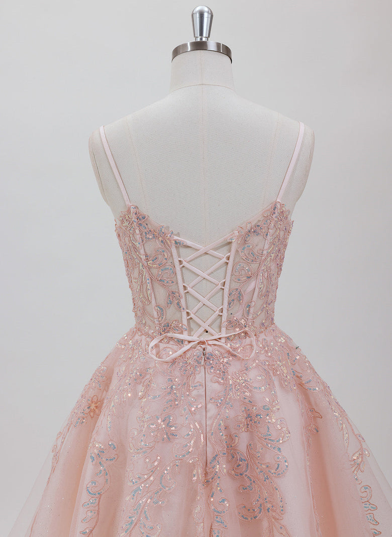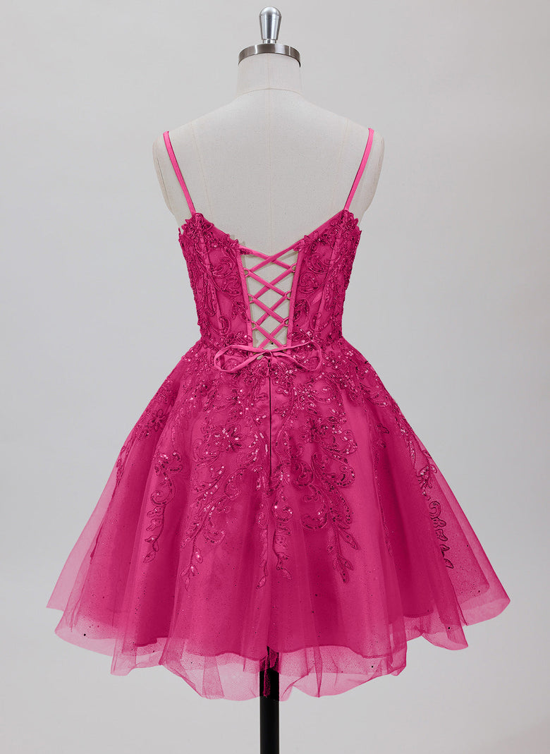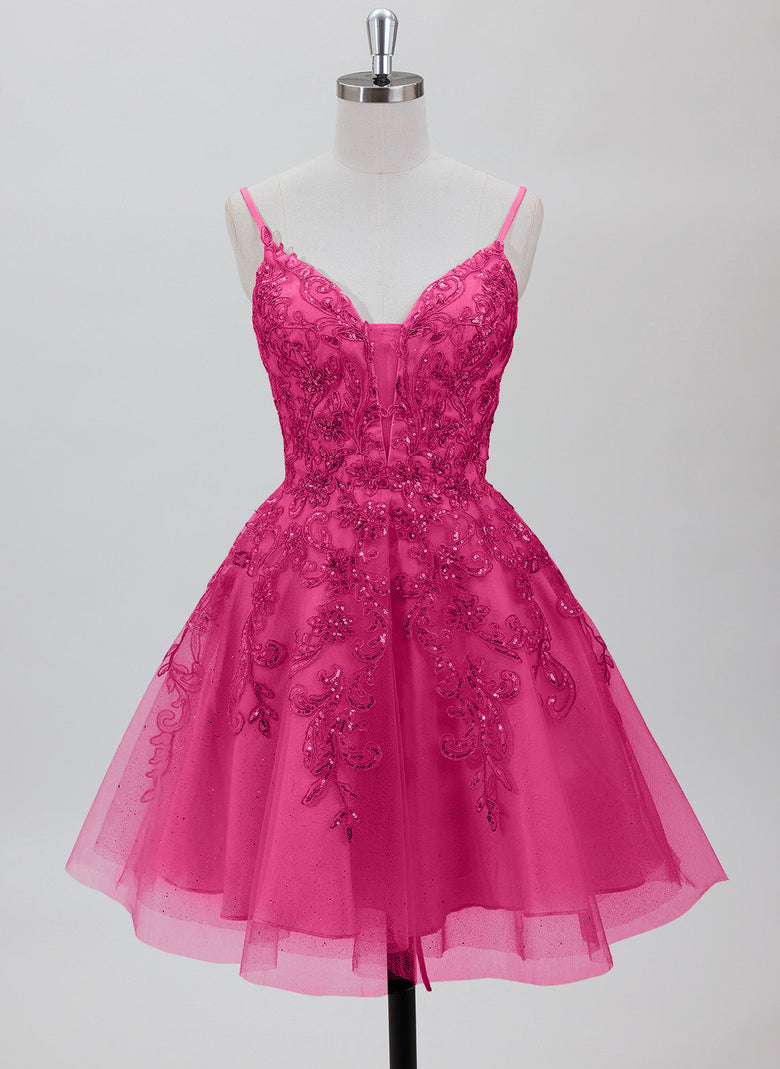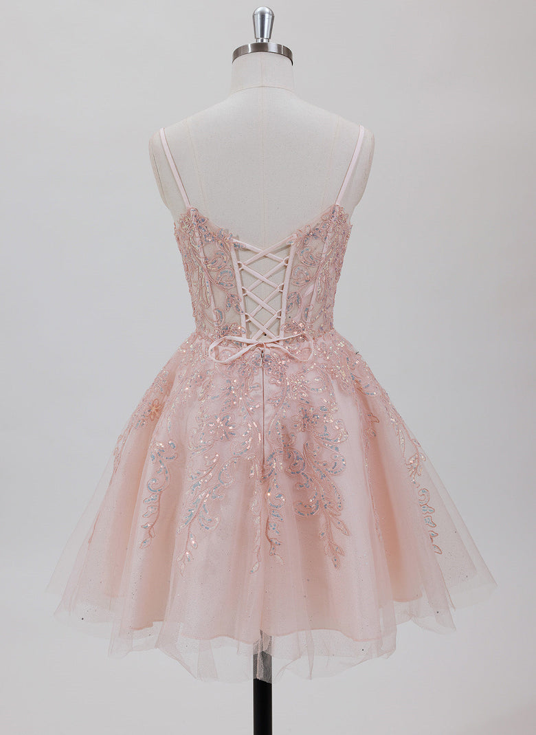 This A-line V-Neck Short Tulle Homecoming Dress combines a flattering silhouette with delicate sequin embellishments for subtle sparkle. The V-neckline enhances the neckline with elegance, while the lightweight tulle skirt offers graceful movement and volume. Its short length balances sophistication with youthful charm, making it an excellent choice for homecoming events where style and comfort are essential.