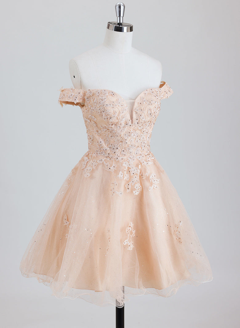 This short ball-gown homecoming dress features an elegant off-the-shoulder neckline and a full tulle skirt, creating a timeless princess silhouette. Embellished with sparkling rhinestones, it adds a refined touch of glamour and sophistication. Designed to combine classic charm with modern elegance, this dress ensures a memorable and graceful presence at any special event.