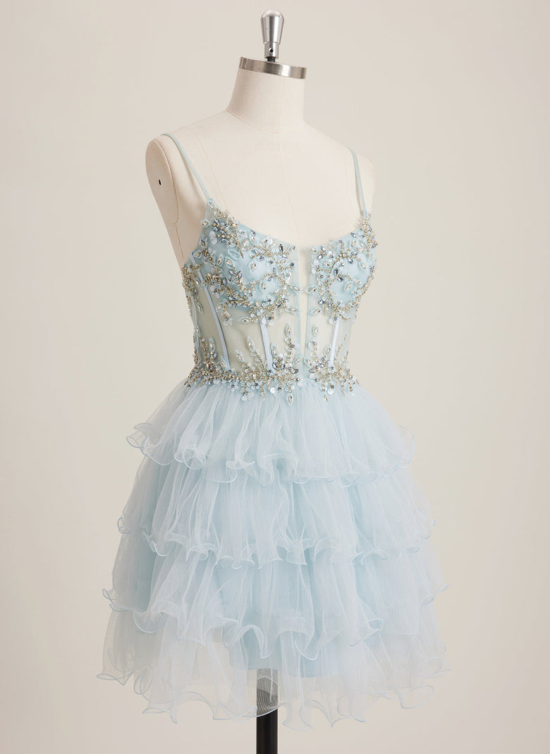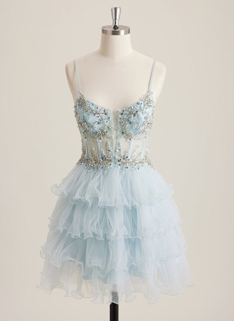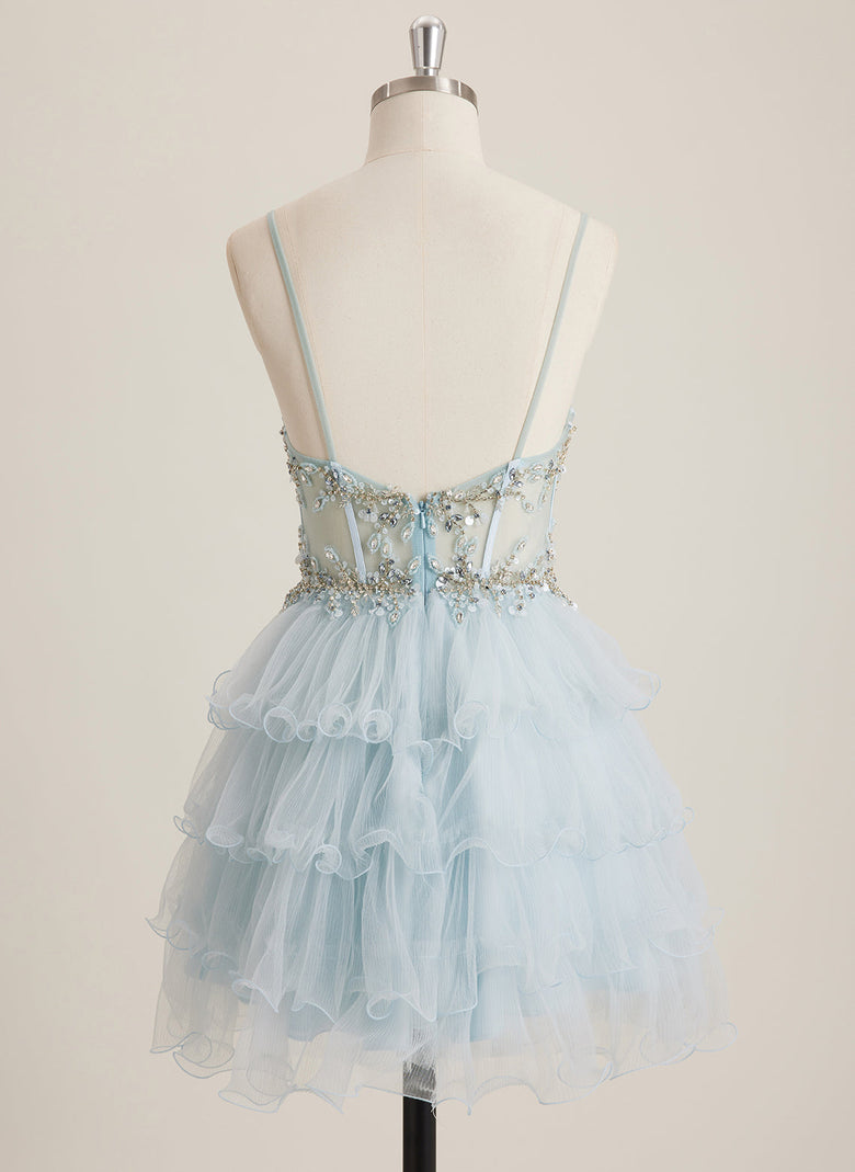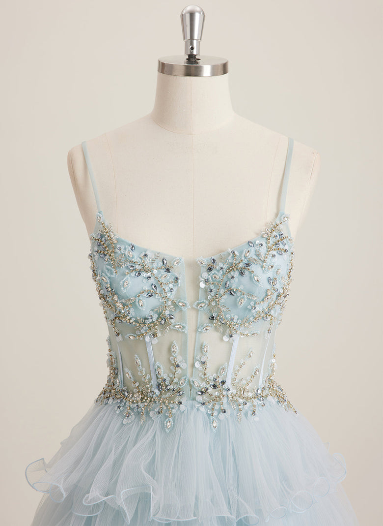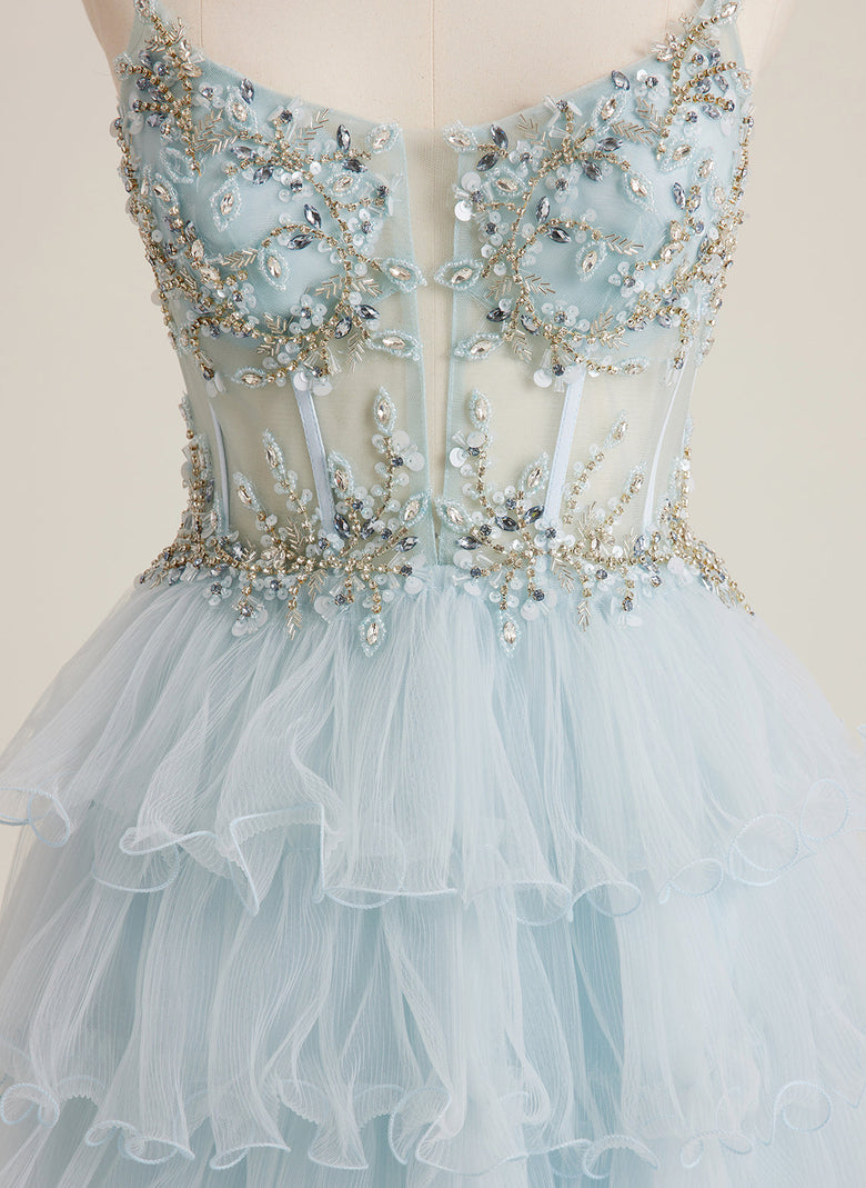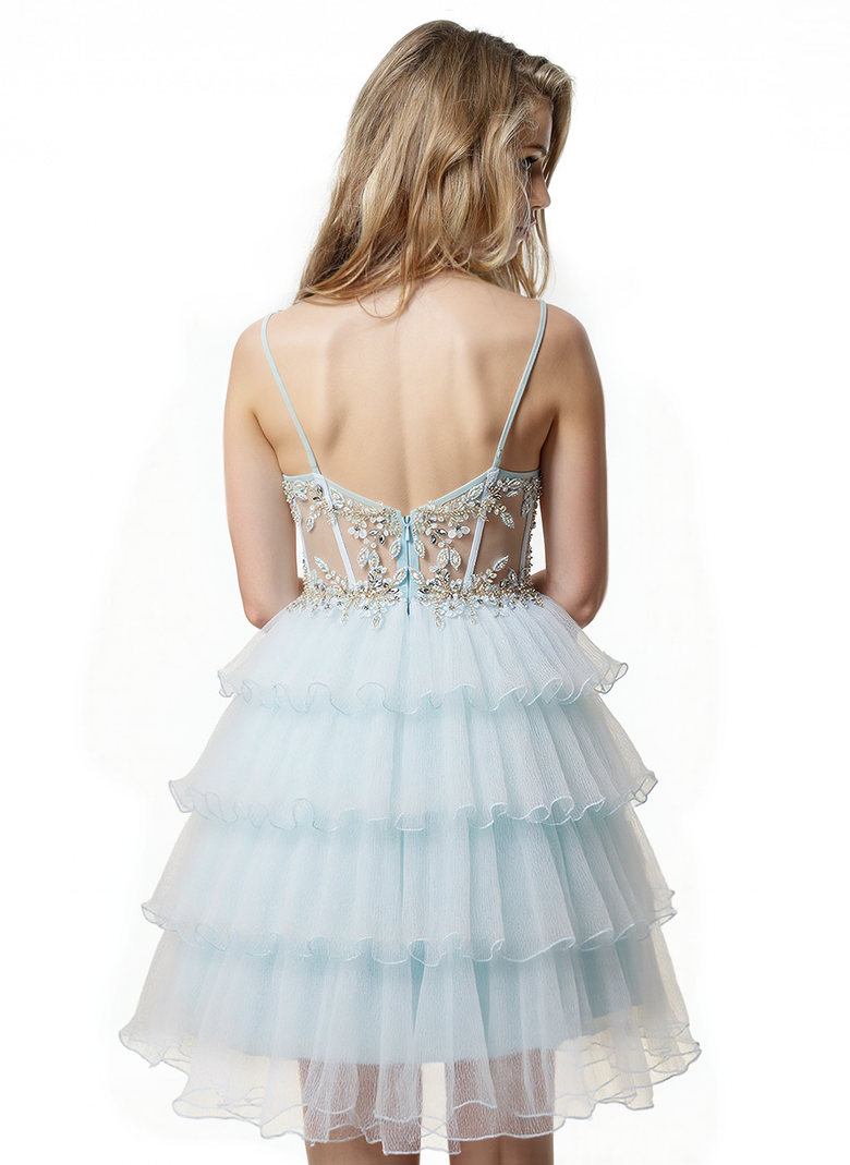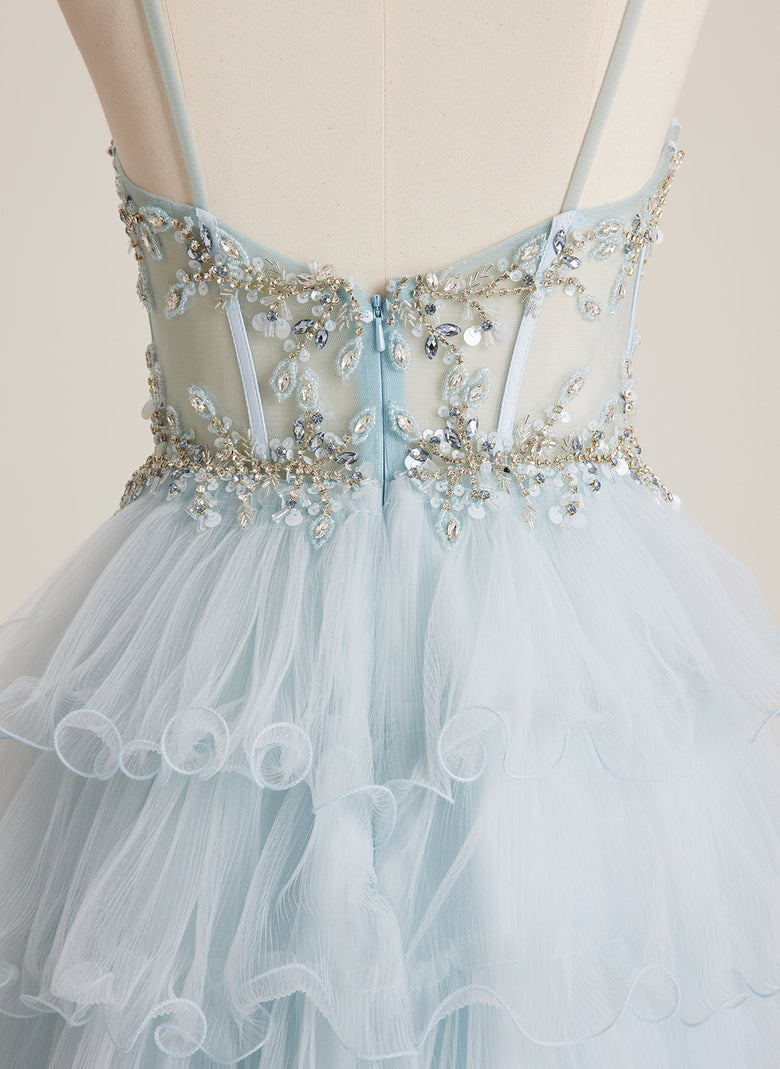 Expertly crafted with a ball-gown/princess silhouette, this short tulle mini dress is adorned with shimmering rhinestone sequins and intricate beading. Perfect for formal events, this dress will make you feel like royalty while also adding a touch of sparkle to your look.