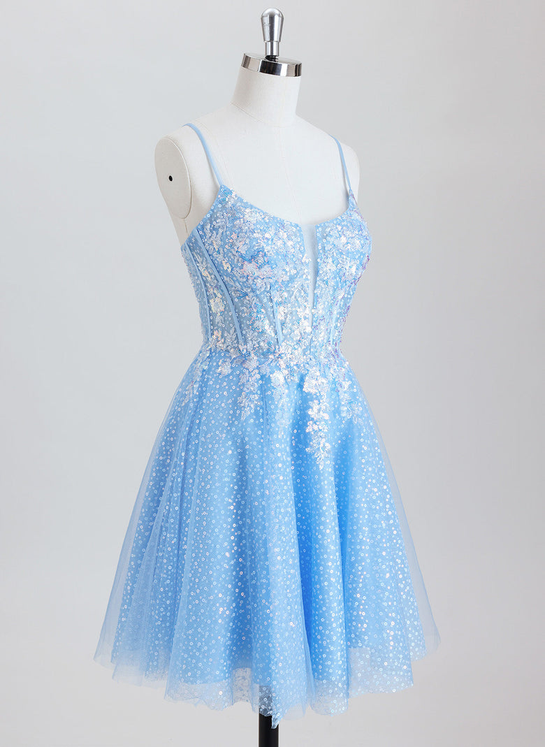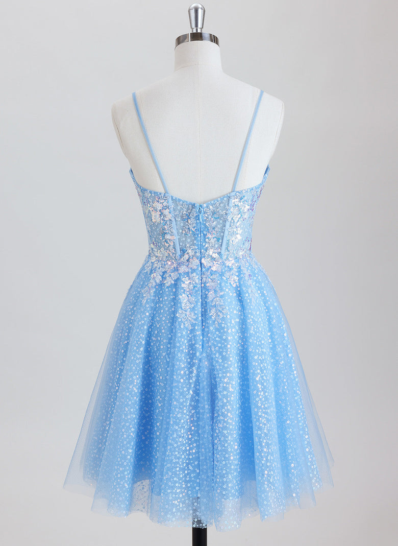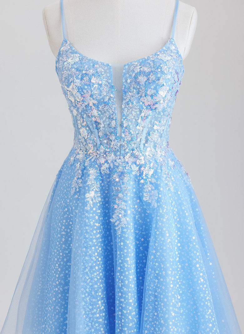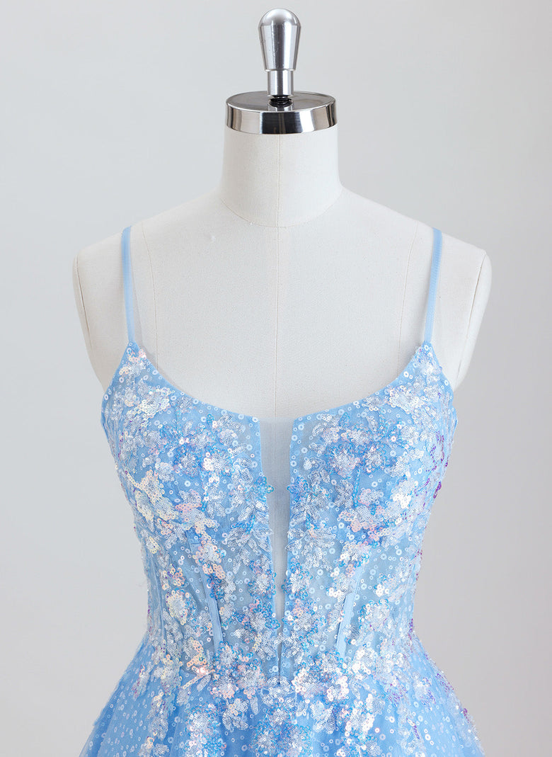 This short ball-gown style homecoming dress features intricate lace detailing and shimmering sequins, creating a refined princess silhouette. The scoop neckline adds a classic touch, enhancing elegance and comfort. Perfect for making a memorable impression at any formal event, this dress combines timeless design with delicate embellishments for a sophisticated look.