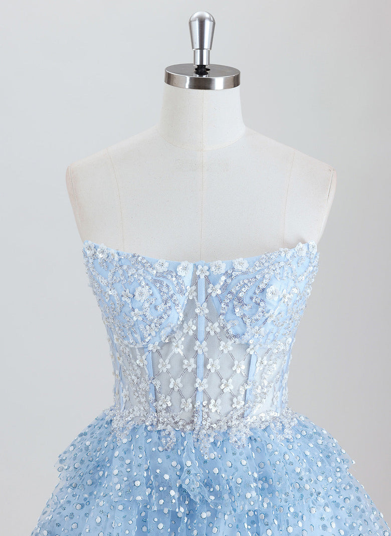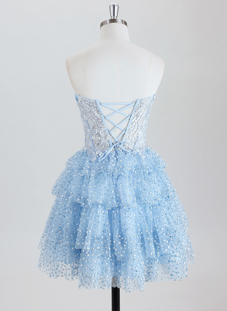 This short ball-gown style homecoming dress features delicate lace adorned with shimmering sequins, creating an elegant princess silhouette. Its intricate detailing and flattering cut make it an ideal choice for special occasions, offering both sophistication and youthful charm. Perfect for those seeking a standout look with refined craftsmanship.