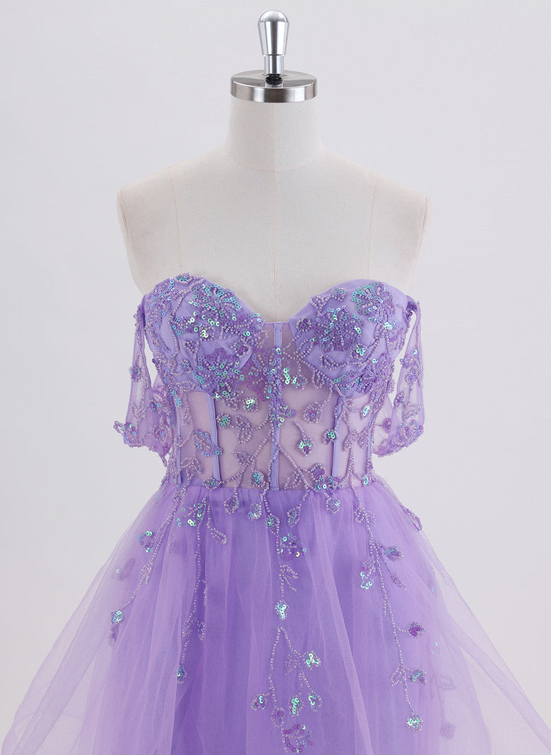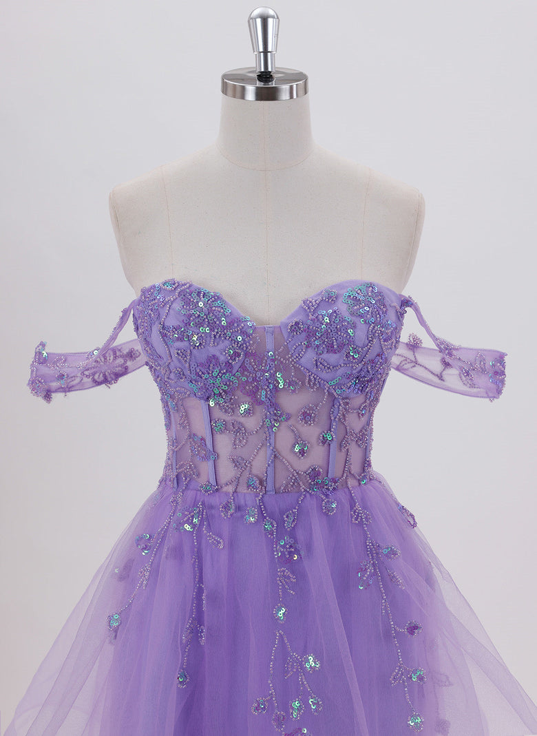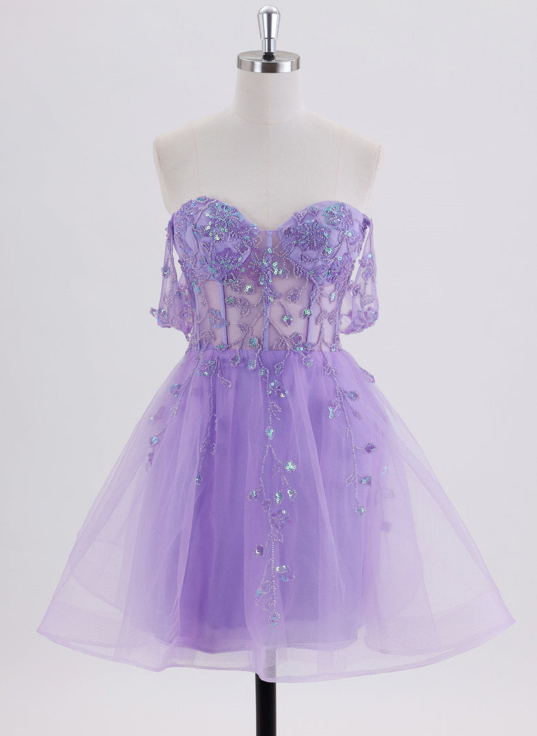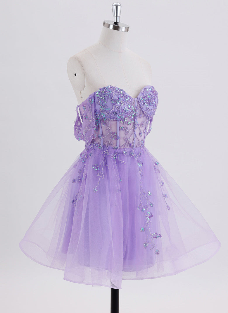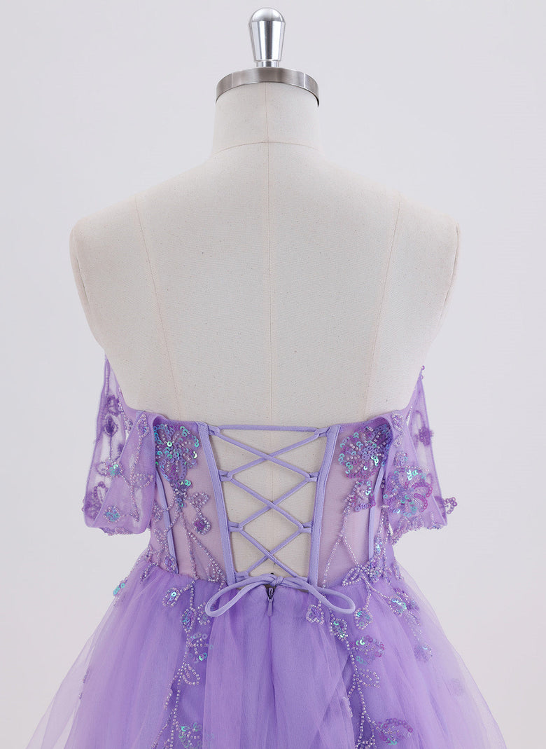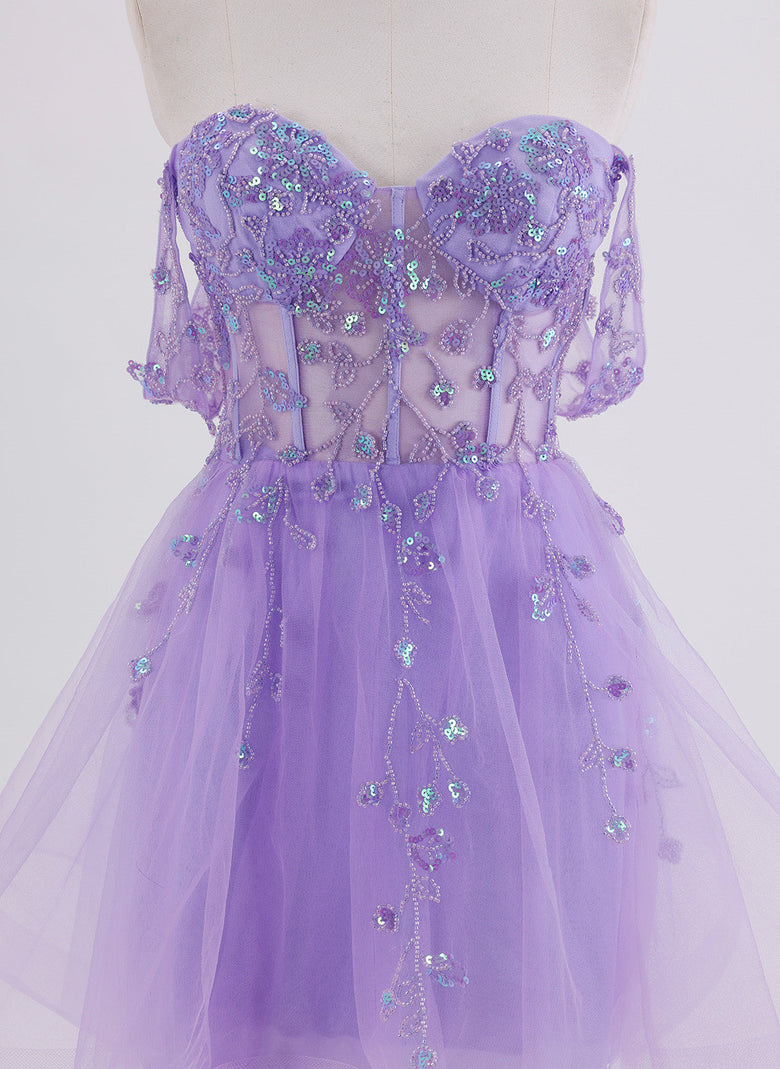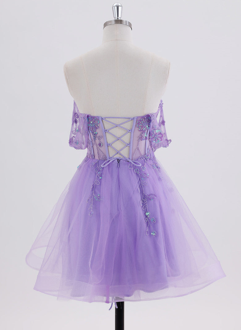 This short ball-gown homecoming dress features intricate lace adorned with sequins and delicate beading, creating a refined and elegant look. The off-the-shoulder design combined with crossed straps at the back offers both support and a sophisticated silhouette. Perfect for making a memorable entrance, this princess-style dress balances classic charm with modern detailing for a standout occasion wear choice.