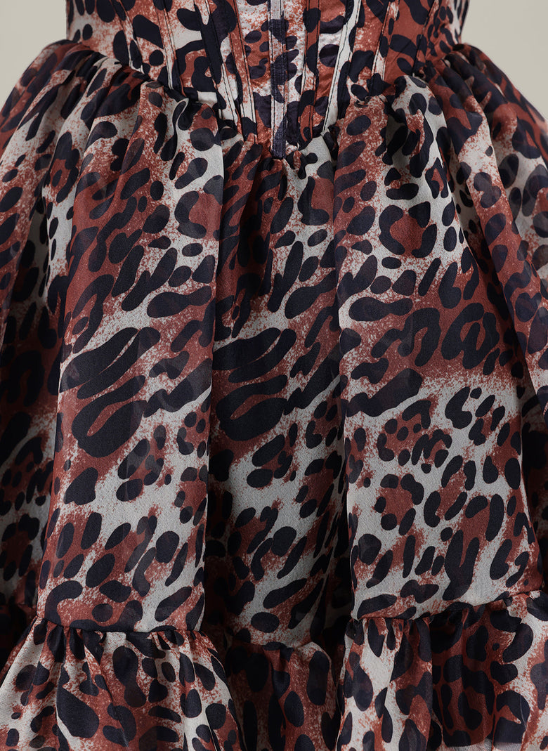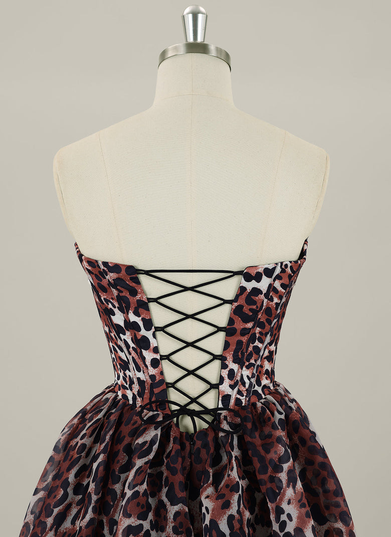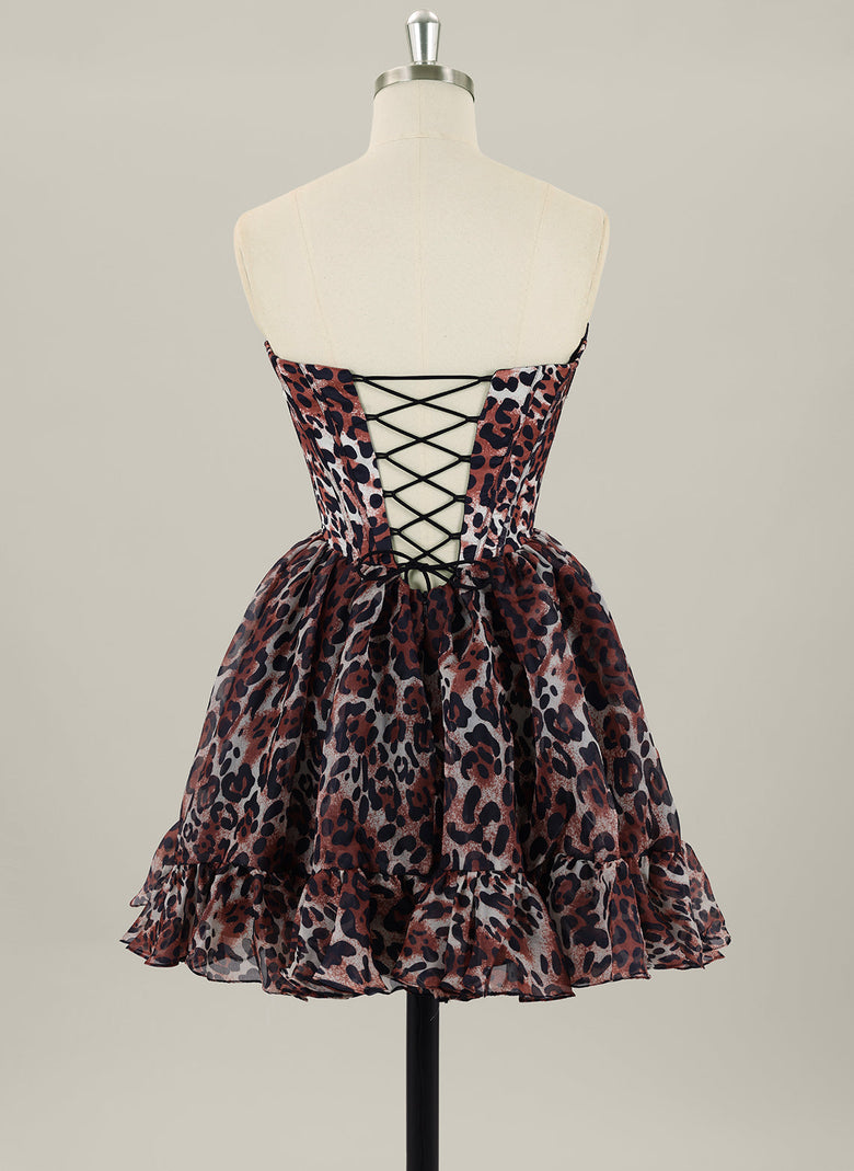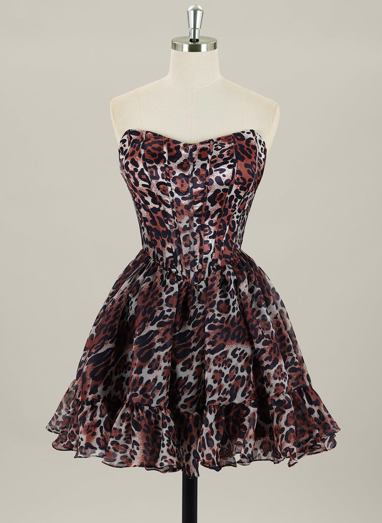 This short organza homecoming dress combines classic ball-gown elegance with a modern twist. Crafted from leopard print fabric, it offers a bold yet sophisticated look. The dress features delicate ruffles that add texture and movement, while its convertible shoulder design allows versatile styling for comfort and personalization. Perfect for making a memorable statement at your next event.