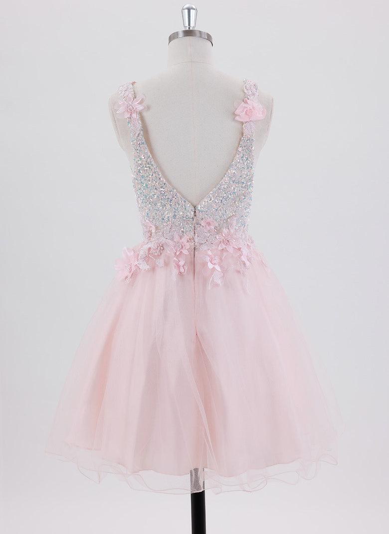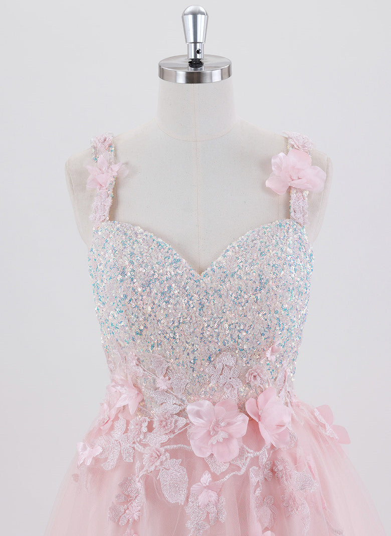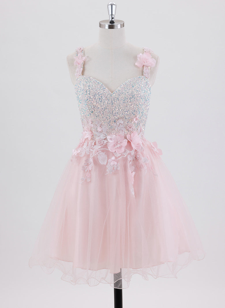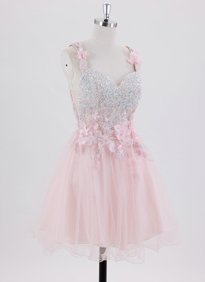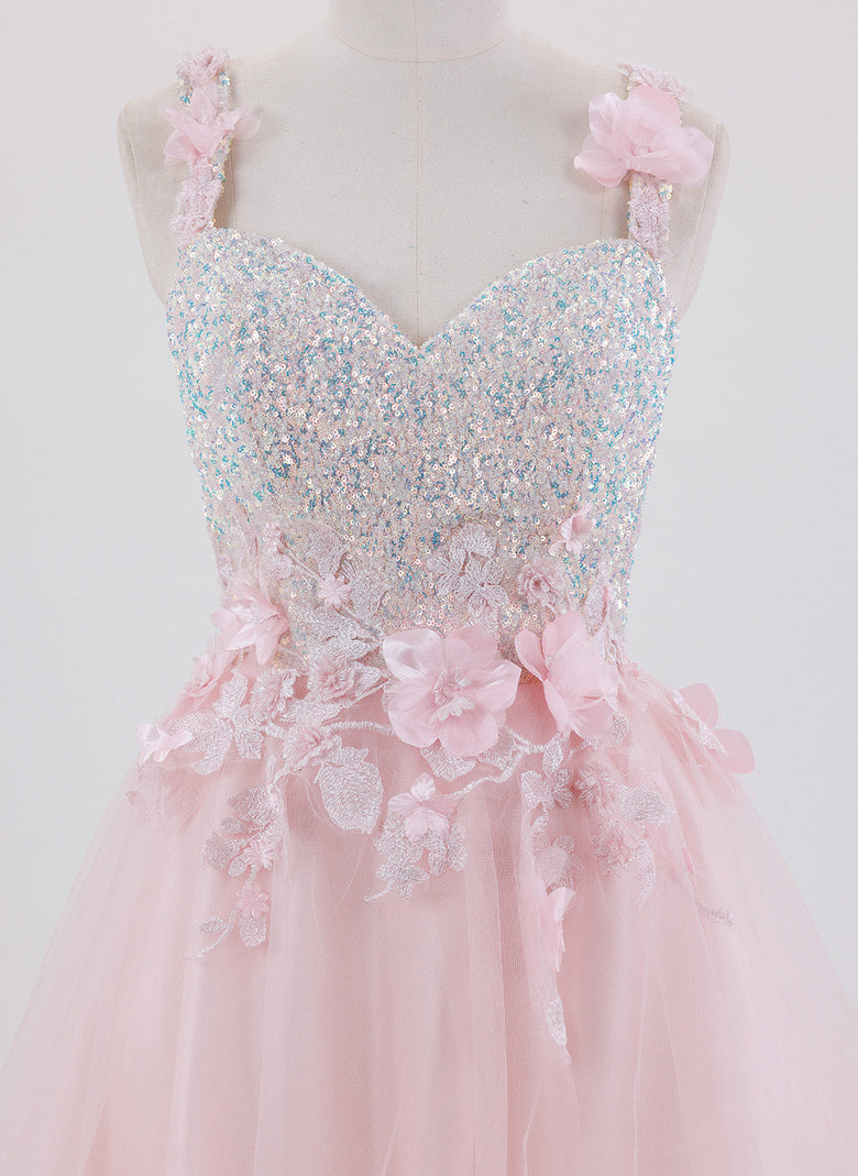 This short homecoming dress combines classic ball-gown elegance with modern charm. Featuring intricate 3D floral appliqués and shimmering sequins, it offers a textured, eye-catching design. The princess silhouette flatters the figure while providing comfort and ease of movement, making it ideal for special occasions where style and confidence are essential.