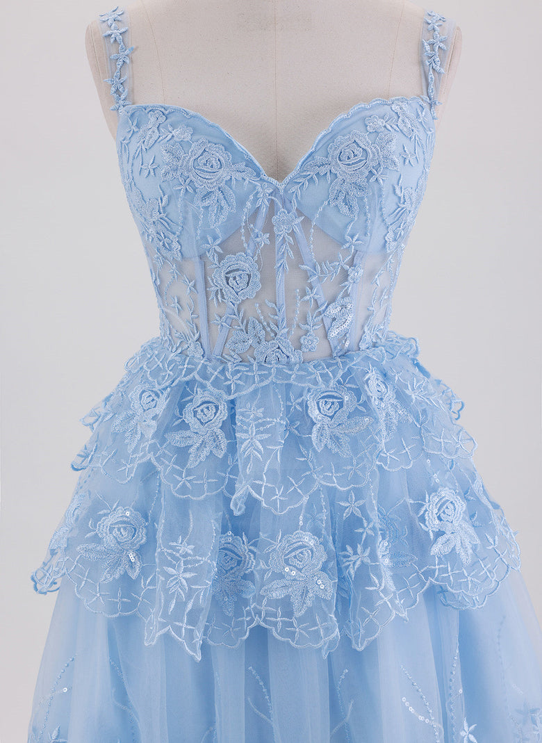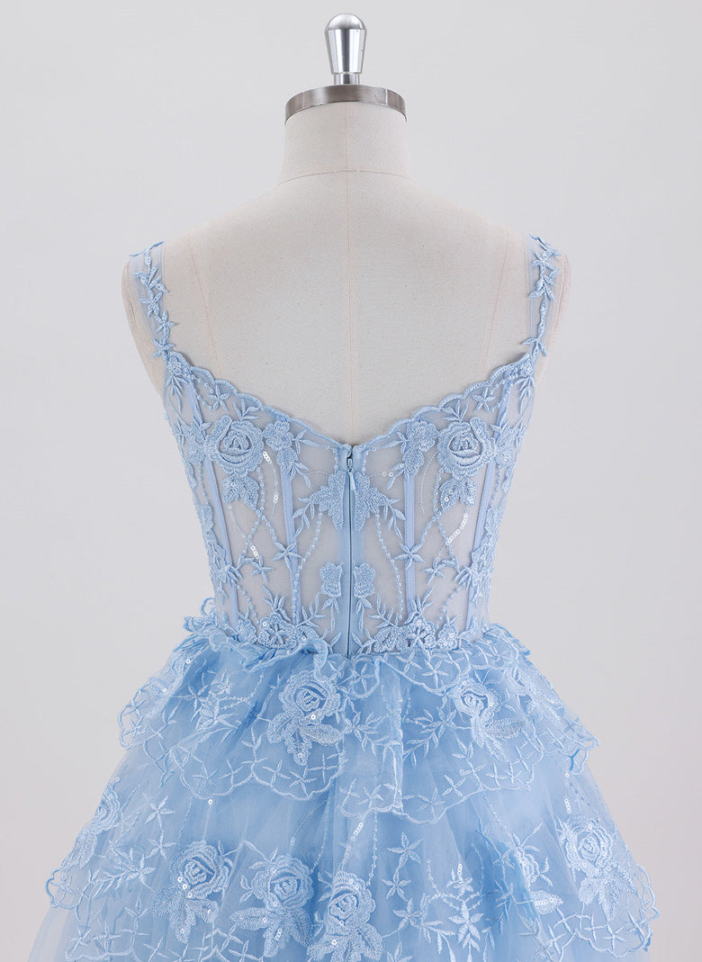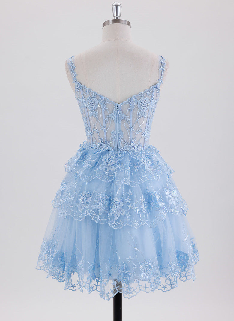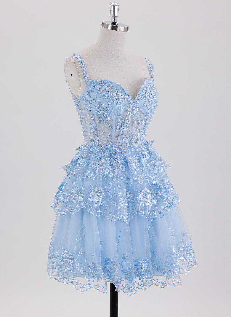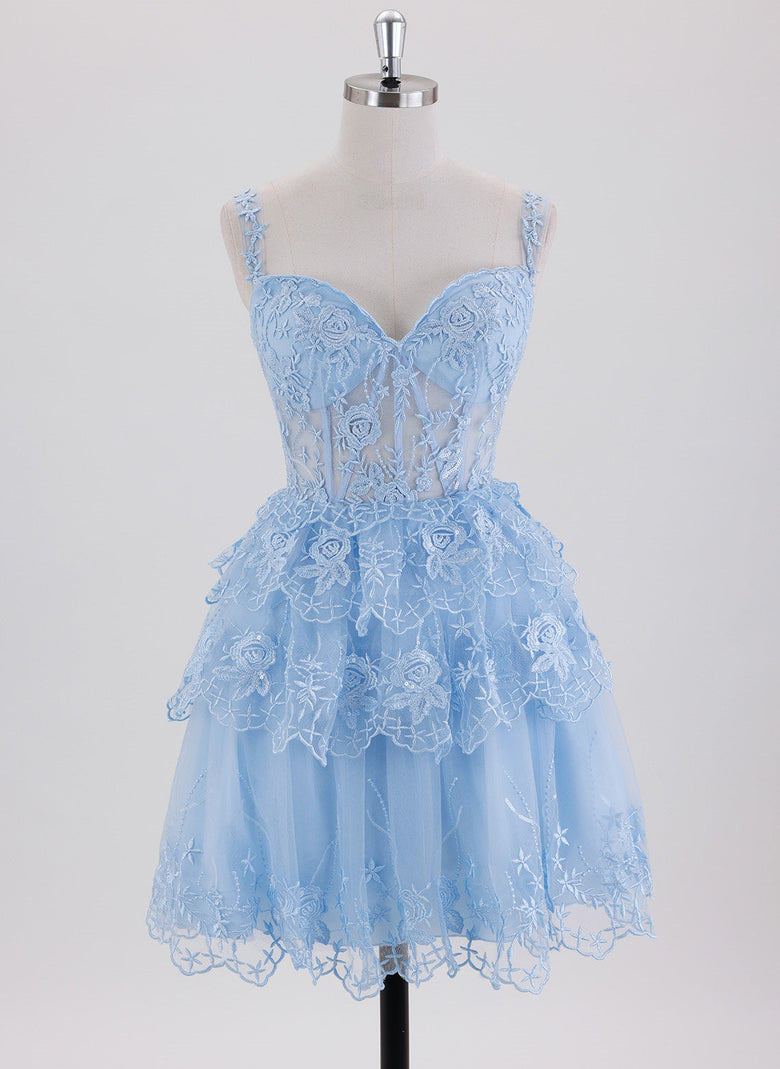 This short homecoming dress features a classic ball-gown silhouette with a princess-inspired design, enhanced by delicate lace detailing. Its multi-layered construction adds volume and movement, creating an elegant yet youthful look perfect for special occasions. The combination of intricate lace and layered fabric ensures both sophistication and comfort, making it an ideal choice for memorable events.