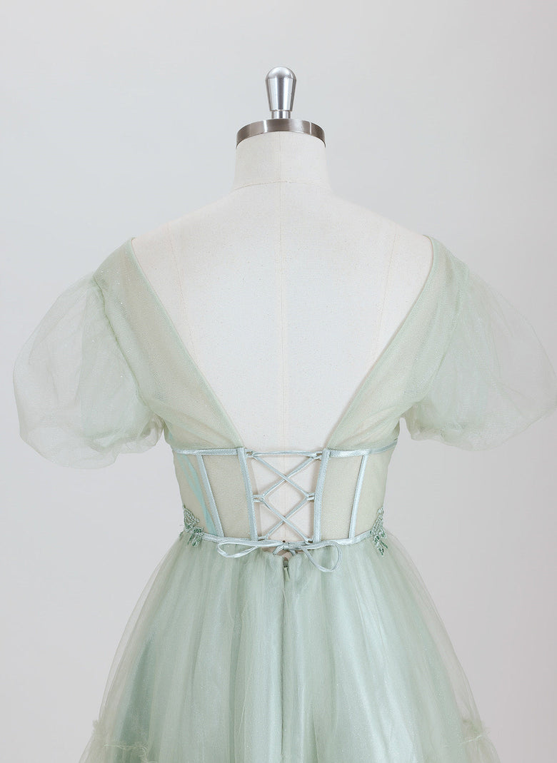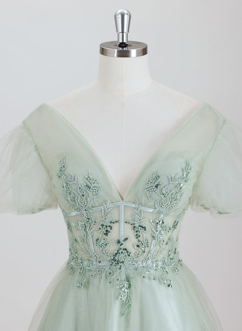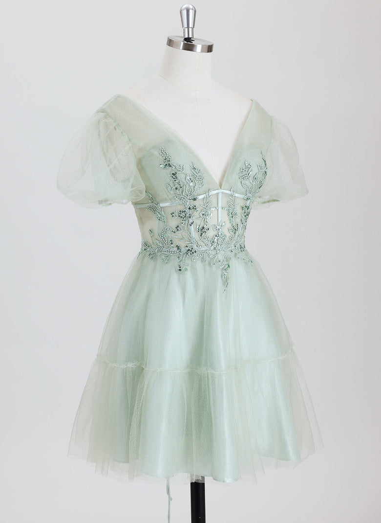 This elegant ball-gown style homecoming dress features a princess silhouette with delicate short sleeves and a short tulle skirt. Intricate appliques adorn the bodice, adding refined texture and visual interest. Designed for comfort and style, this dress offers a flattering fit that enhances your silhouette while allowing ease of movement, making it an ideal choice for memorable celebrations.