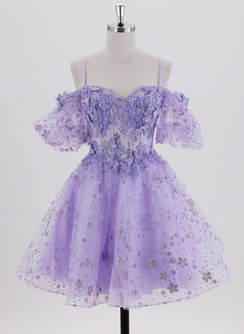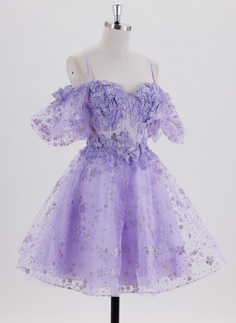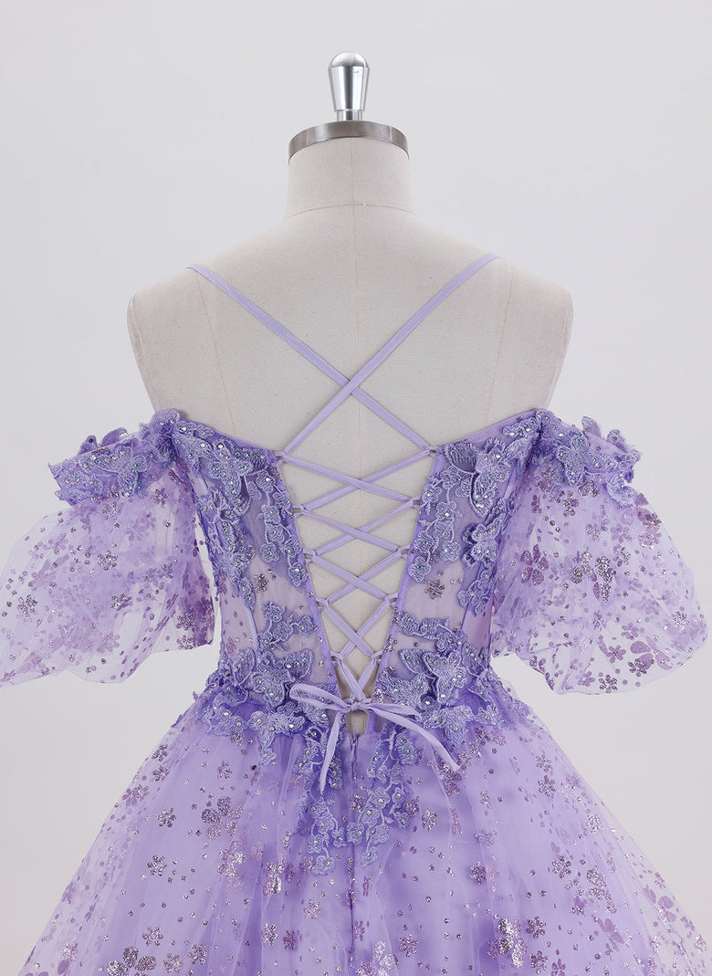 This homecoming dress features a short ball-gown silhouette crafted from delicate tulle, adorned with intricate appliques for an elegant touch. The crossed straps at the back provide both style and support, enhancing the princess-inspired design. Perfect for making a graceful statement at any special event.