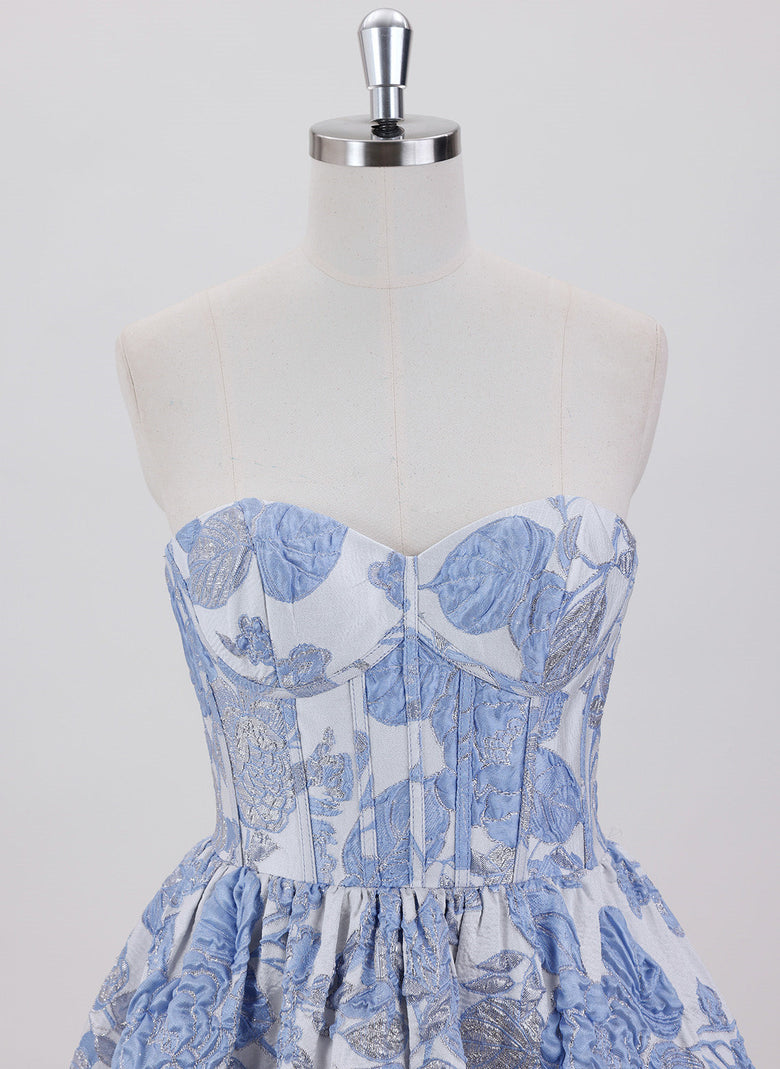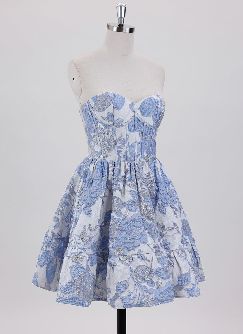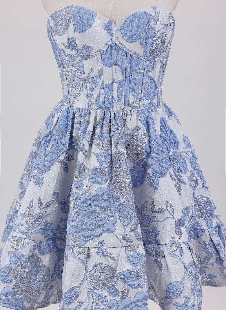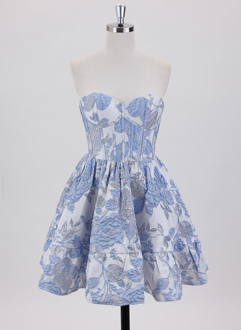 This sleeveless short homecoming dress features a classic ball-gown silhouette crafted from jacquard fabric, offering structured elegance and subtle texture. Designed to enhance your silhouette with a princess-style fit, it combines timeless charm with modern sophistication, making it an ideal choice for memorable events.