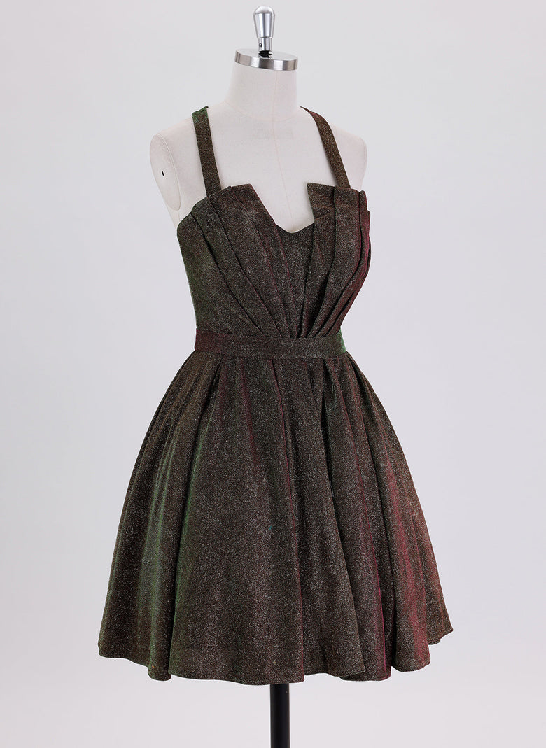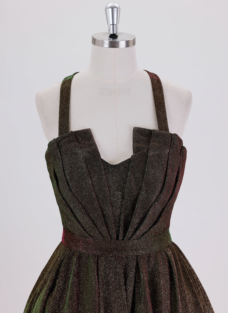 This sleeveless short homecoming dress features a metallic finish and a pleated design, combining elegance with modern style. Its ball-gown silhouette offers a flattering princess look, perfect for making a memorable entrance at any formal event. The lightweight fabric ensures comfort while maintaining a structured shape, ideal for dancing and socializing throughout the evening.