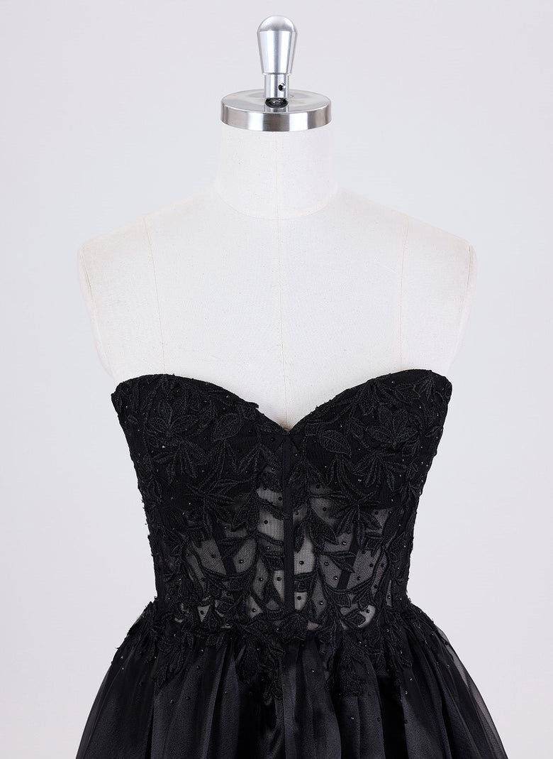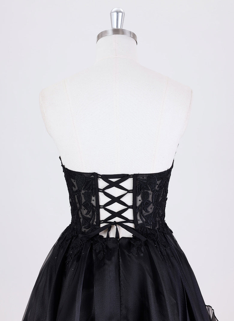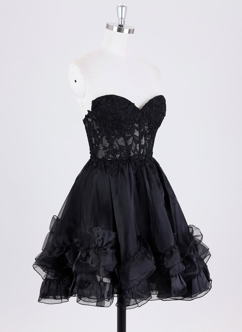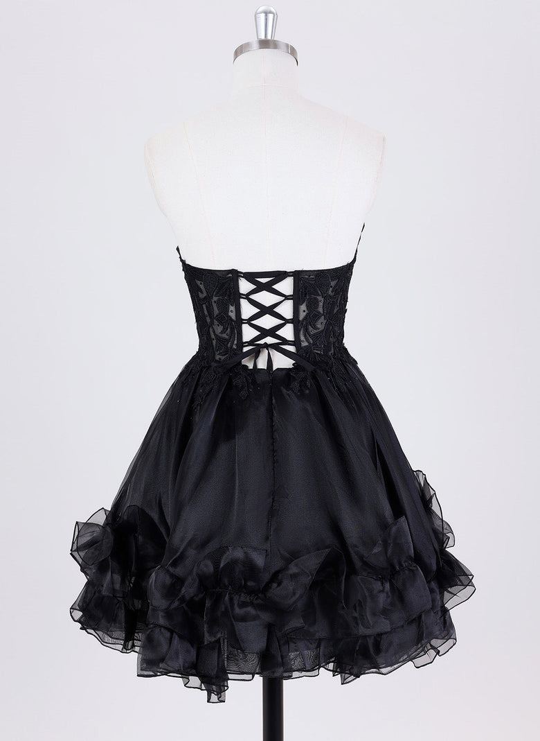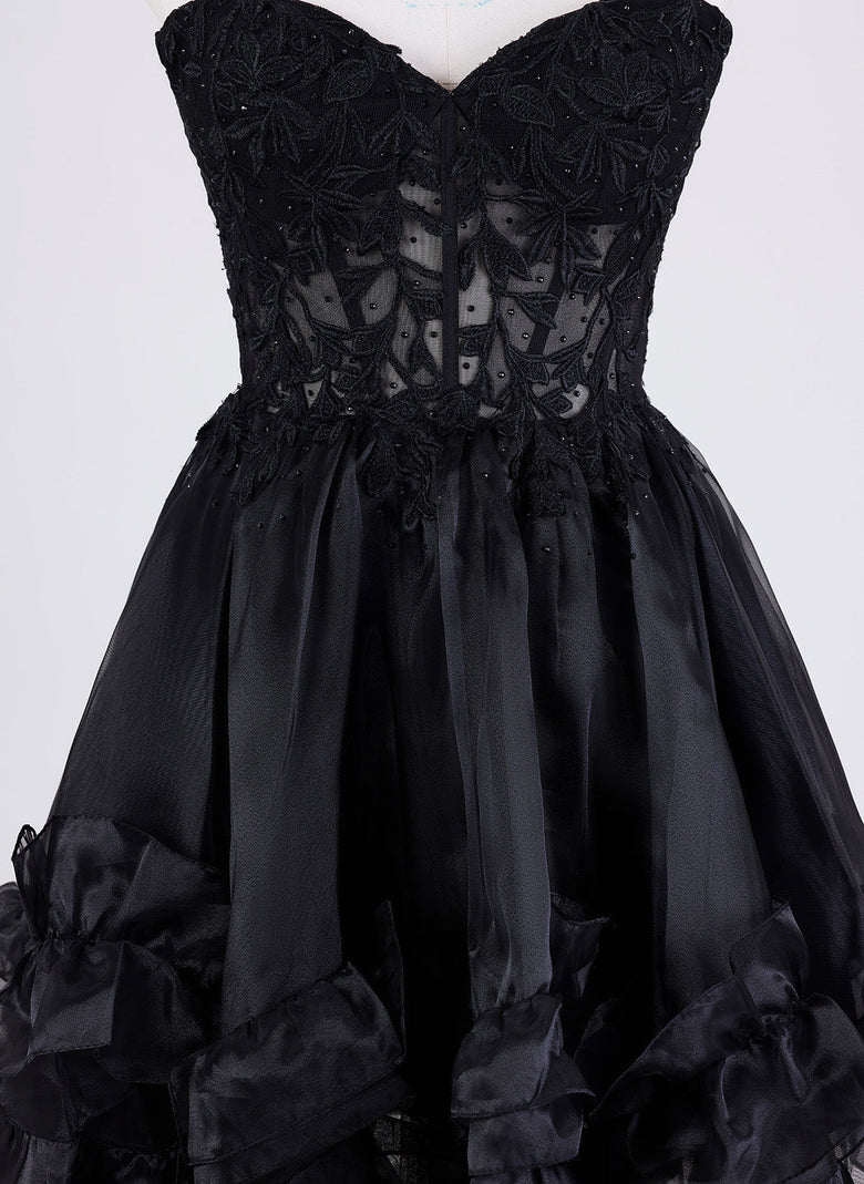 This sleeveless short homecoming dress features a classic ball-gown silhouette crafted from delicate organza, offering a lightweight and elegant feel. Adorned with sparkling rhinestones, it adds a refined touch of glamour. The ruffle tail detail enhances movement and visual interest, making it an ideal choice for formal events where sophistication and comfort are essential.