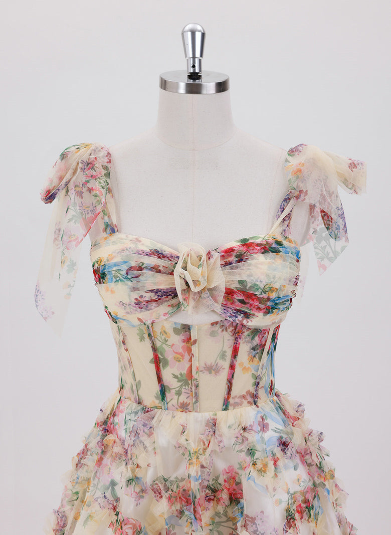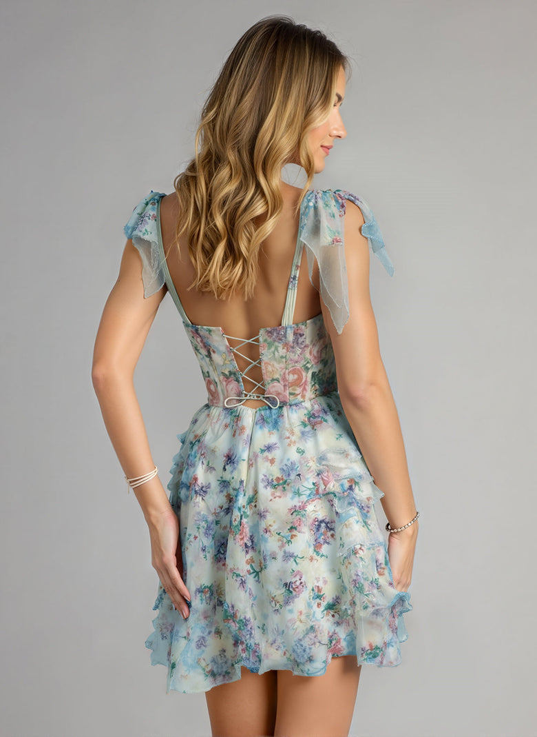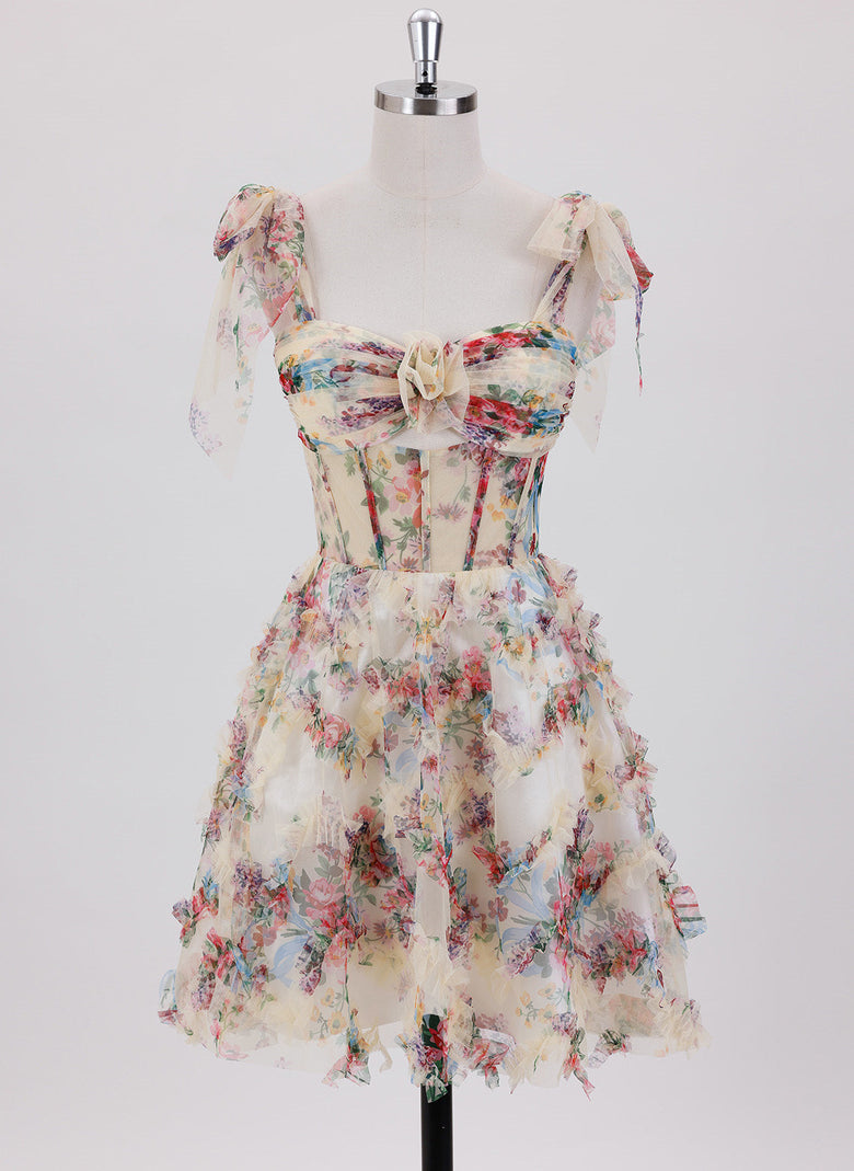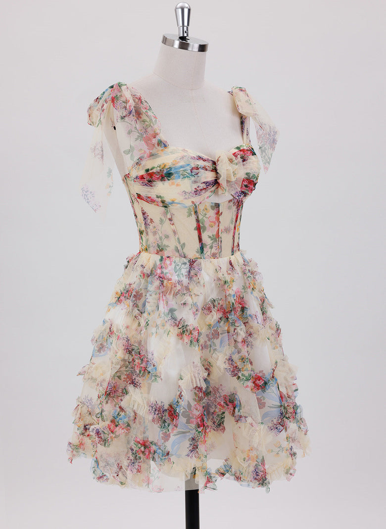 This sleeveless short tulle homecoming dress features a classic ball-gown silhouette with a princess-inspired design. The lightweight tulle fabric creates a soft, airy look, while the ruffle tie-back detail adds an elegant and adjustable fit. Perfect for making a graceful statement at any formal event, this dress combines timeless style with comfortable wearability.