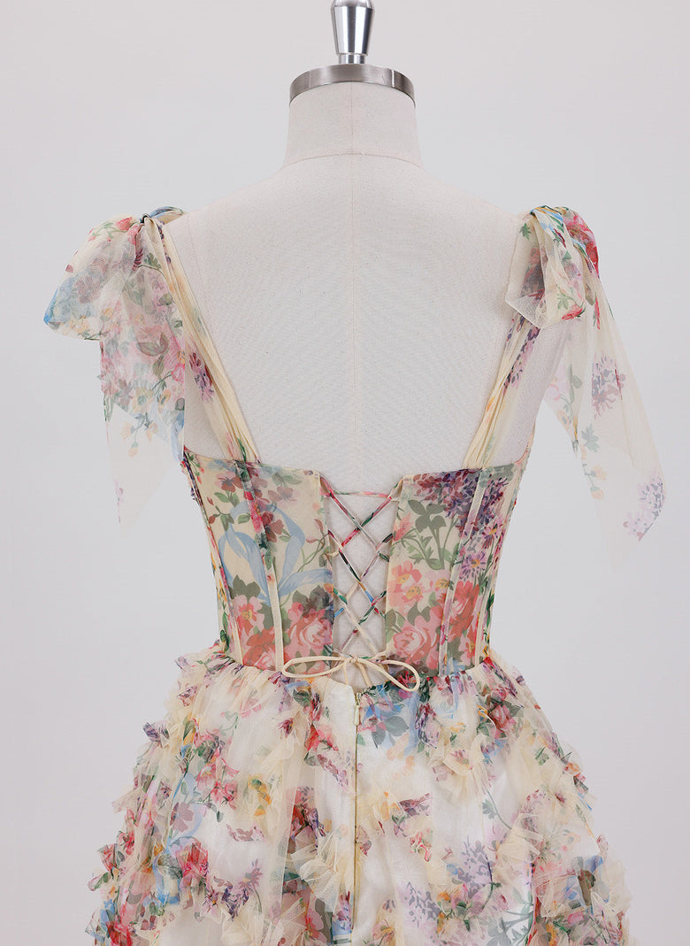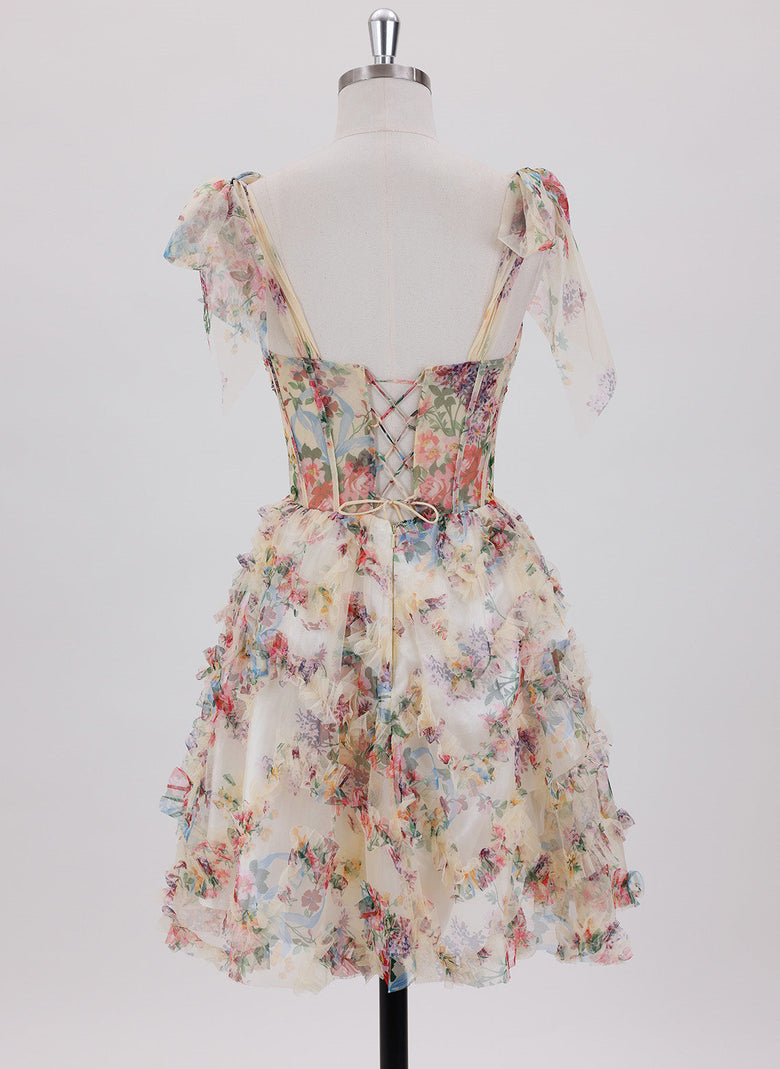 This sleeveless short tulle homecoming dress features a classic ball-gown silhouette with a princess-inspired design. The lightweight tulle fabric creates a soft, airy look, while the ruffle tie-back detail adds an elegant and adjustable fit. Perfect for making a graceful statement at any formal event, this dress combines timeless style with comfortable wearability.