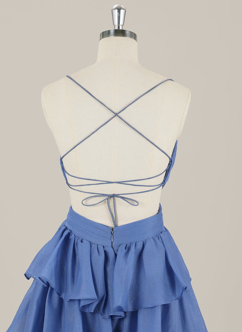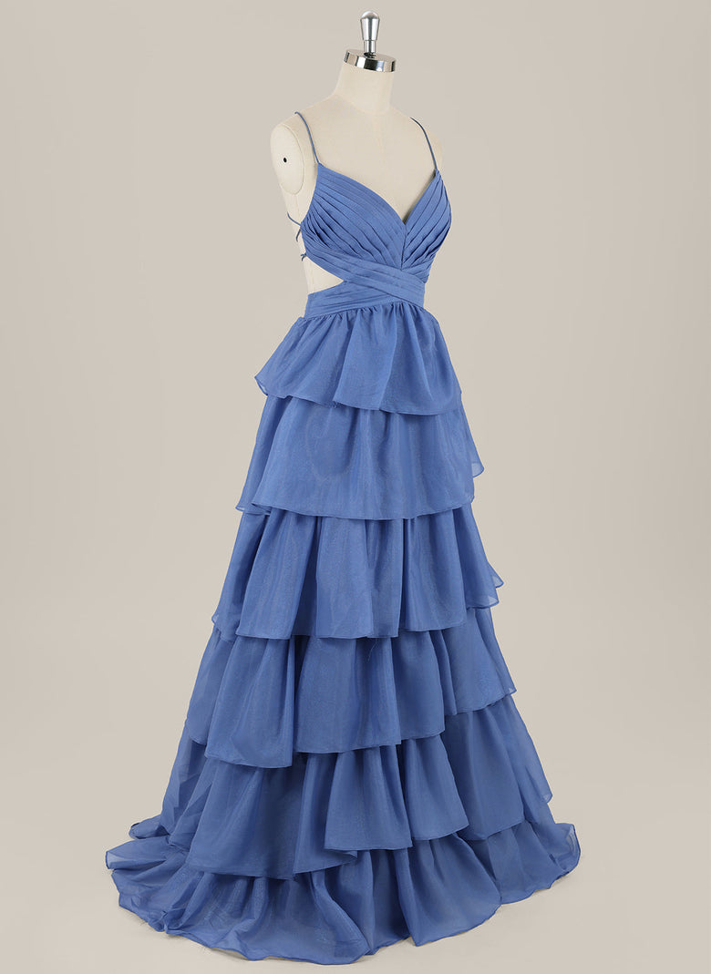 This elegant ball-gown maxi dress features a sleeveless design with a flattering V neckline and pleated, crossed straps at the back for added sophistication. Crafted from lightweight organza, it flows gracefully into a sweep train, creating a timeless princess silhouette perfect for formal occasions. The combination of delicate pleating and structured fabric ensures both comfort and a refined appearance.