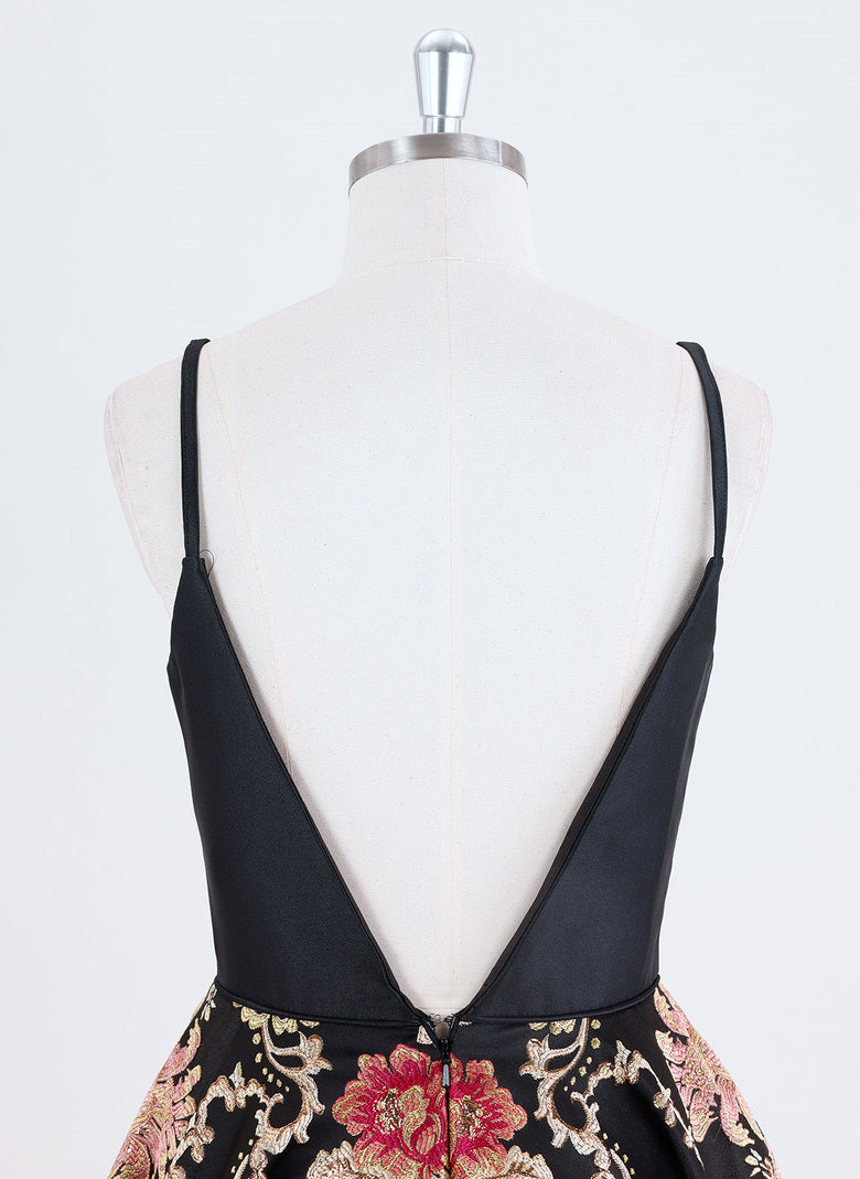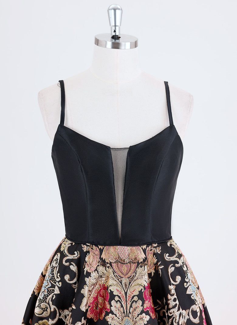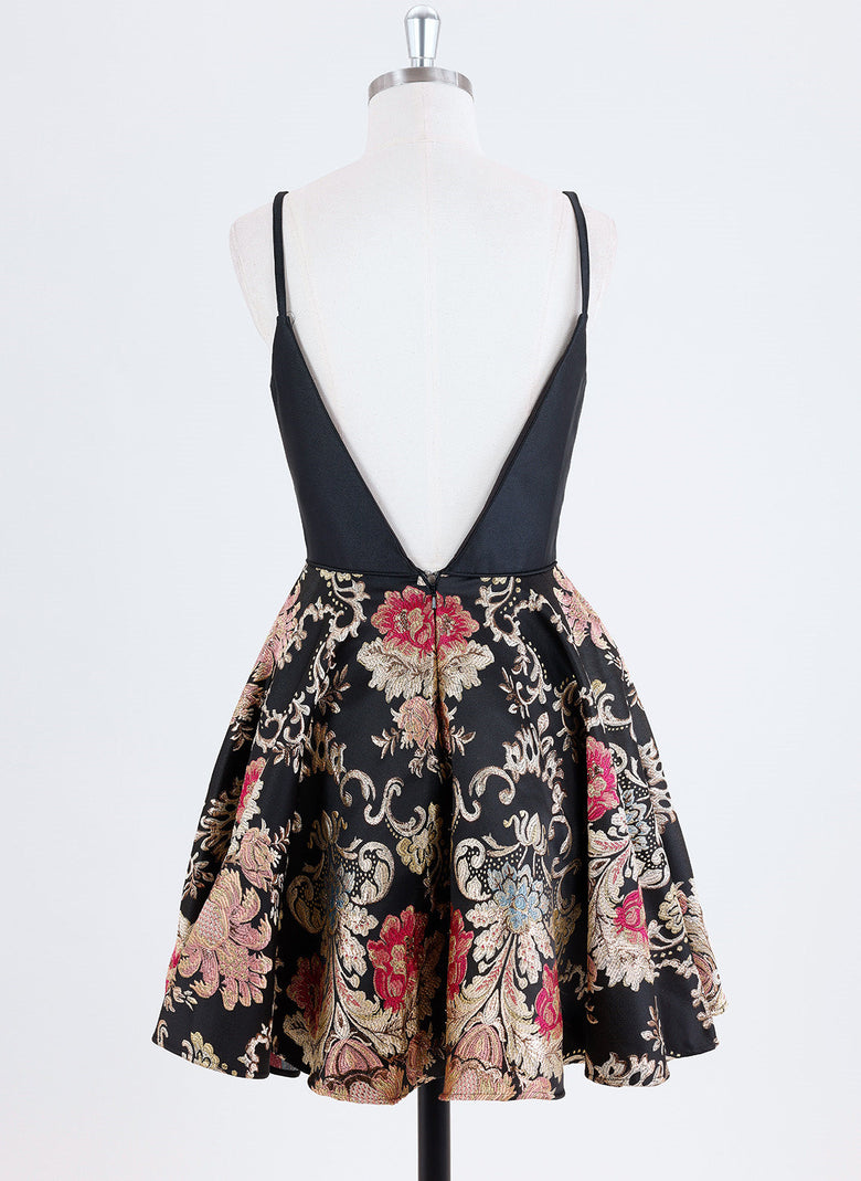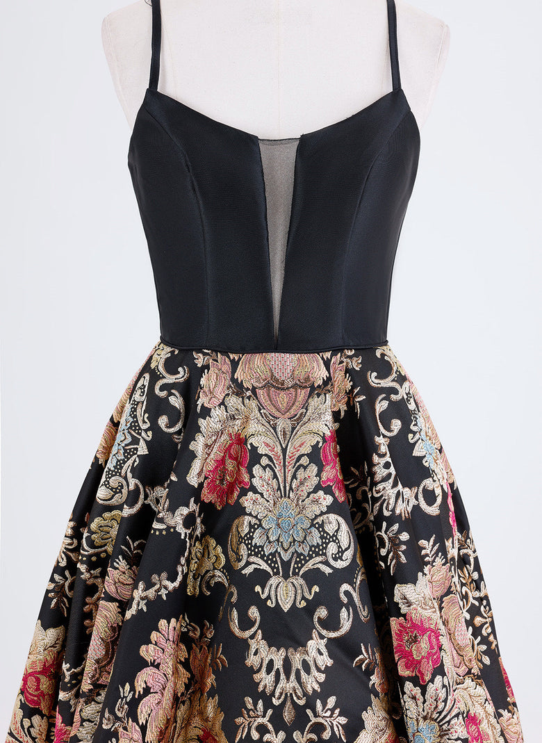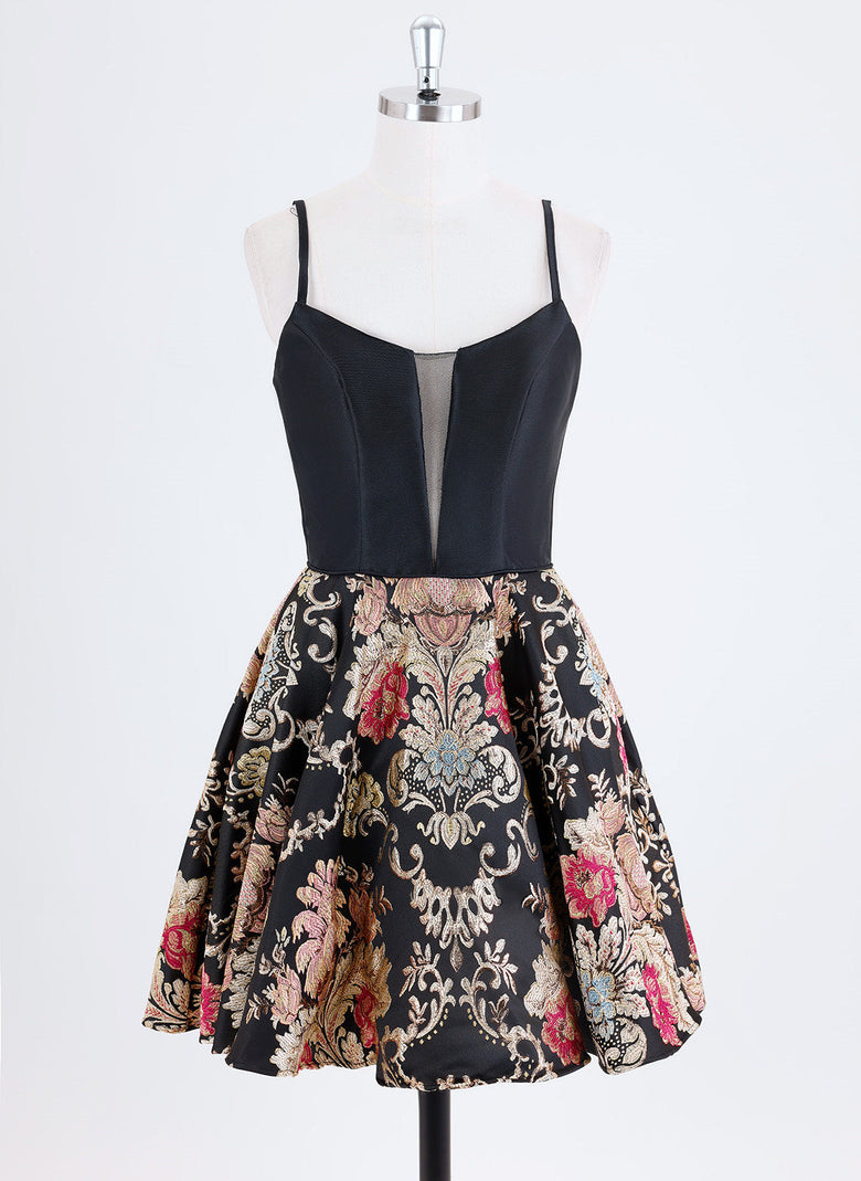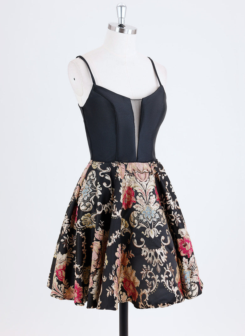 This elegant short homecoming dress features a classic ball-gown silhouette with delicate spaghetti straps, crafted from luxurious jacquard fabric. Its open V-back design adds a sophisticated touch, balancing charm and modern style. Perfect for making a memorable entrance, this dress combines timeless princess appeal with contemporary details for an expert-approved look.