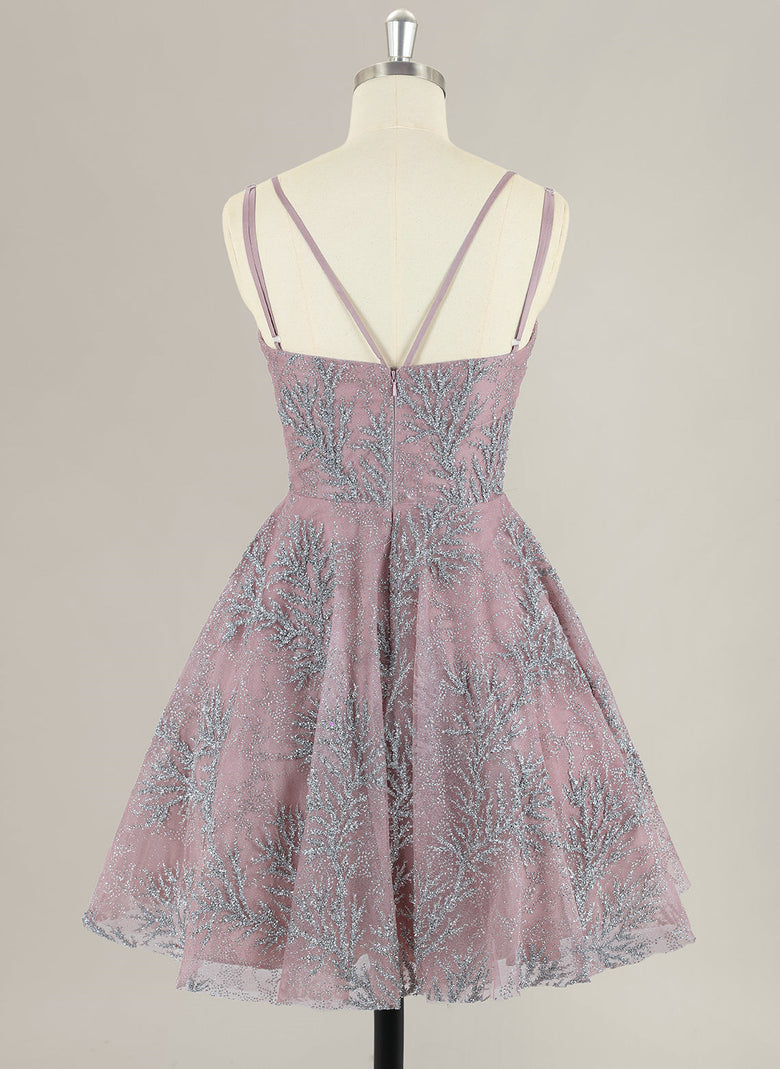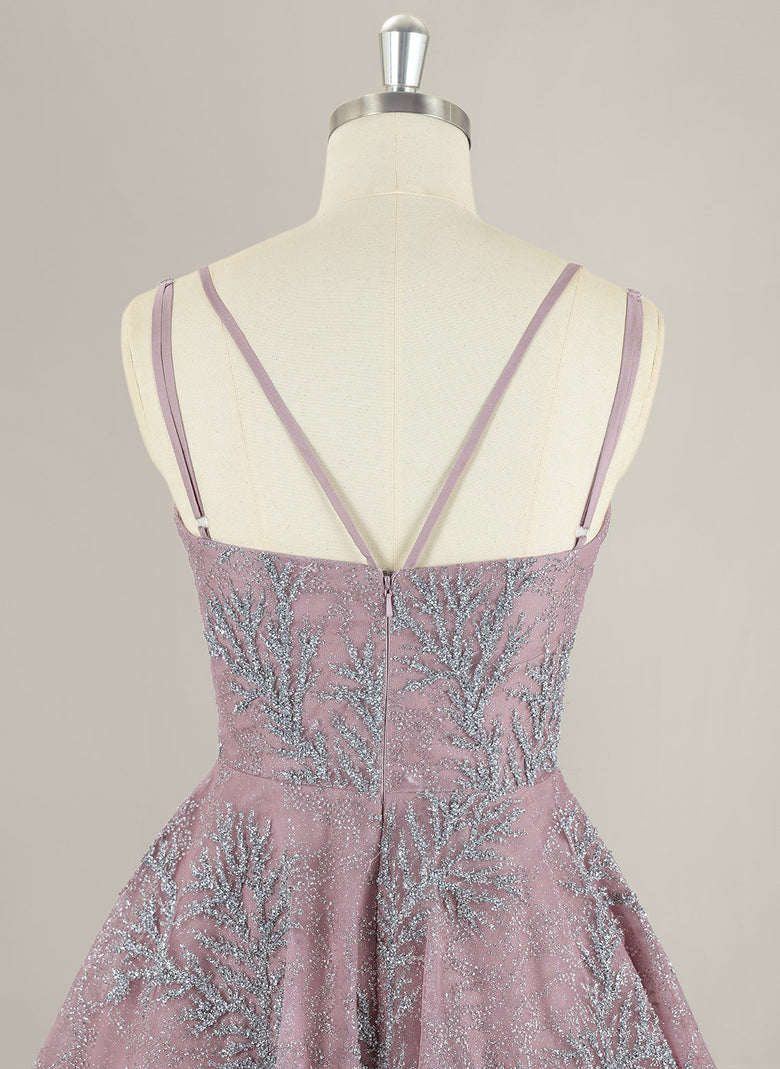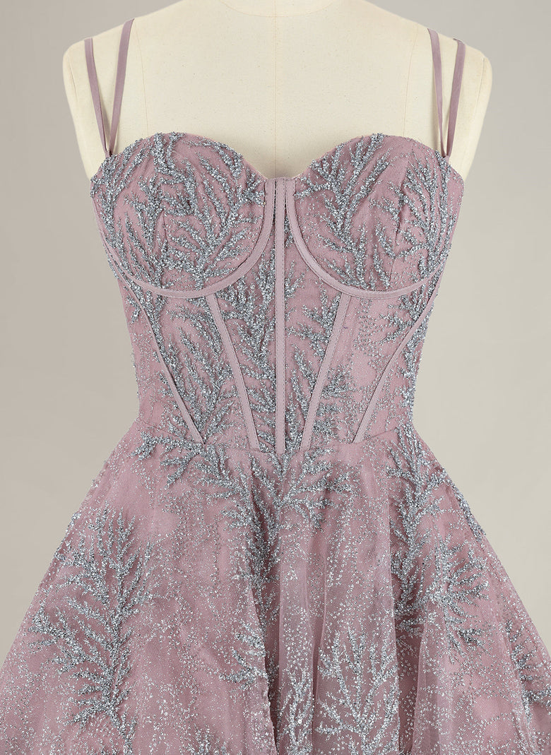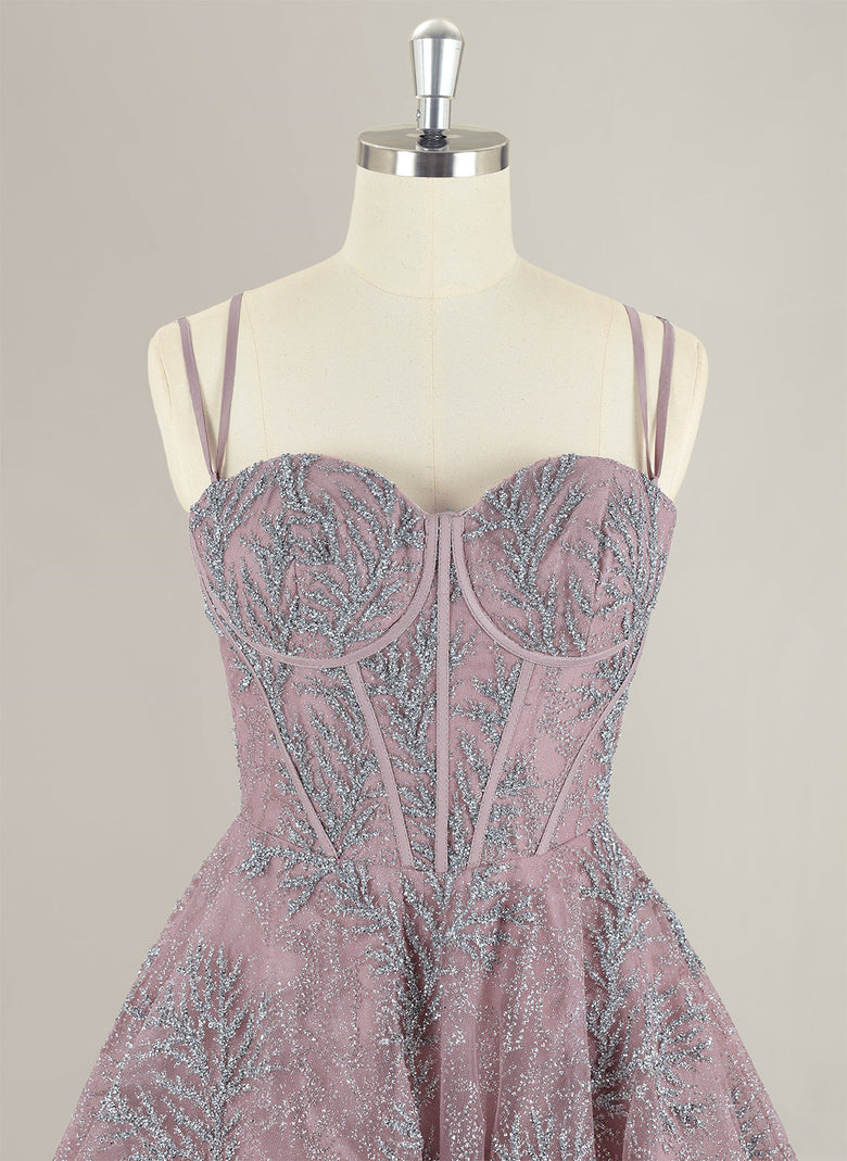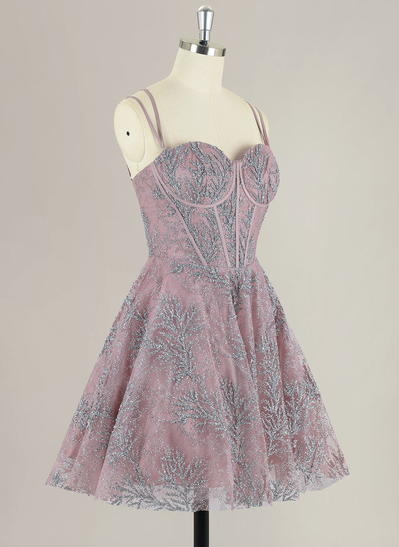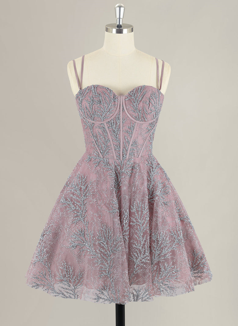 This short homecoming dress features a classic ball-gown silhouette with a princess flair, enhanced by delicate spaghetti straps and a flattering sweetheart neckline. Adorned with shimmering sequins, it offers a sophisticated sparkle perfect for special occasions. The design balances elegance and youthful charm, making it an excellent choice for memorable events.