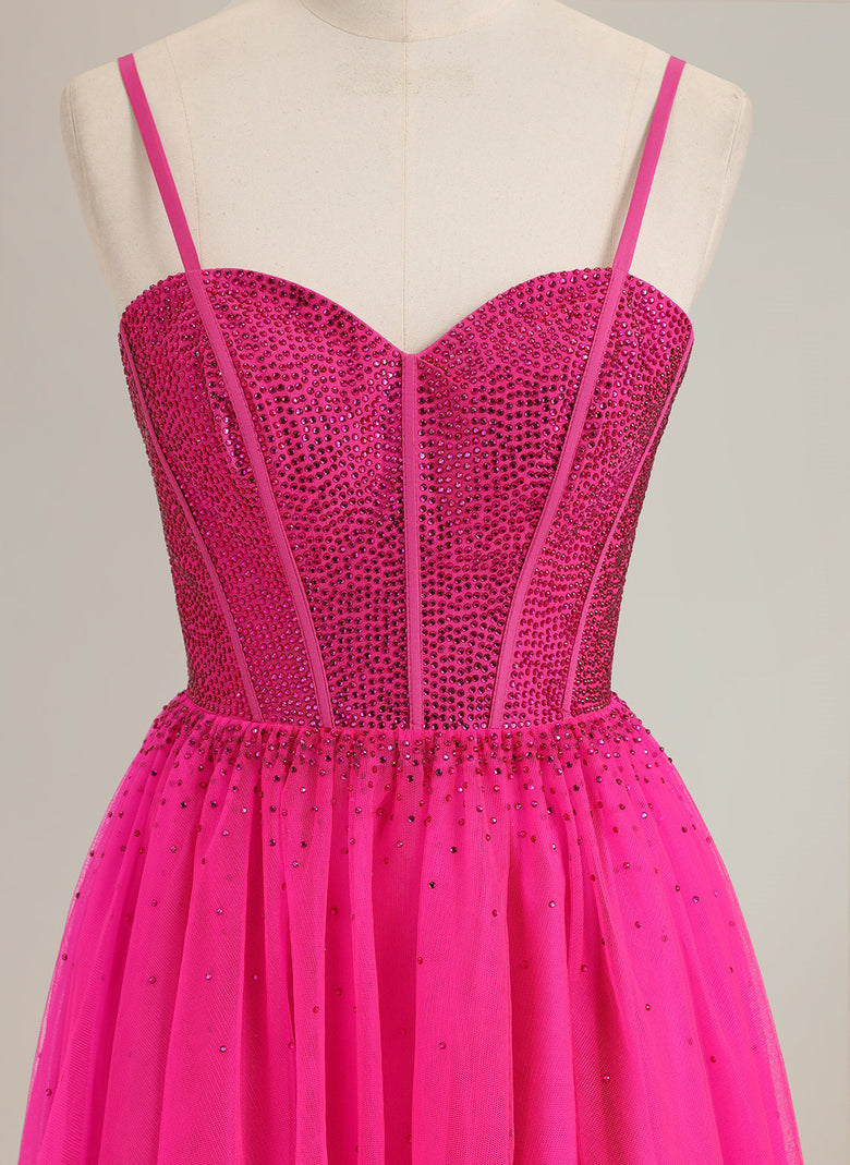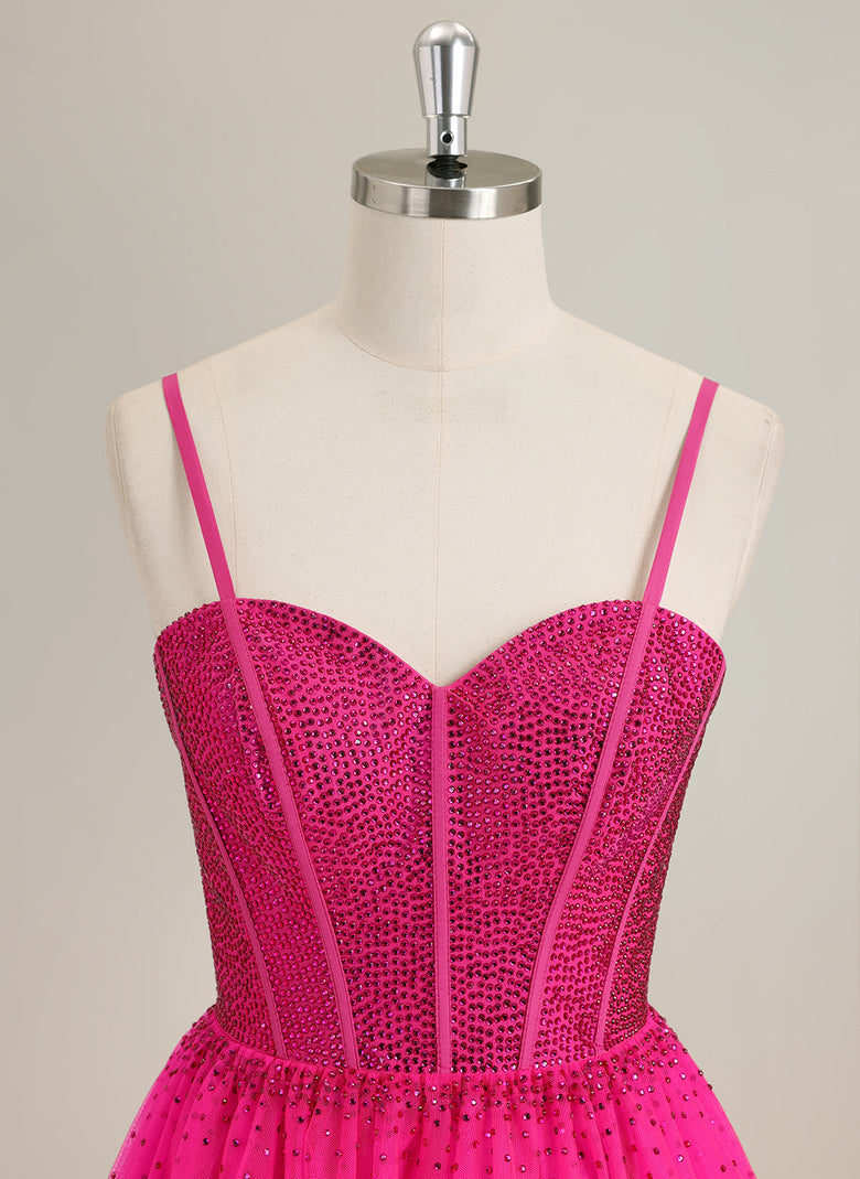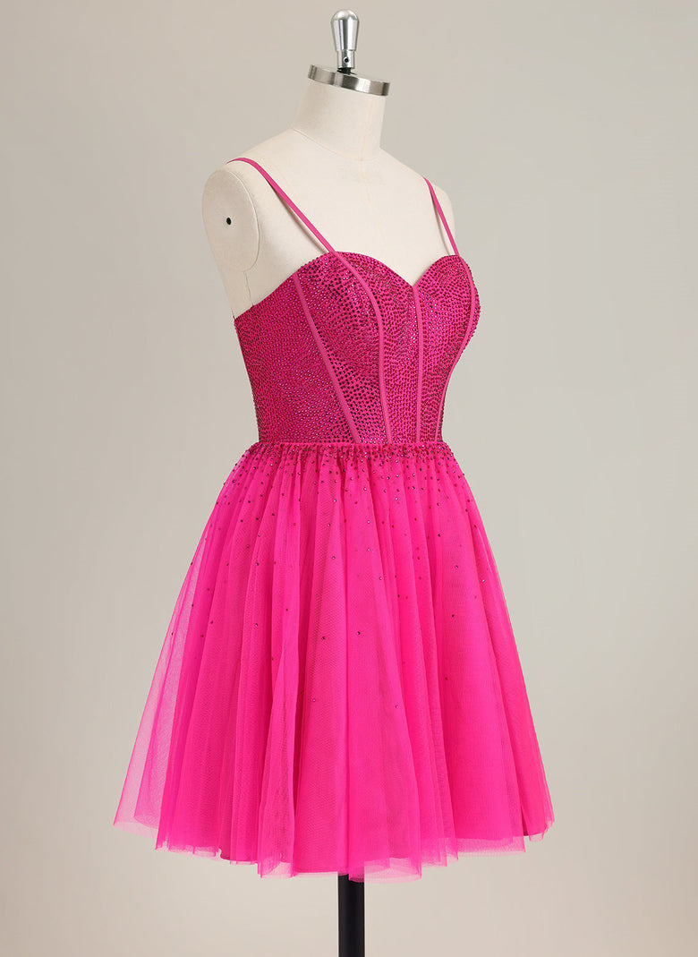 This short tulle homecoming dress features a classic ball-gown silhouette with delicate spaghetti straps, offering a flattering and elegant fit. Adorned with sparkling rhinestones, it adds a touch of refined glamour perfect for special occasions. The lightweight tulle fabric ensures comfort and movement, making it an ideal choice for memorable evenings.
