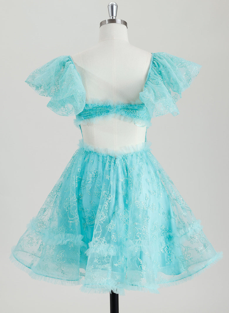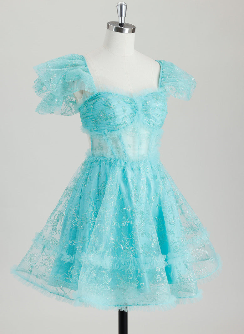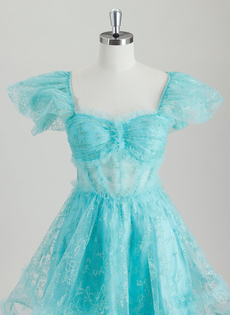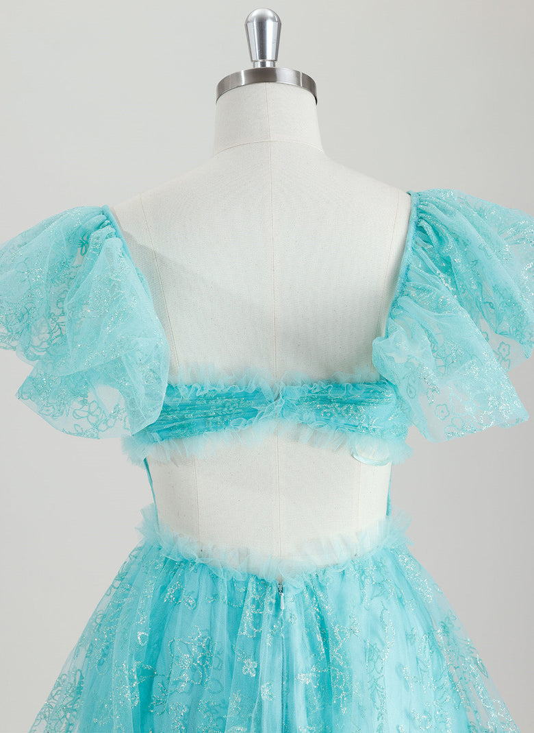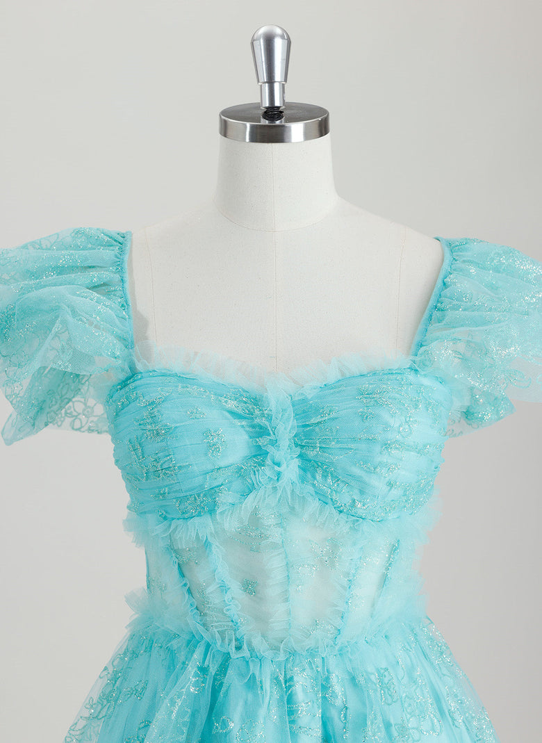 This Ball-Gown/Princess Square Short Tulle Homecoming Dress features a structured square neckline that frames the shoulders elegantly. The voluminous tulle skirt is enhanced with delicate ruffle detailing, adding texture and movement to the classic princess silhouette. Its short length offers comfort and ease of movement, making it a refined and playful choice for homecoming events.