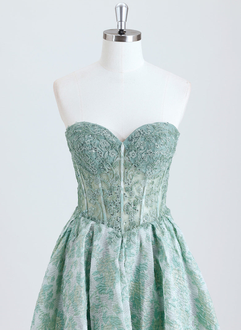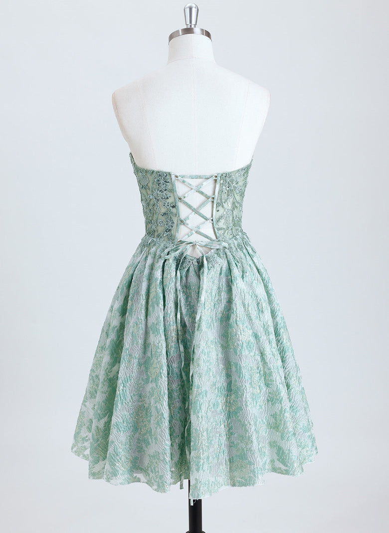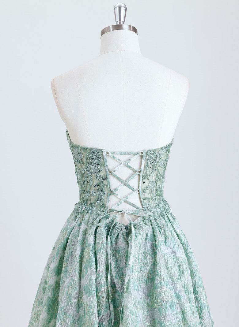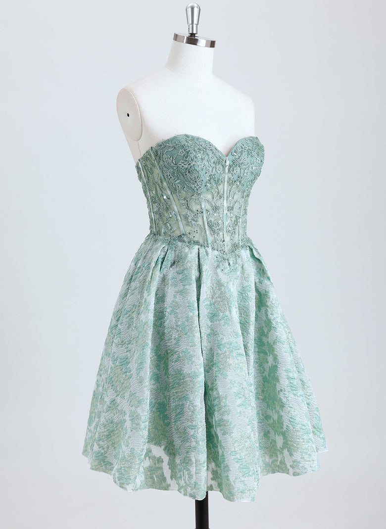 This Ball-Gown/Princess Sweetheart Short Jacquard Homecoming Dress features intricate sequins appliques and delicate lace detailing, elevating its elegant design. The jacquard fabric provides a refined texture and structured fit, while the sweetheart neckline enhances femininity. Its short length offers both style and comfort, making it ideal for homecoming events where you want to stand out with sophistication and sparkle.