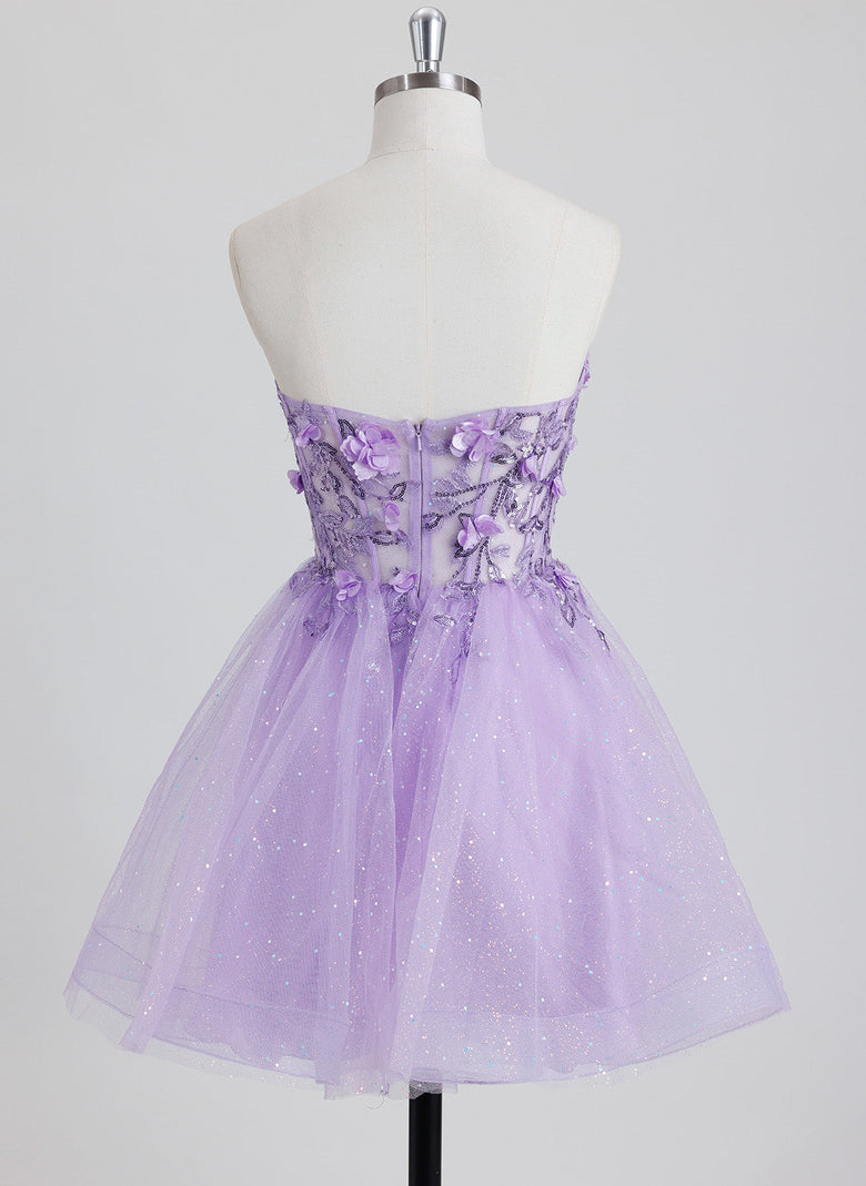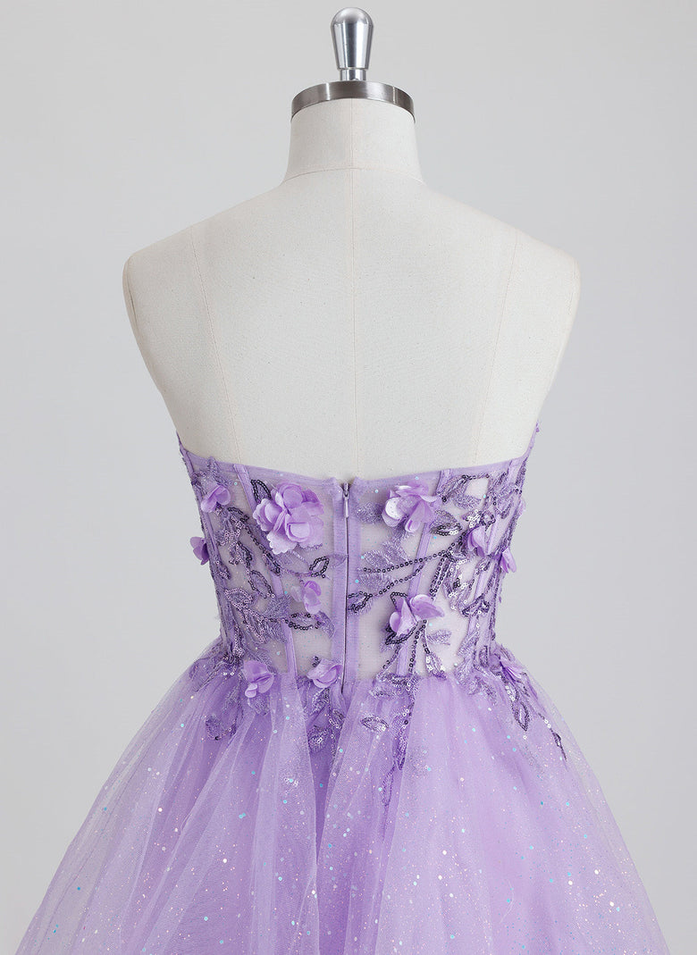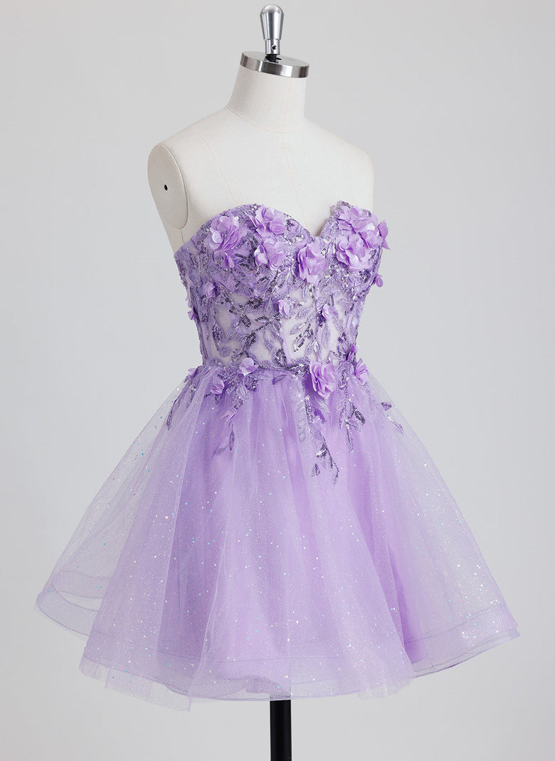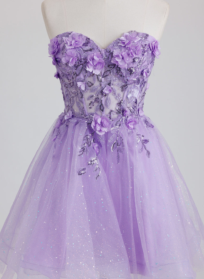 This short ball-gown homecoming dress features a sweetheart neckline and a princess silhouette crafted from delicate tulle. Adorned with intricate 3D floral sequins, it adds texture and dimension for a captivating, elegant look. Combining romantic details with a comfortable fit, this dress is designed to make a memorable impression at your special event.