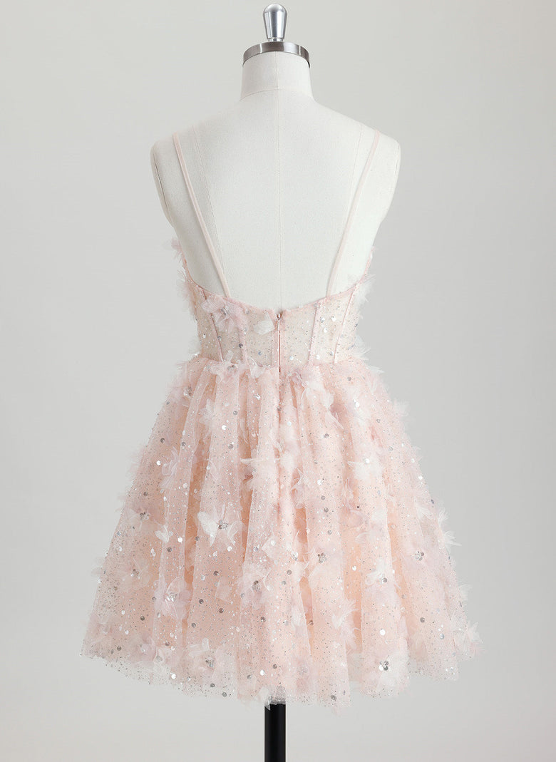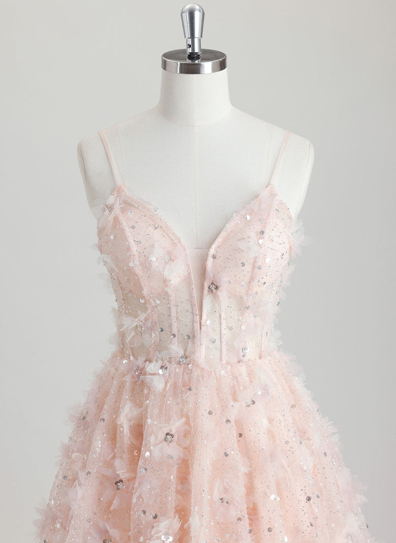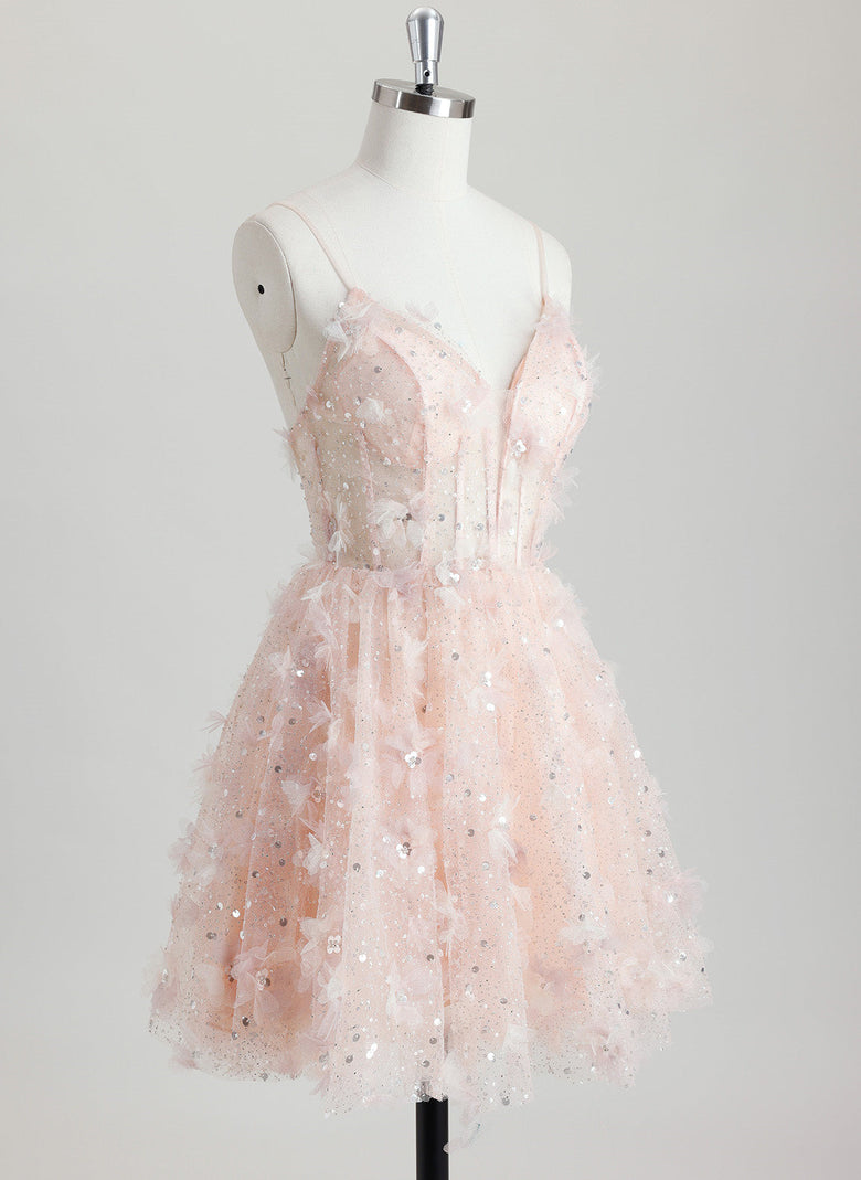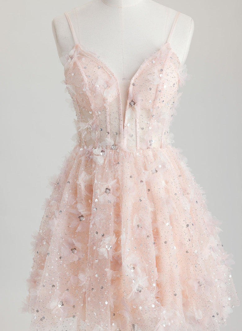 This Ball-Gown/Princess V-Neck Short Tulle Homecoming Dress showcases exquisite beading and 3D floral sequins that add depth and shimmer to its delicate design. The V-neckline elegantly frames the face, while the short tulle skirt creates a light, airy silhouette perfect for movement and comfort. Combining intricate embellishments with a classic shape, this dress is ideal for making a sophisticated and memorable impression at any homecoming event.
