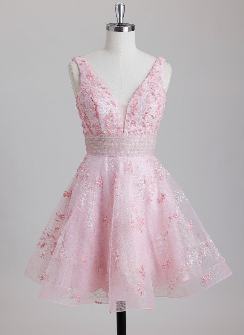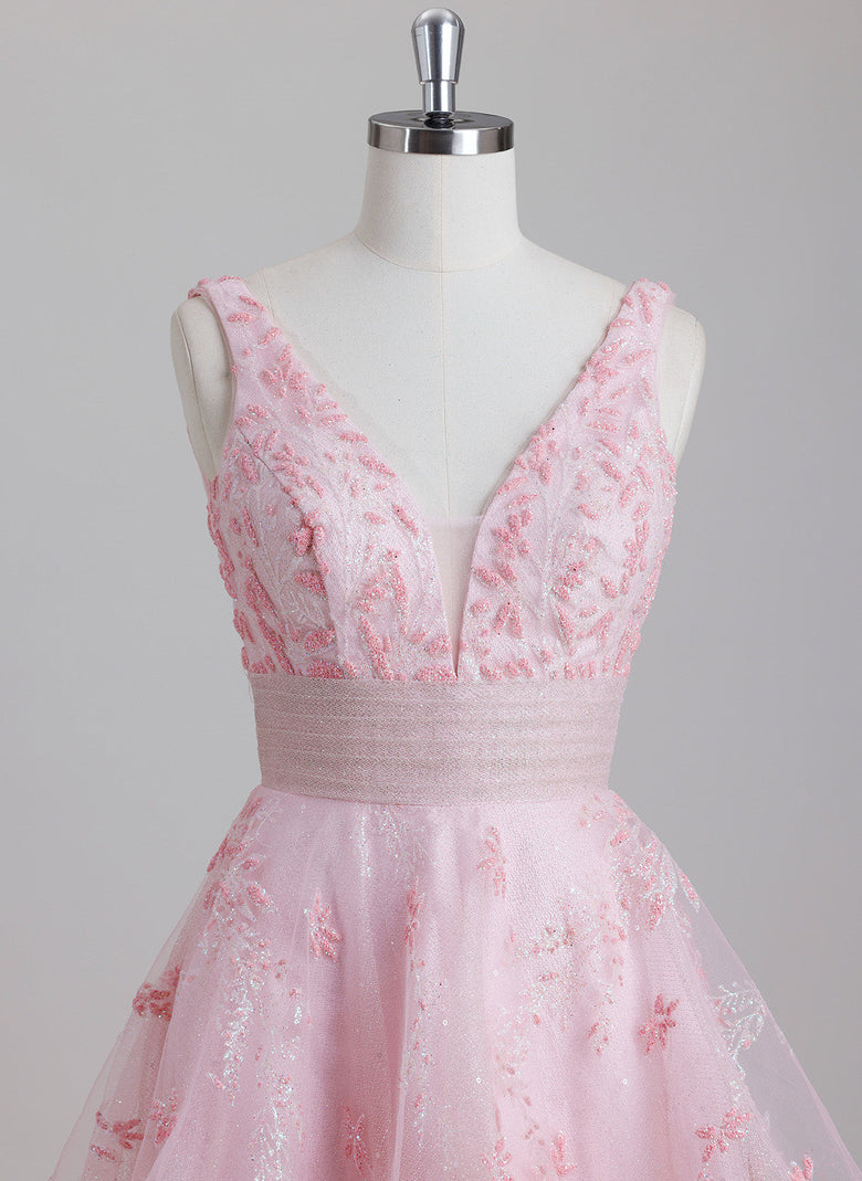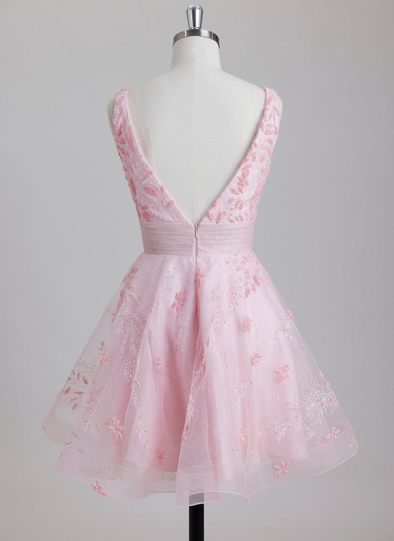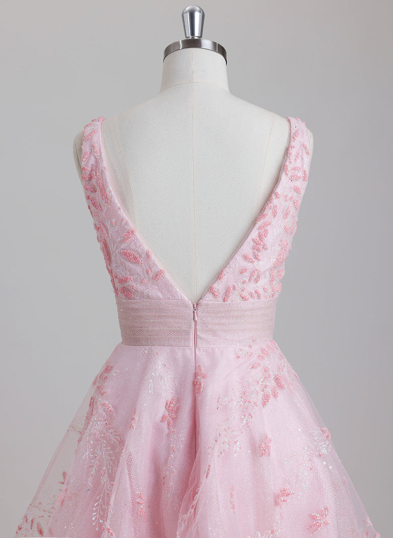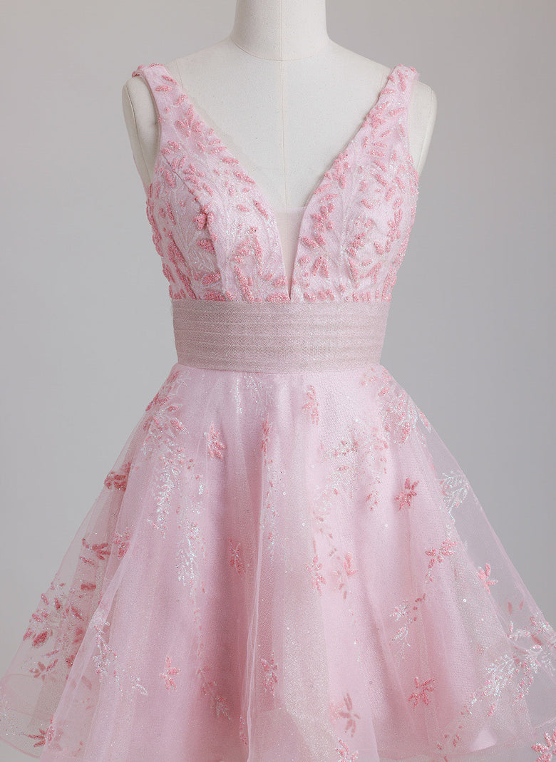 This short ball-gown homecoming dress features a classic V-neckline and a princess silhouette crafted from lightweight tulle. Its design balances timeless elegance with youthful charm, offering a graceful look that moves beautifully. Ideal for those seeking a refined yet comfortable dress to shine at any special occasion.