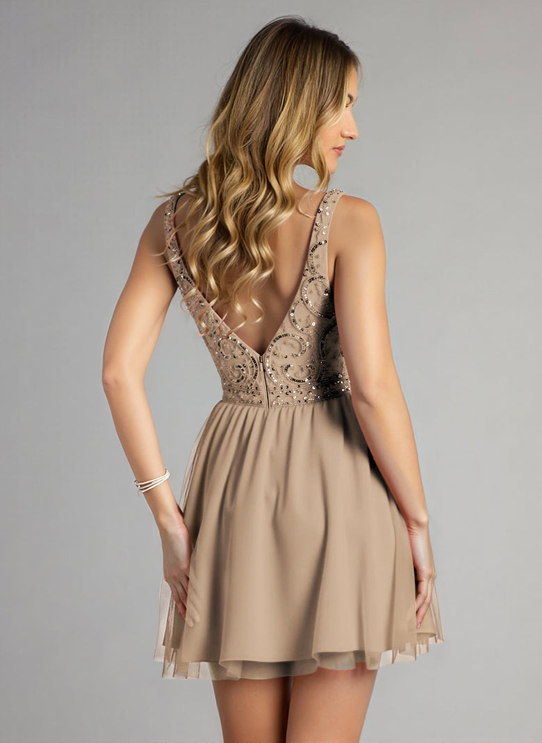 This short ball-gown homecoming dress features a flattering V-neckline and a princess silhouette crafted from soft tulle. Embellished with sequins, it offers a subtle shimmer that enhances its romantic appeal. Designed to combine timeless elegance with youthful charm, this dress ensures a graceful presence and comfortable wear throughout your special occasion.