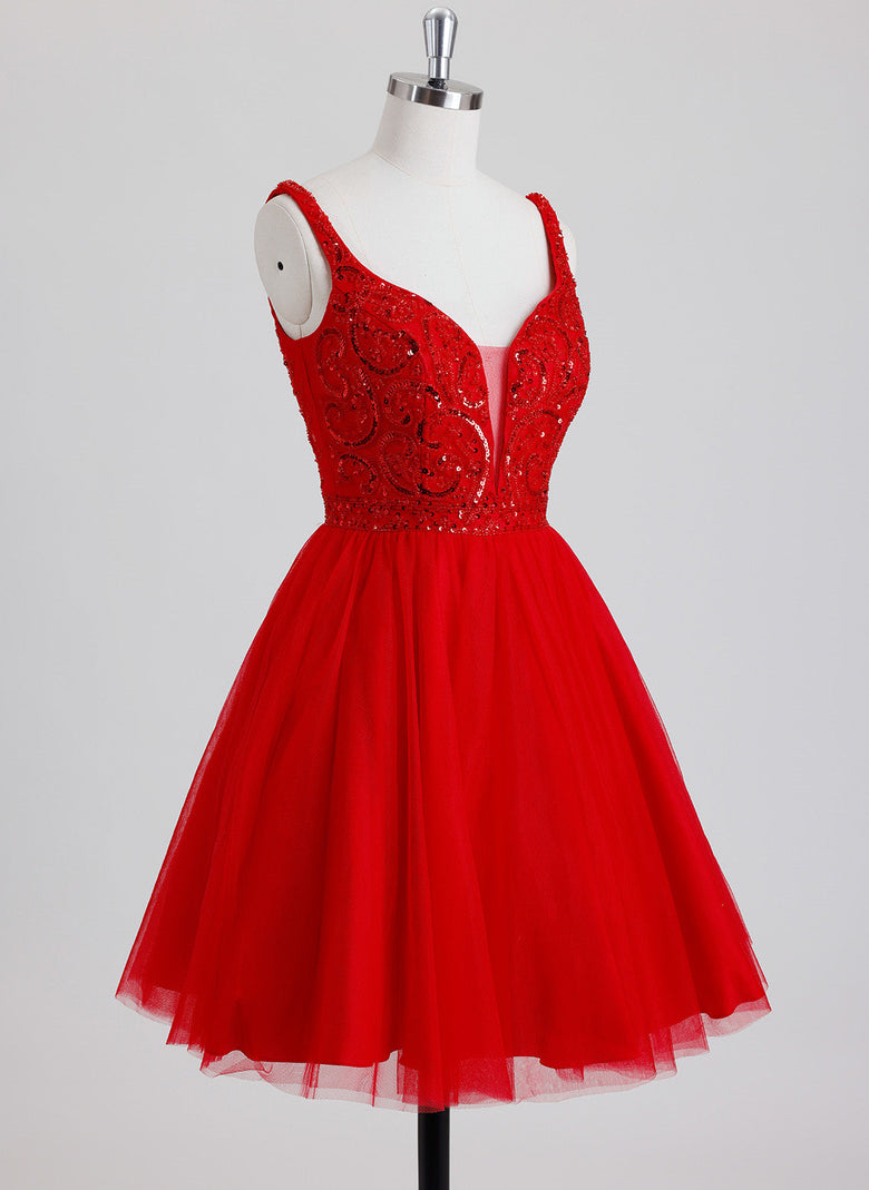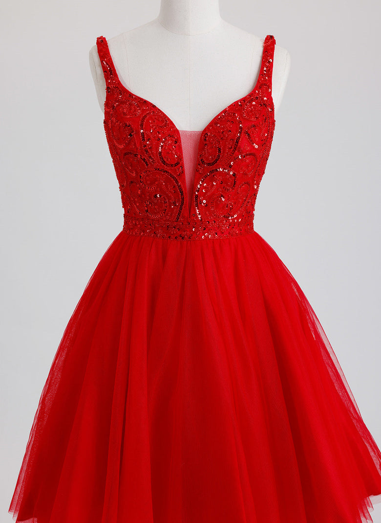 This short ball-gown homecoming dress features a flattering V-neckline and a princess silhouette crafted from soft tulle. Embellished with sequins, it offers a subtle shimmer that enhances its romantic appeal. Designed to combine timeless elegance with youthful charm, this dress ensures a graceful presence and comfortable wear throughout your special occasion.