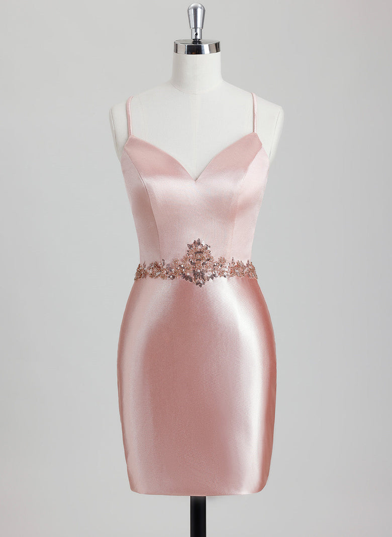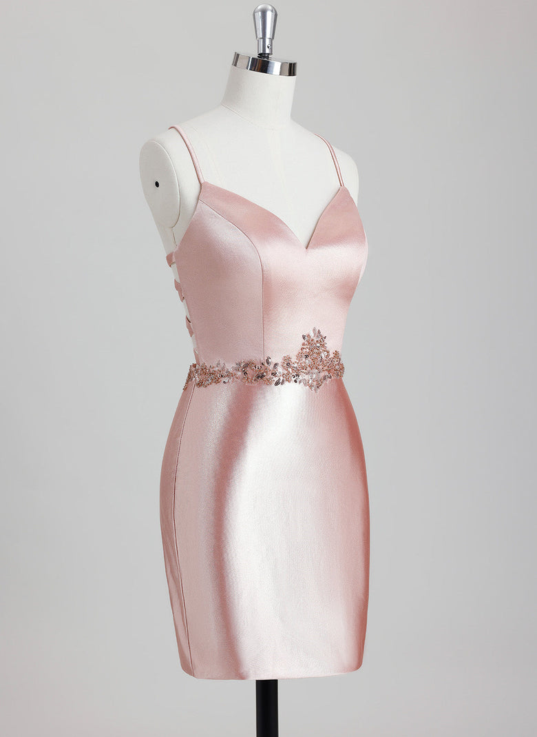 This Bodycon V-Neck Short Satin Homecoming Dress combines a sleek, figure-flattering silhouette with luxurious satin fabric. The V-neckline enhances the décolletage, while intricate beading and sequins add refined sparkle and texture. Its short length ensures comfort and ease of movement, making it an elegant and stylish choice for homecoming events.