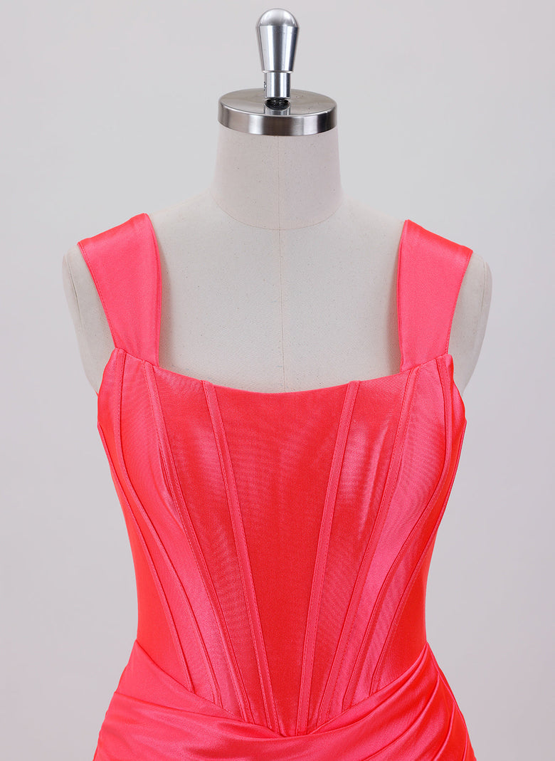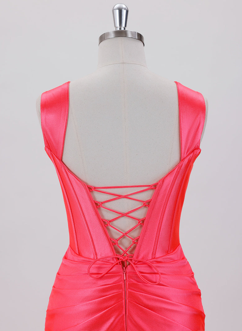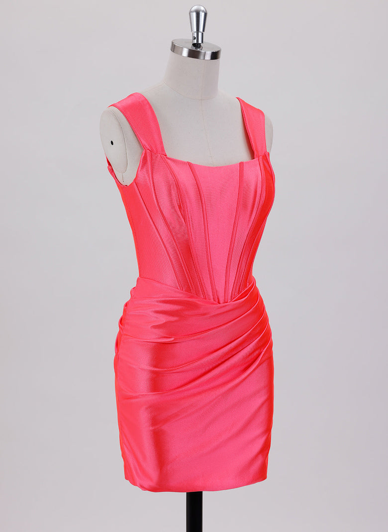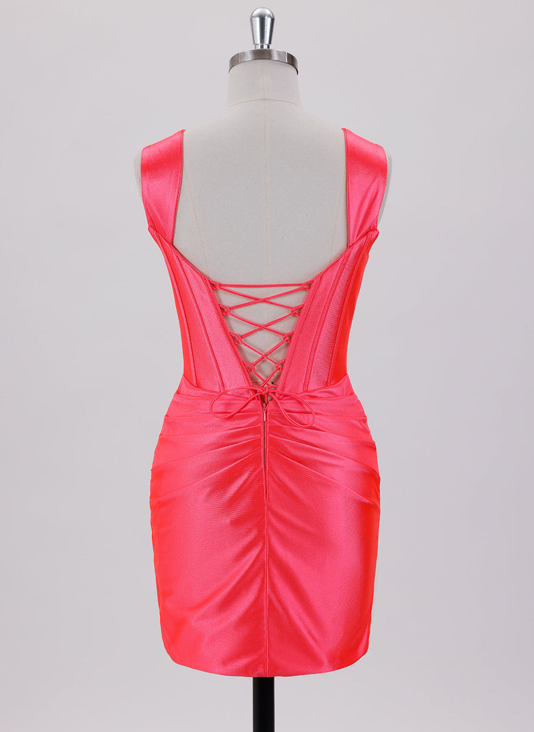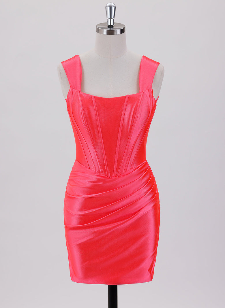 This sheath column short dress is crafted from soft jersey fabric, offering a comfortable and flattering fit for homecoming events. Its pleated design adds subtle texture, while the crossed straps at the back create an elegant and sophisticated look. Ideal for those seeking a blend of modern style and classic silhouette, this dress ensures both ease of movement and refined appeal.