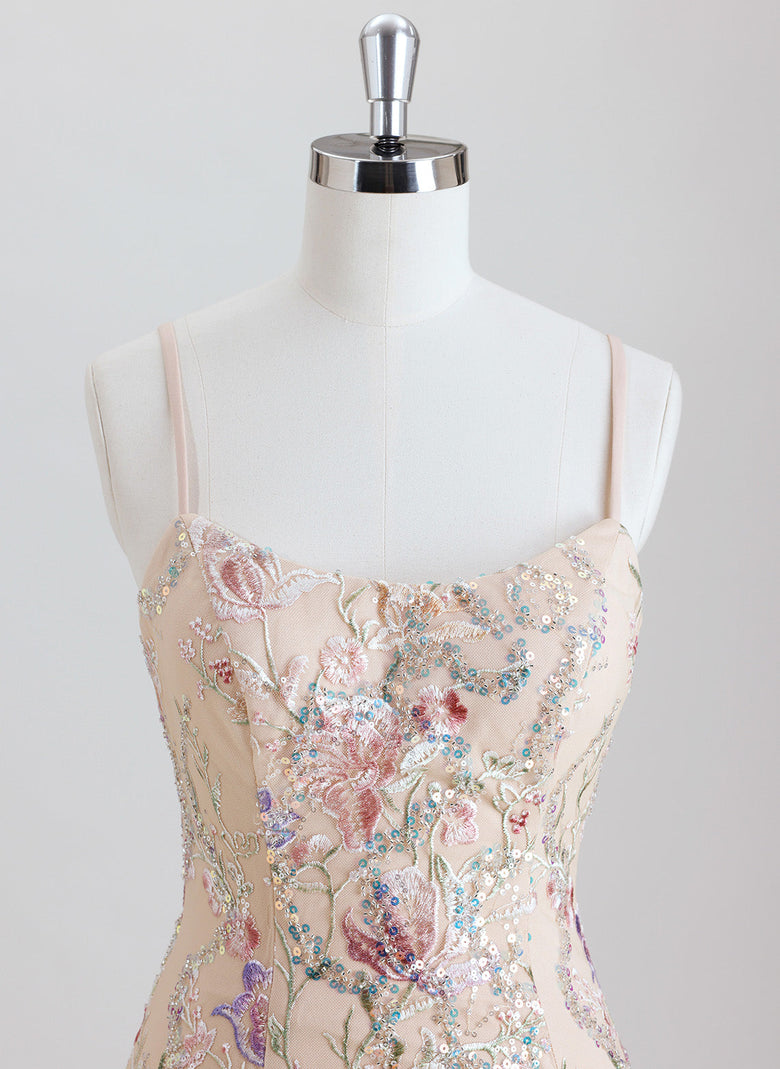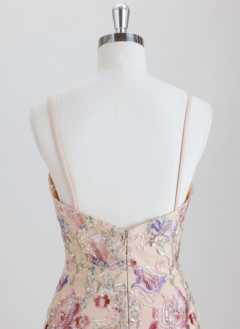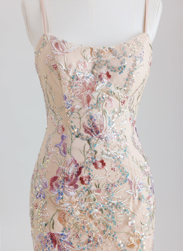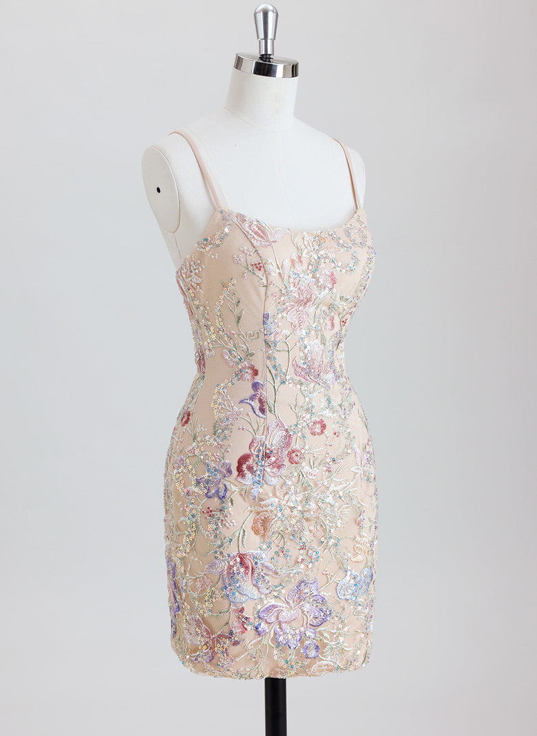 This short sheath dress features intricate lace detailing enhanced with delicate beading and sequins, creating a refined and elegant look perfect for homecoming events. Its column silhouette offers a flattering fit that complements your figure while ensuring comfort throughout the evening. Ideal for those seeking a sophisticated yet youthful style, this dress combines classic craftsmanship with subtle sparkle to make a memorable impression.