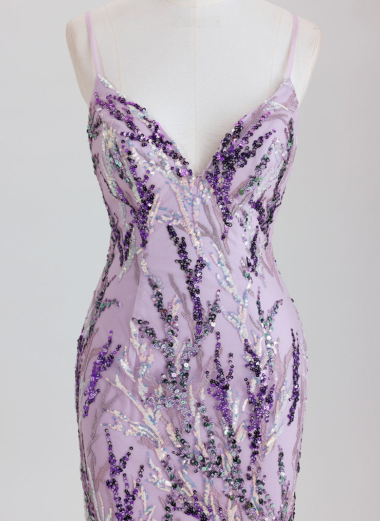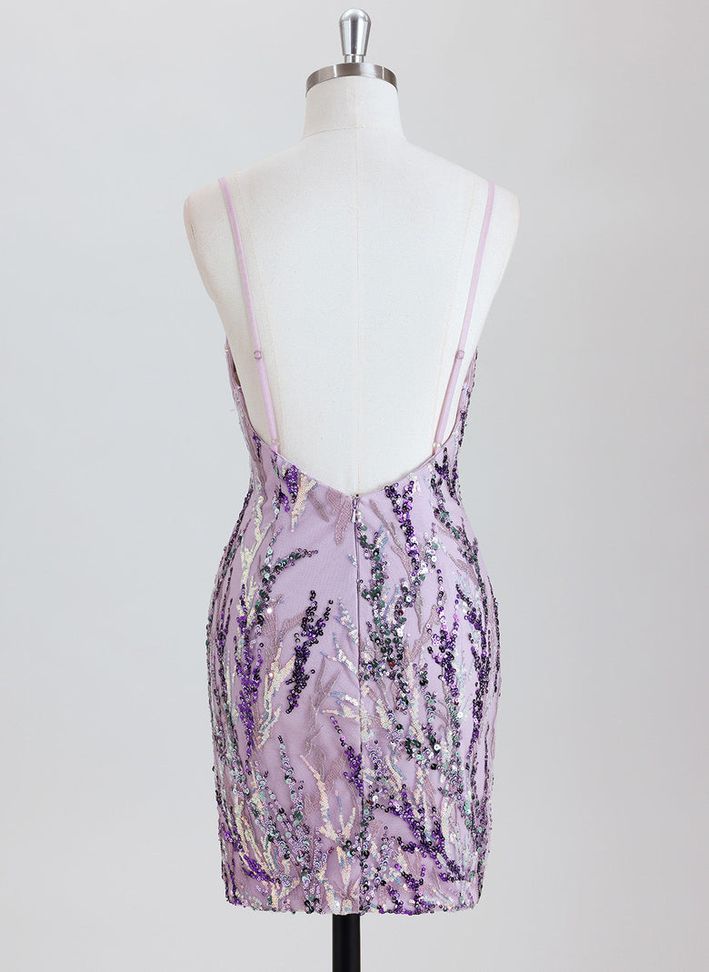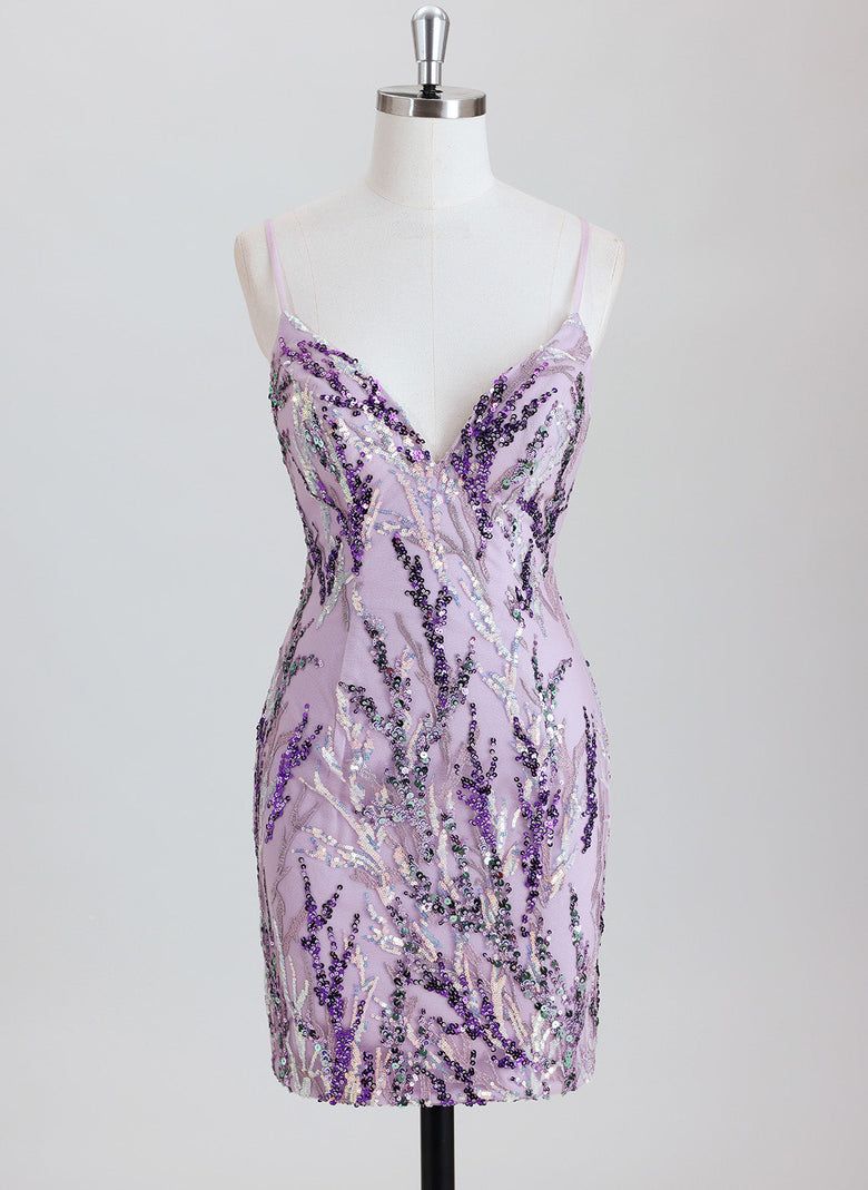 This sheath-style short homecoming dress features a delicate lace overlay and a flattering V-neckline, enhanced with subtle sequins for a touch of sparkle. Its column silhouette offers a sleek, elegant fit, perfect for making a sophisticated statement at any event. Crafted to combine comfort with style, this dress is ideal for those seeking refined glamour in a compact design.