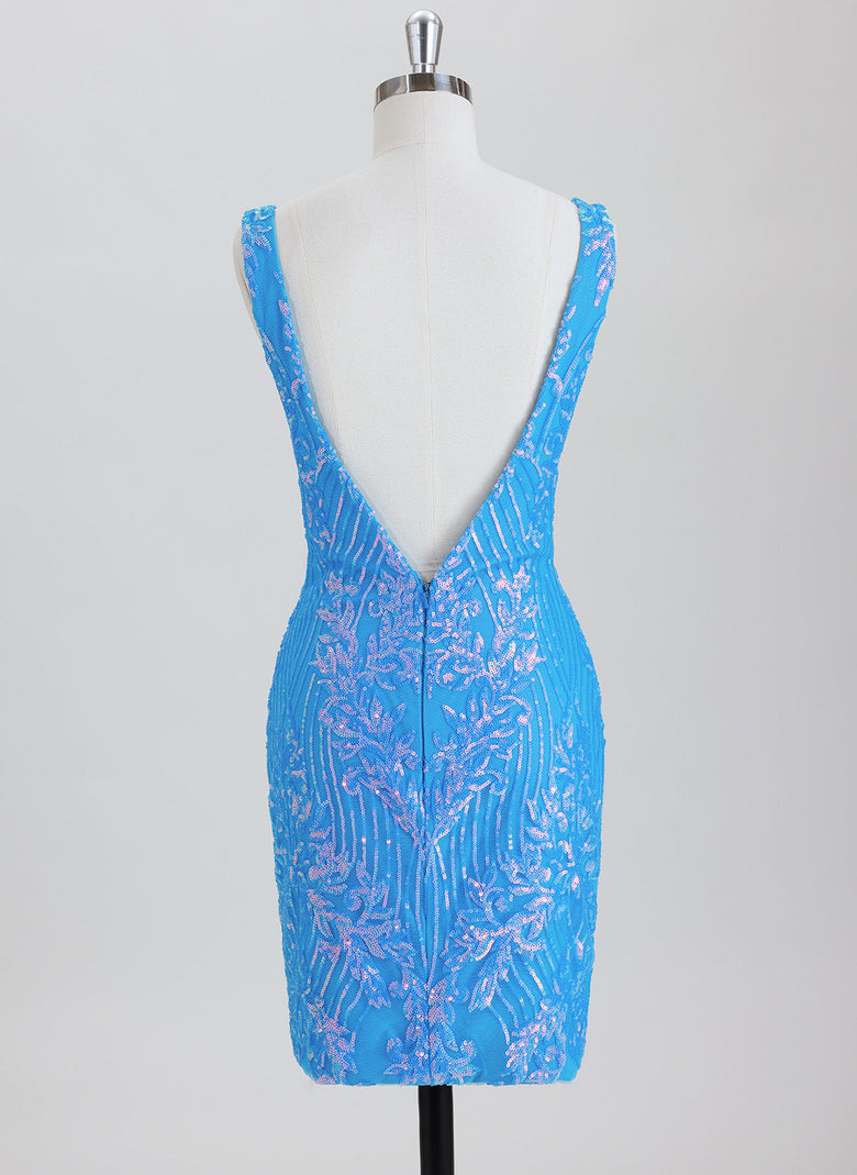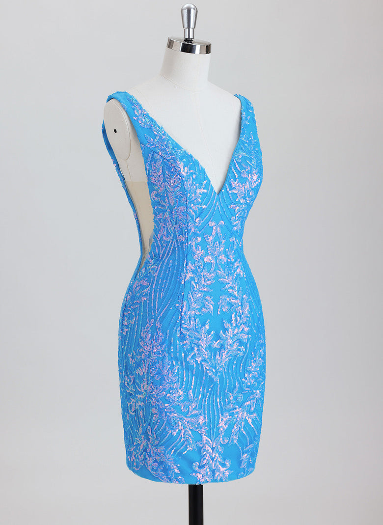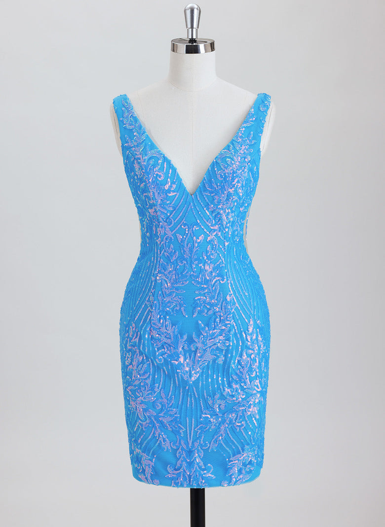 This sheath-style short homecoming dress features a sleek column silhouette enhanced by shimmering sequins for a captivating look. The plunging V-neckline adds a touch of elegance and allure, making it perfect for special occasions. Designed to flatter your figure, this dress combines sophistication with sparkle, ensuring you stand out with confidence at your event.